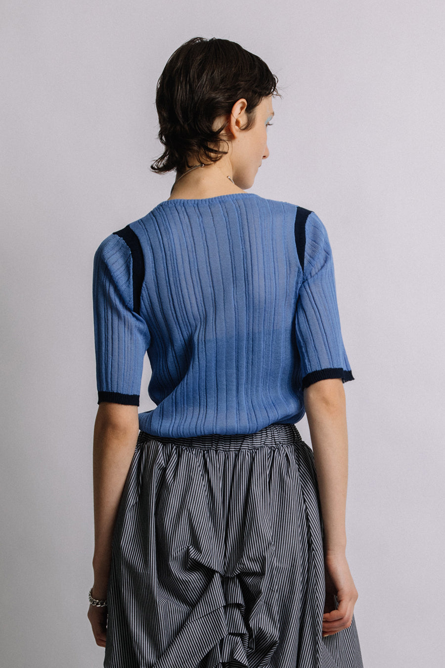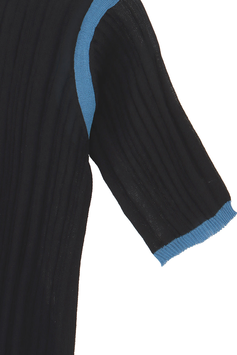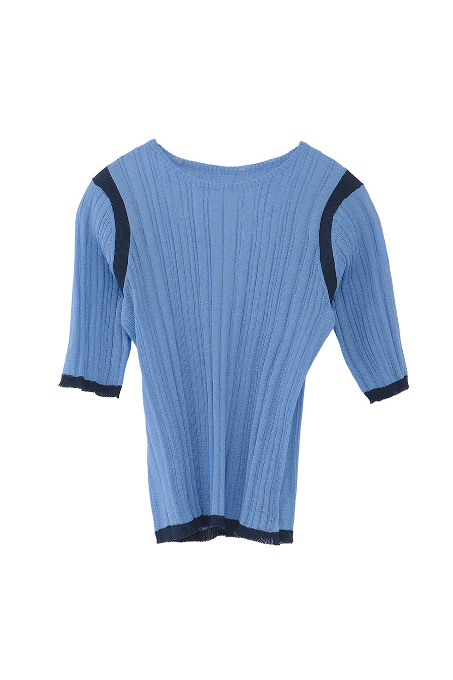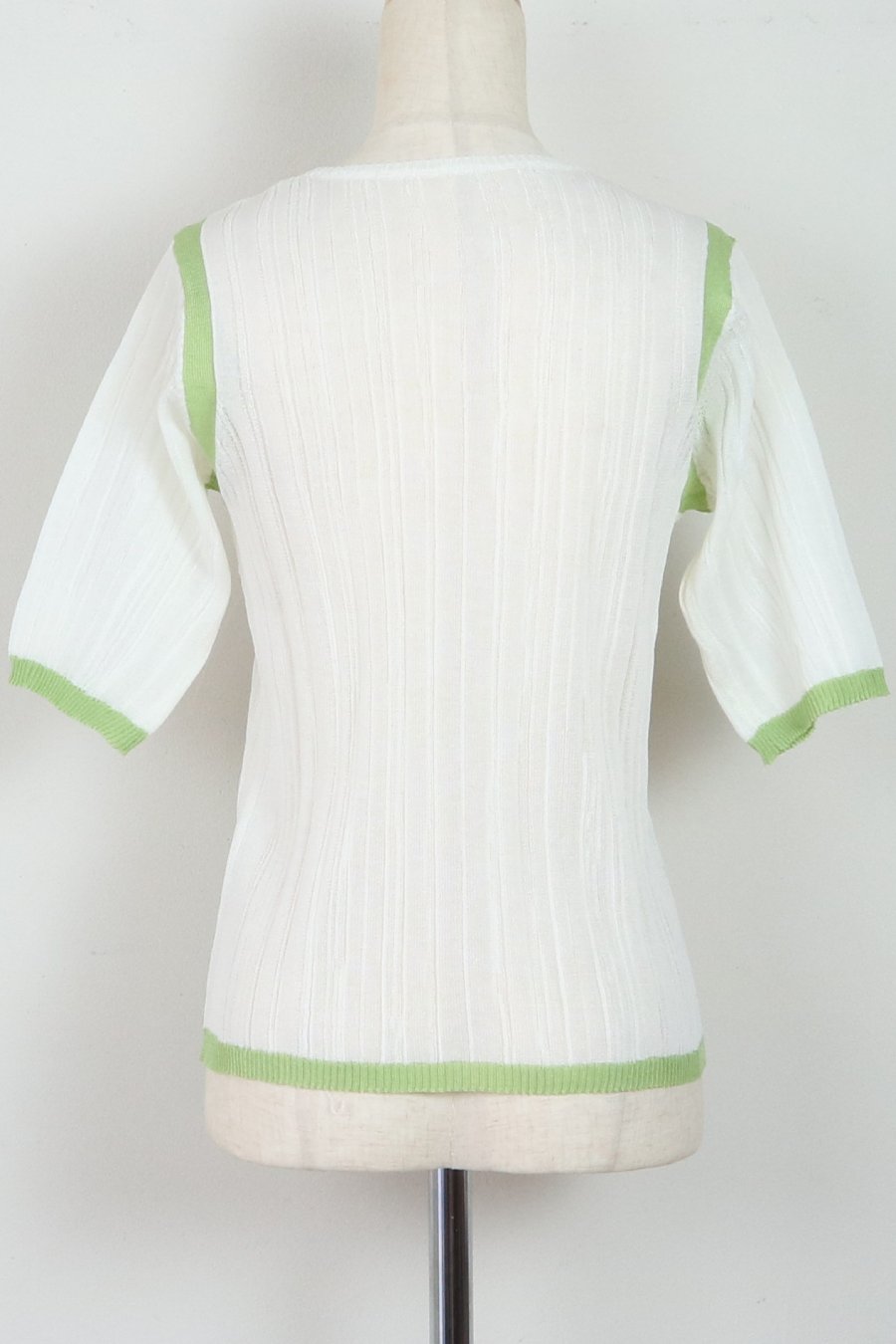 アームホール、袖口と裾の配色ラインがポイントのシアーニット。