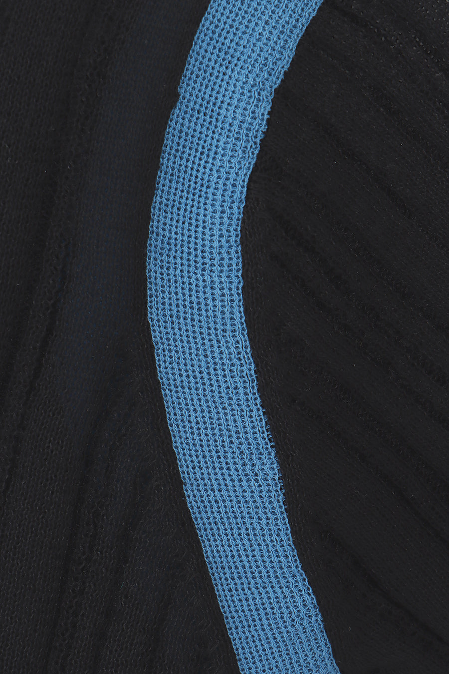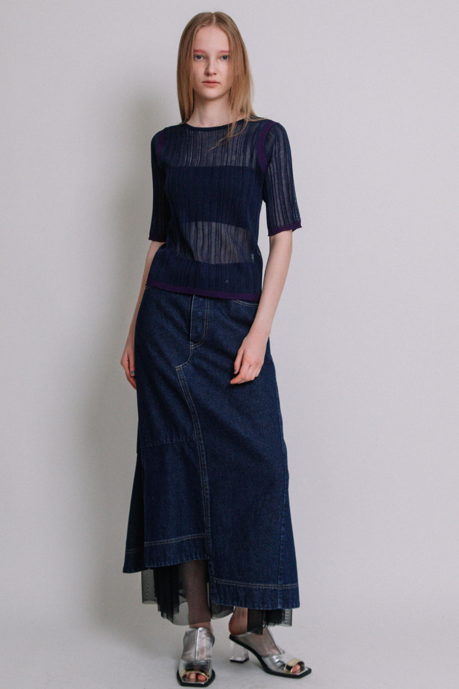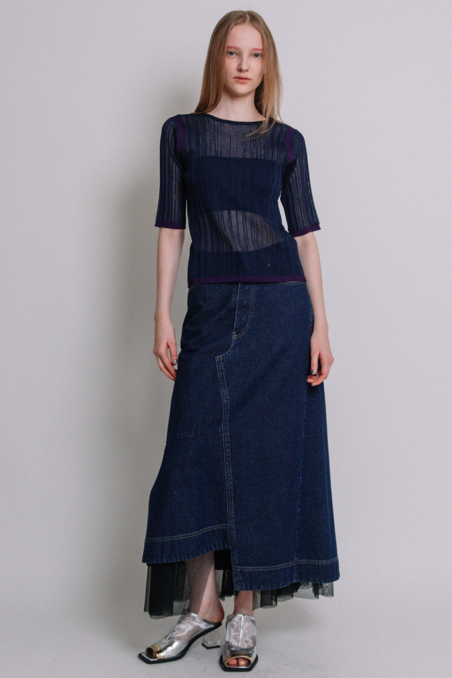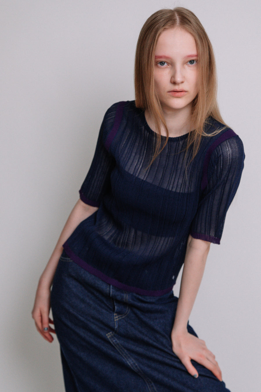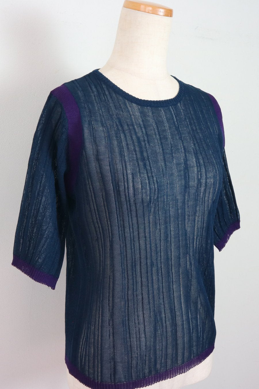 アームホール、袖口と裾の配色ラインがポイントのシアーニット。