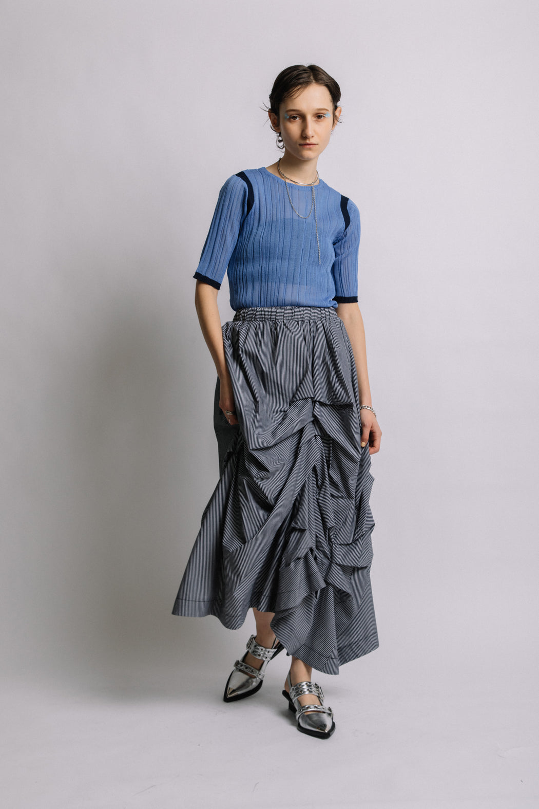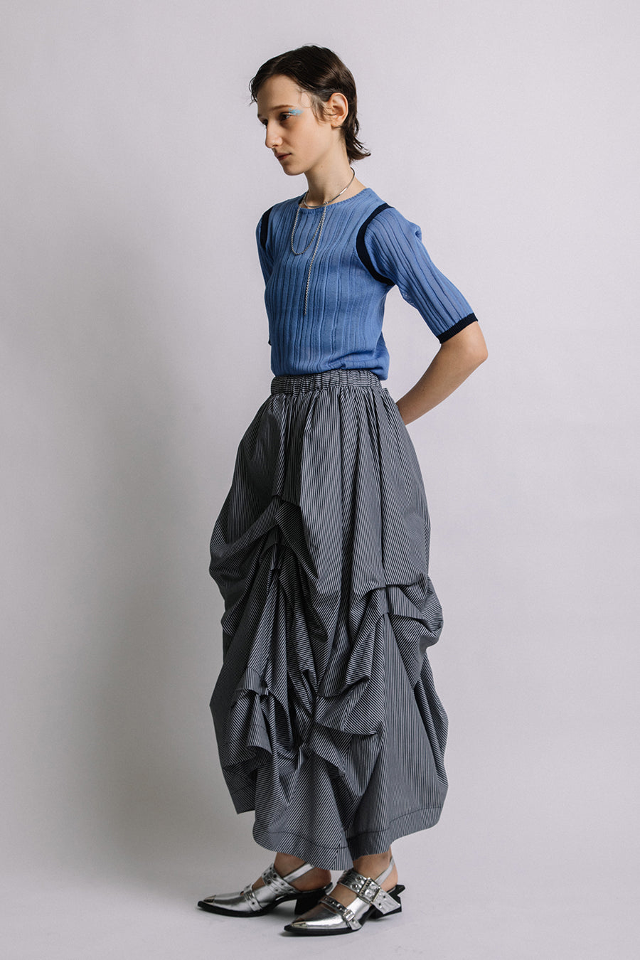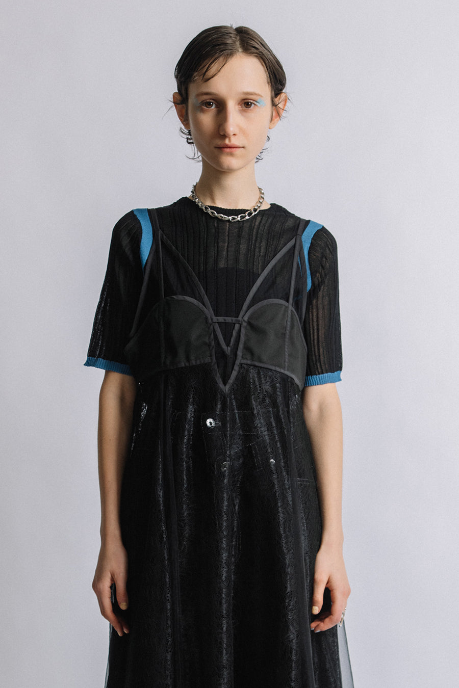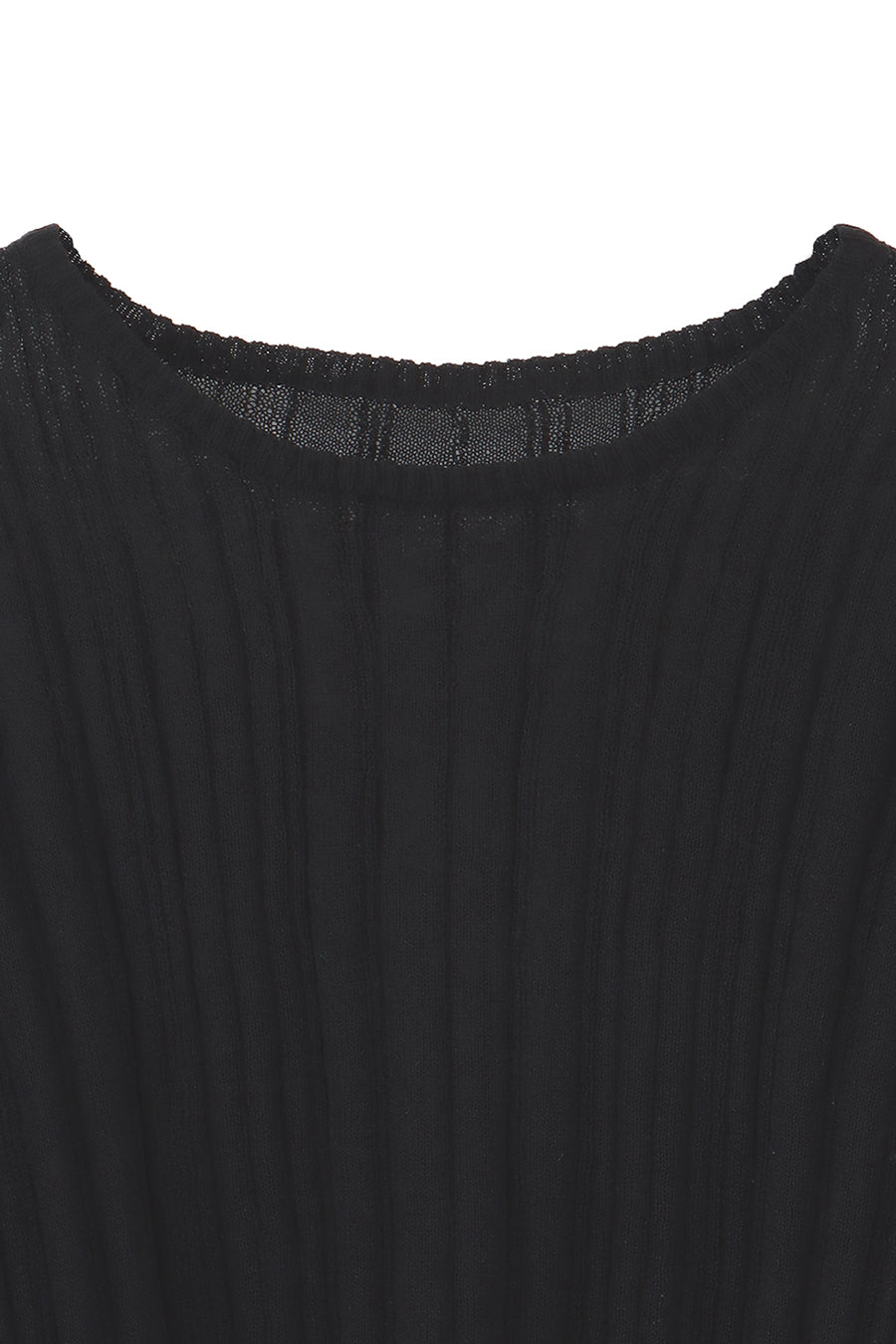 ドライタッチなコットンポリエステルの細番手糸を甘くランダムなリブ編みにし、シアー感が涼し気で、シンプルで合わせやすいので、夏のレイヤードスタイルにお勧めのアイテム。