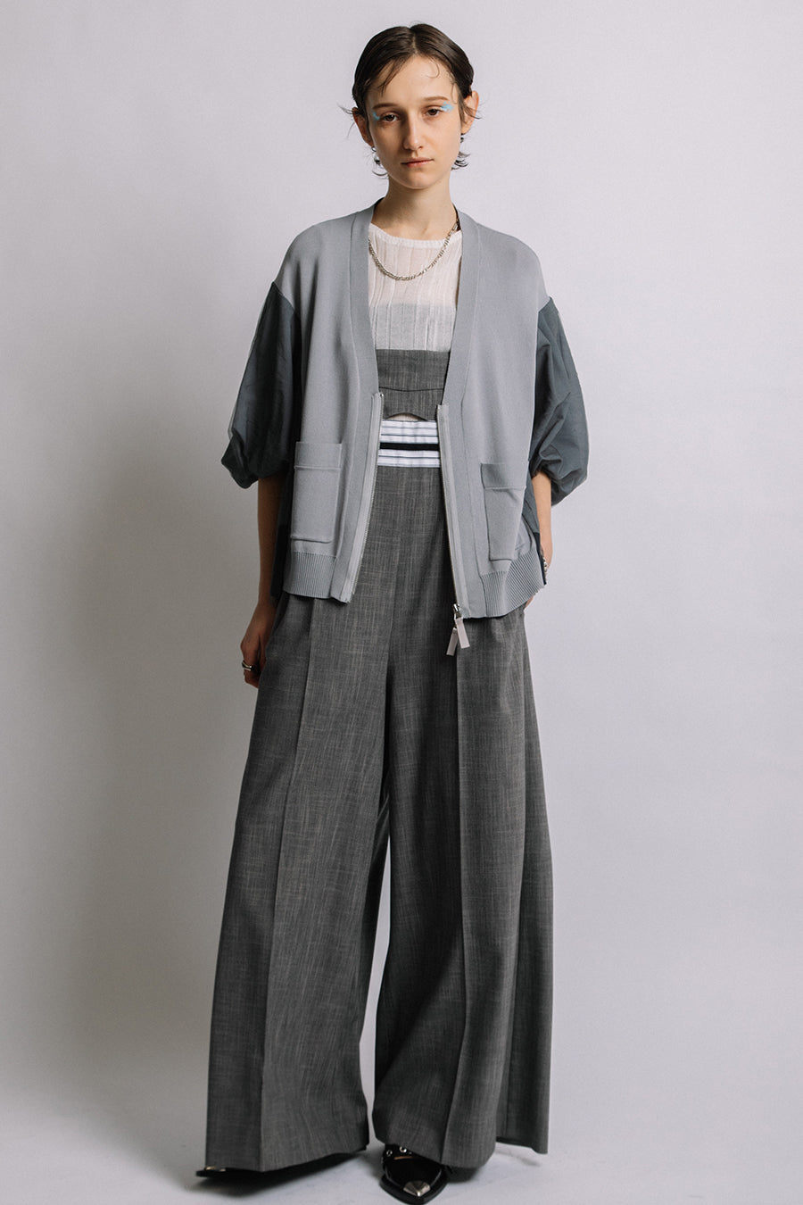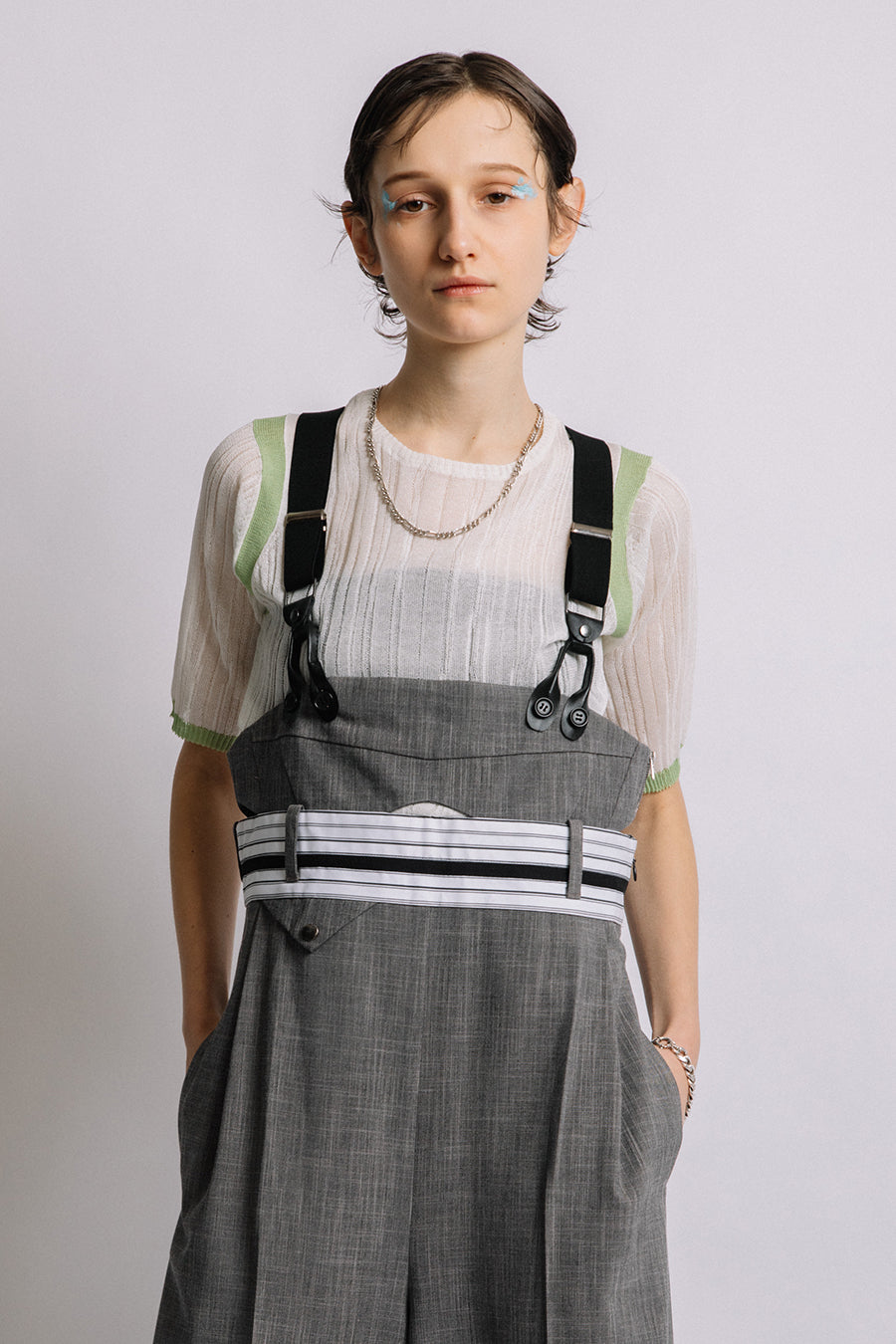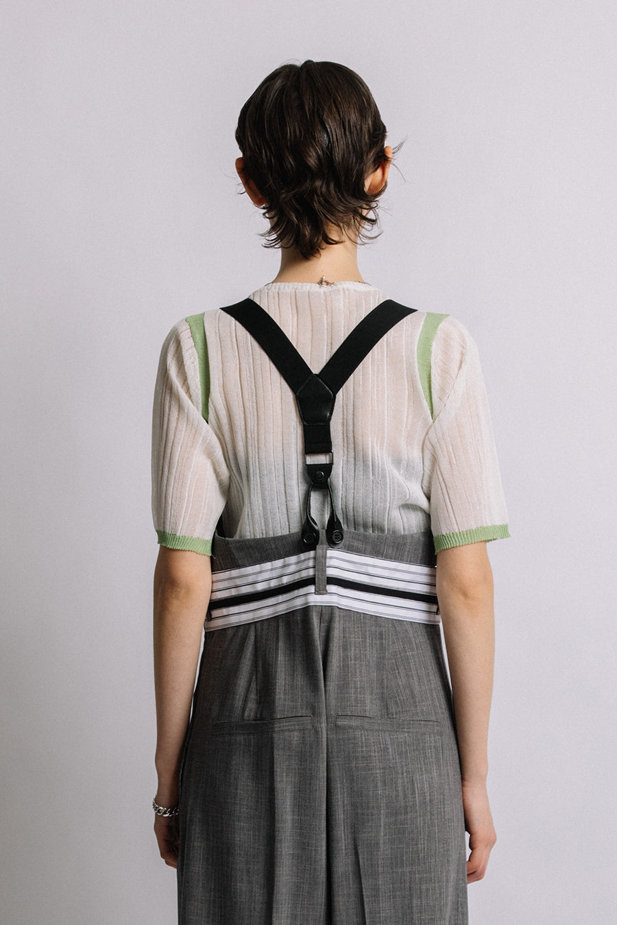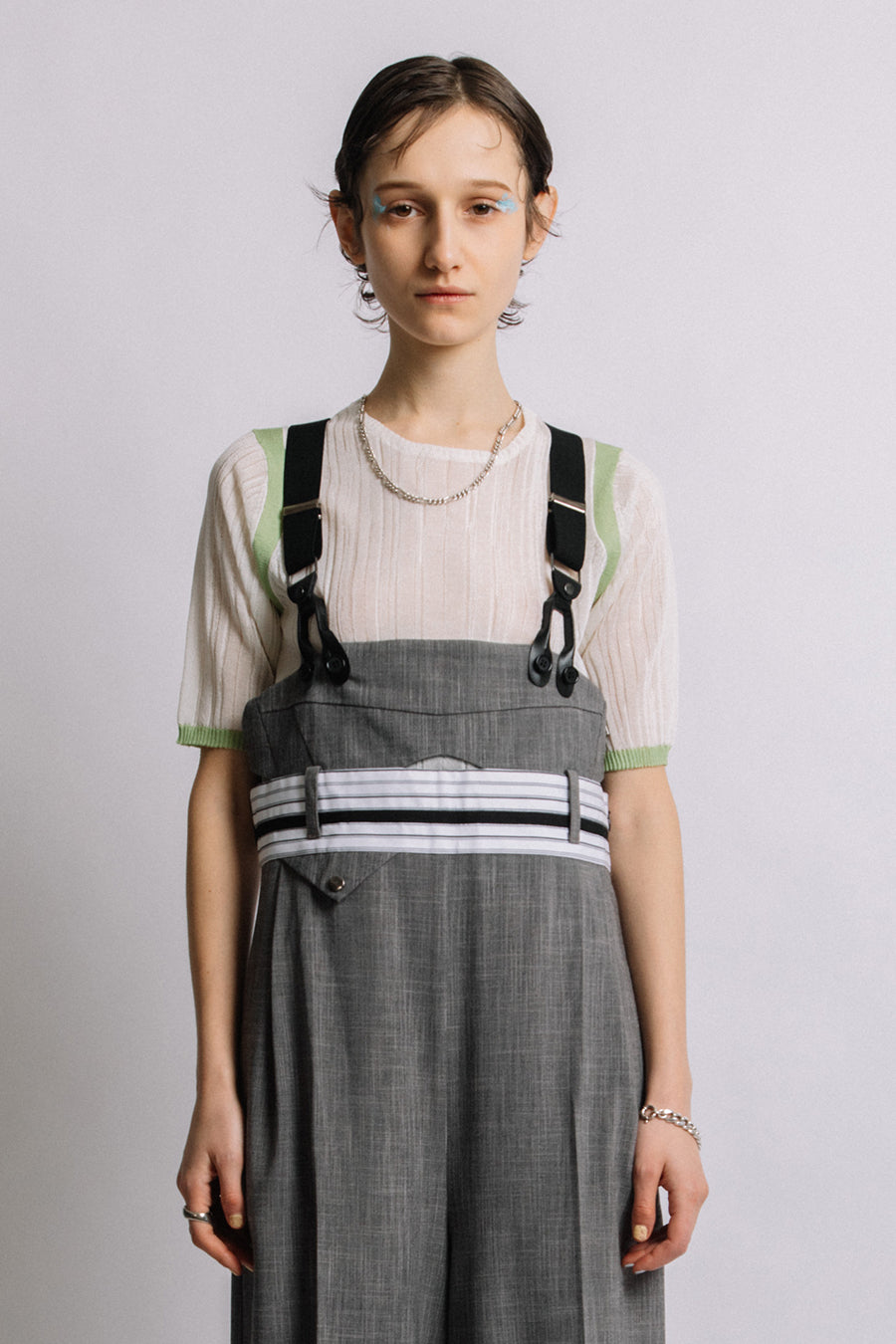 ドライタッチなコットンポリエステルの細番手糸を甘くランダムなリブ編みにし、シアー感が涼し気で、シンプルで合わせやすいので、夏のレイヤードスタイルにお勧めのアイテム。