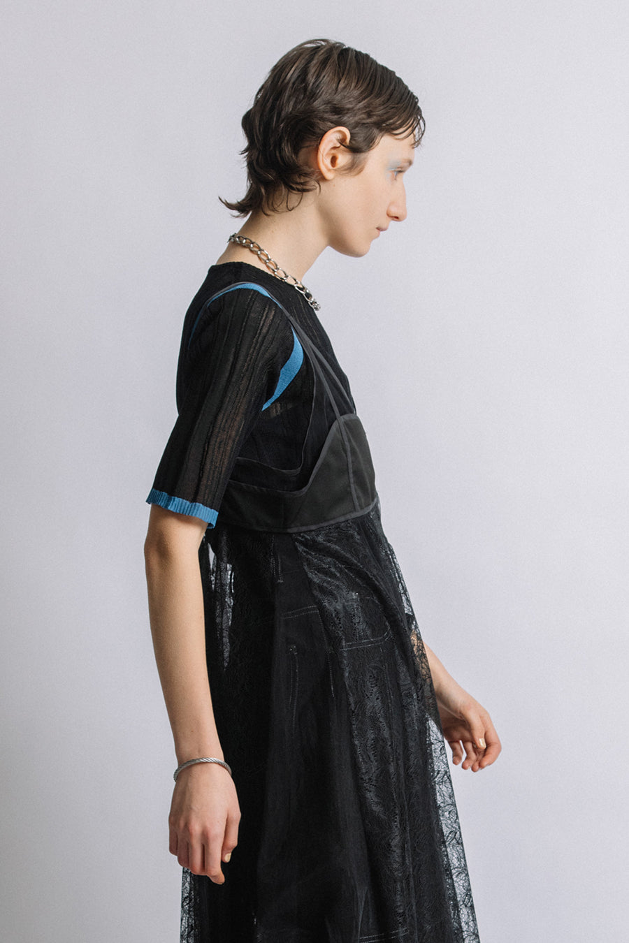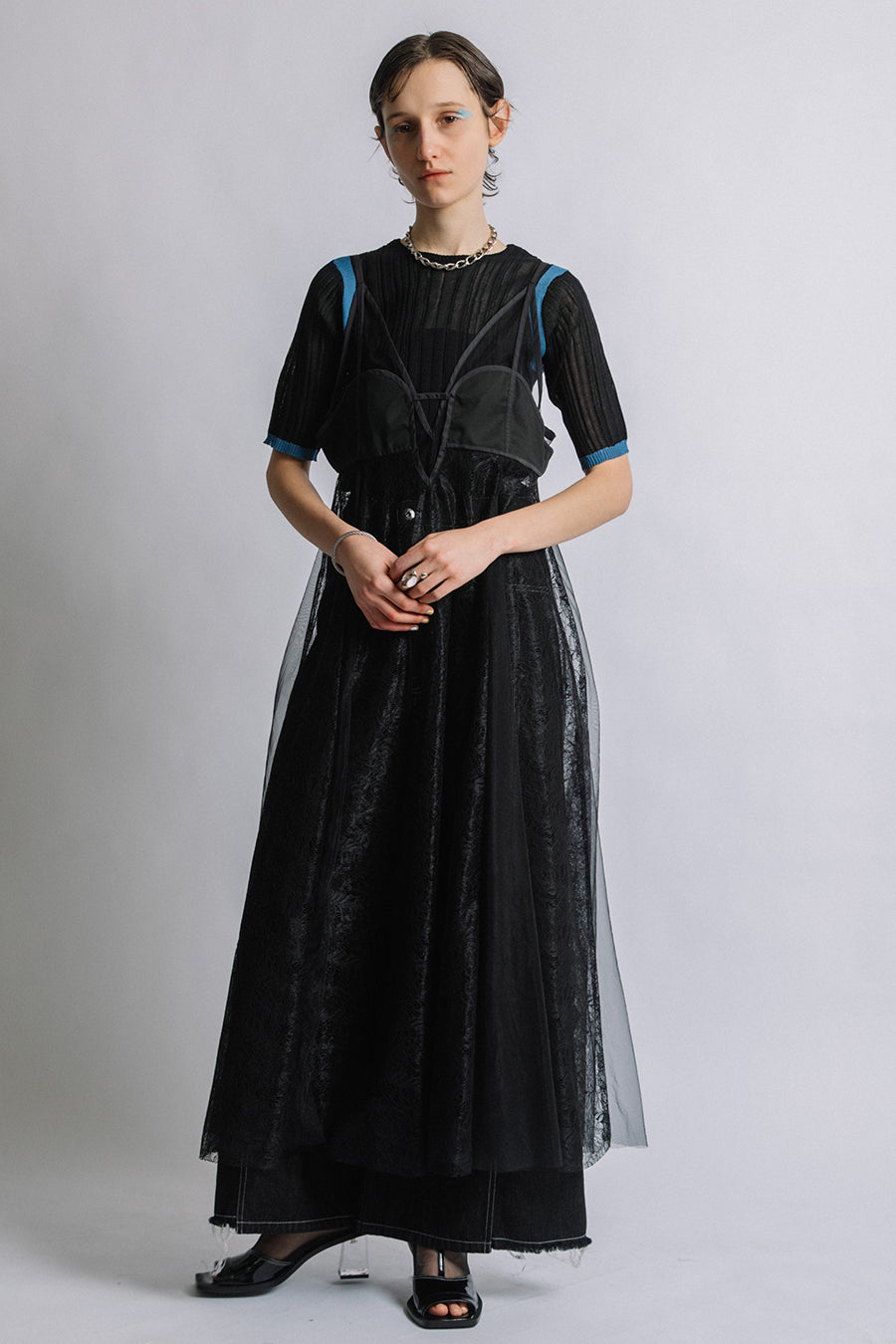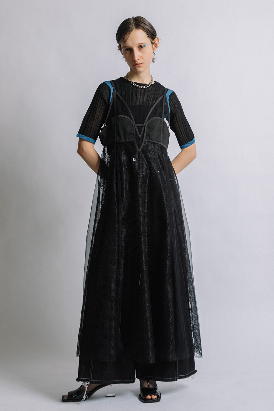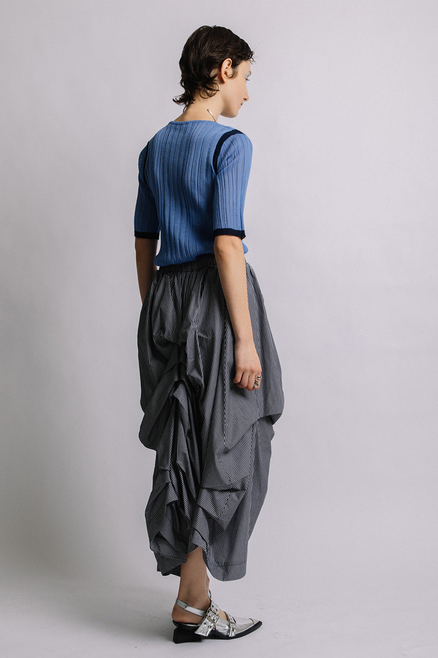 ドライタッチなコットンポリエステルの細番手糸を甘くランダムなリブ編みにし、シアー感が涼し気で、シンプルで合わせやすいので、夏のレイヤードスタイルにお勧めのアイテム。