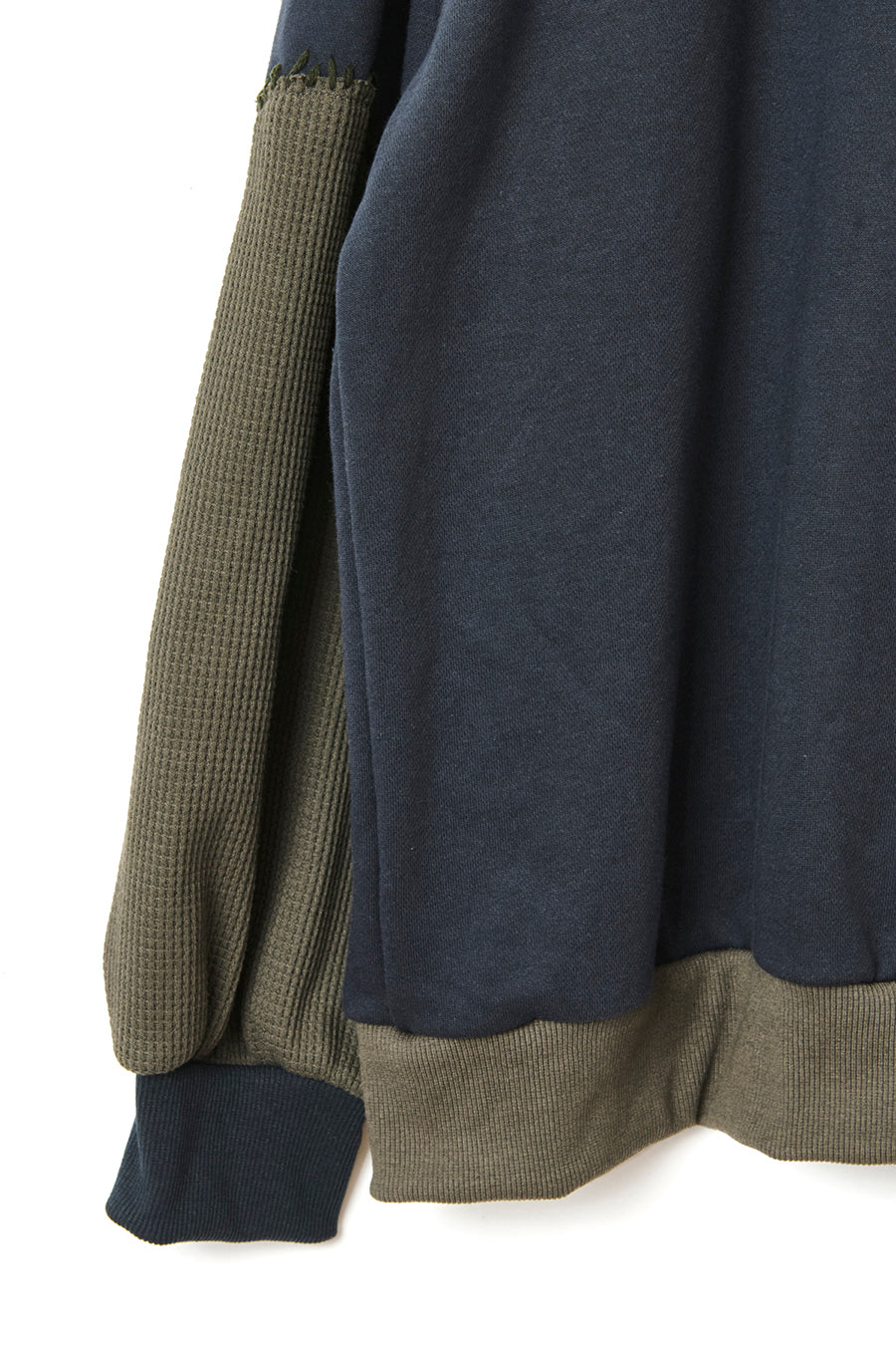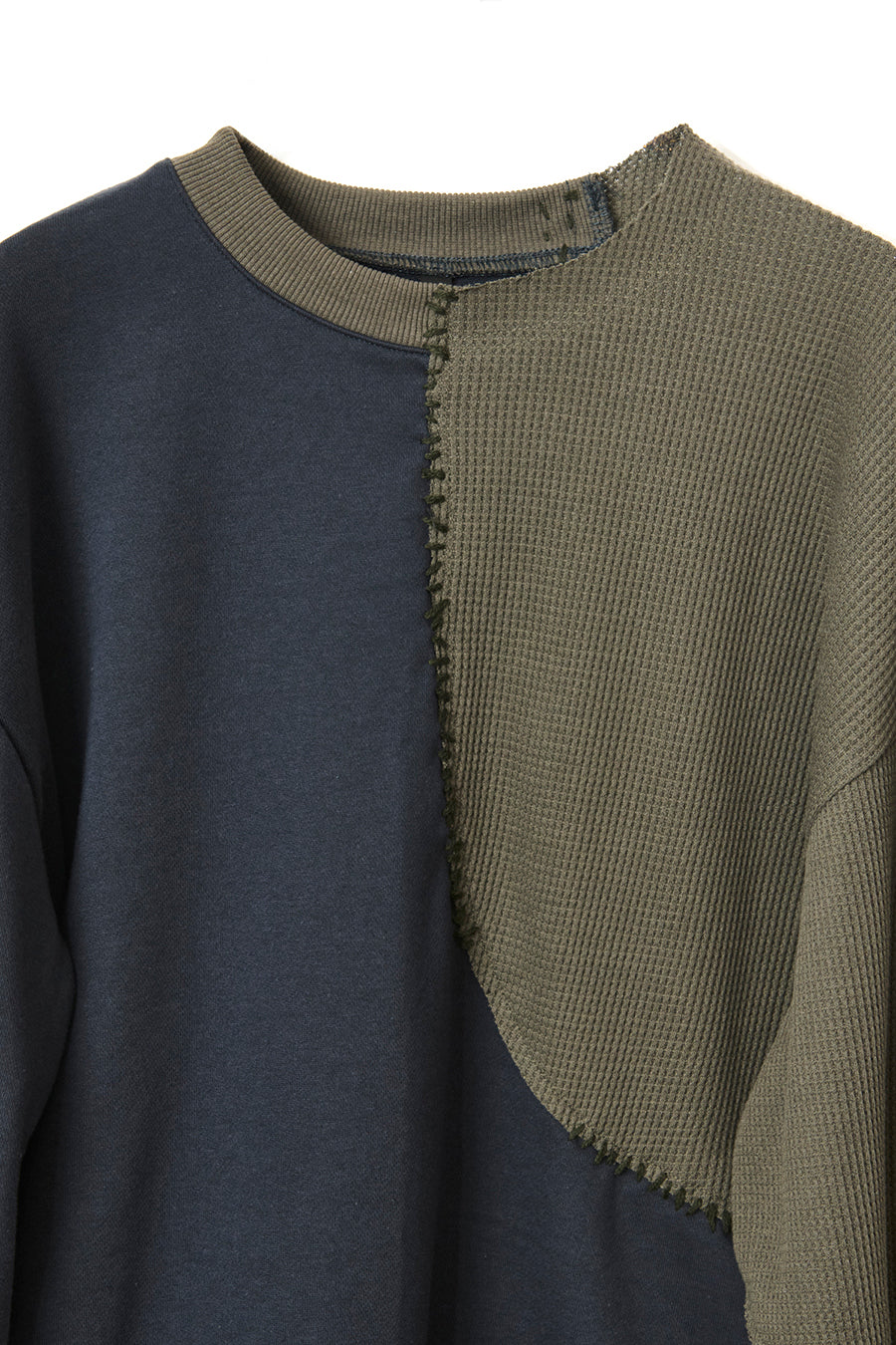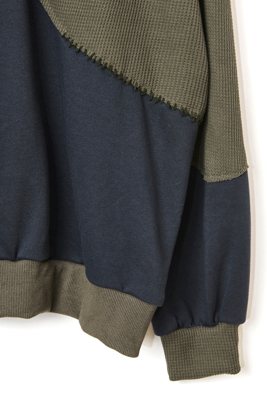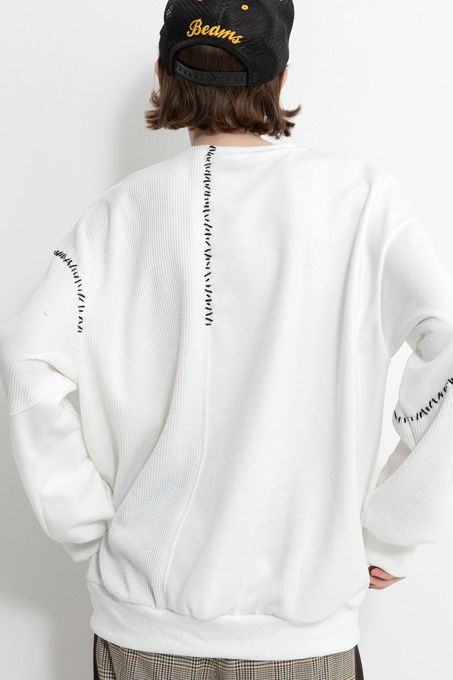 凹凸感のあるワッフルと裏毛の異素材を切り替えた、表情のあるオーバーサイズプルオーバー。程よい凹凸感のあるワッフル生地と柔らかな裏毛素材を組み合わせ、シンプルながらも奥行きのあるデザイン。切り替え部分に施した配色ステッチもさりげないアクセントに。ホワイトとブラックはクリーンな印象、カーキ×ネイビーの配色はコントラストを楽しめるカラー配色。ゆったりとしたサイズ感で、抜け感もあり、ボトムスを選ばす着用できるのもうれしいポイント。