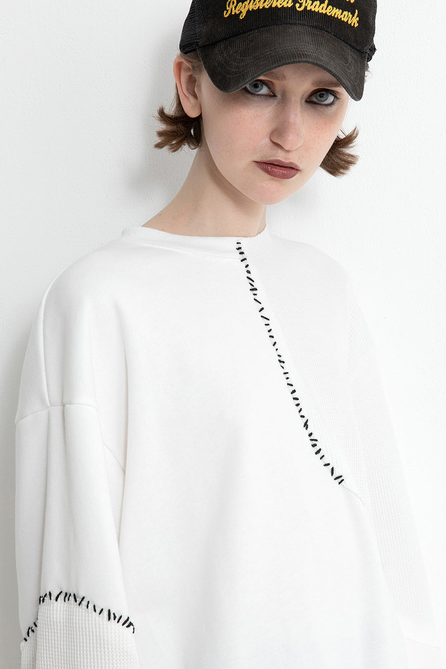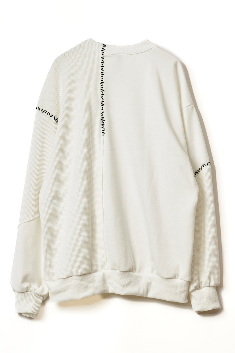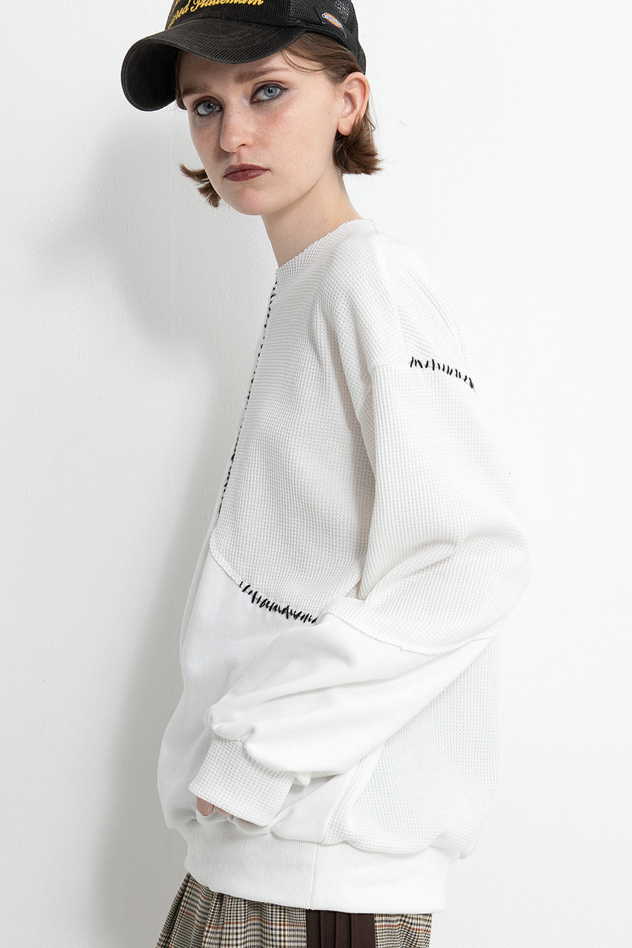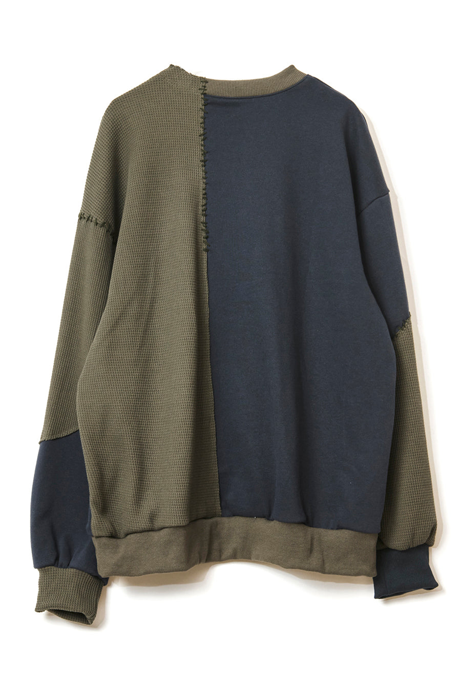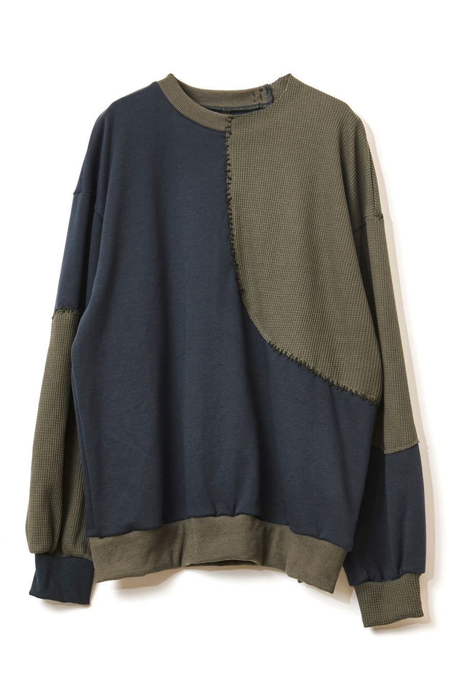 凹凸感のあるワッフルと裏毛の異素材を切り替えた、表情のあるオーバーサイズプルオーバー。程よい凹凸感のあるワッフル生地と柔らかな裏毛素材を組み合わせ、シンプルながらも奥行きのあるデザイン。切り替え部分に施した配色ステッチもさりげないアクセントに。ホワイトとブラックはクリーンな印象、カーキ×ネイビーの配色はコントラストを楽しめるカラー配色。ゆったりとしたサイズ感で、抜け感もあり、ボトムスを選ばす着用できるのもうれしいポイント。