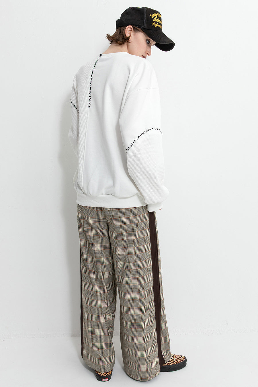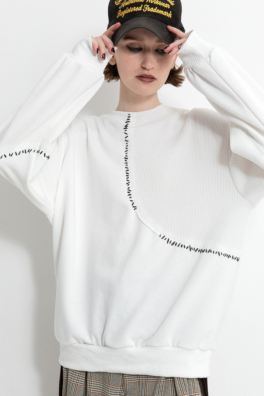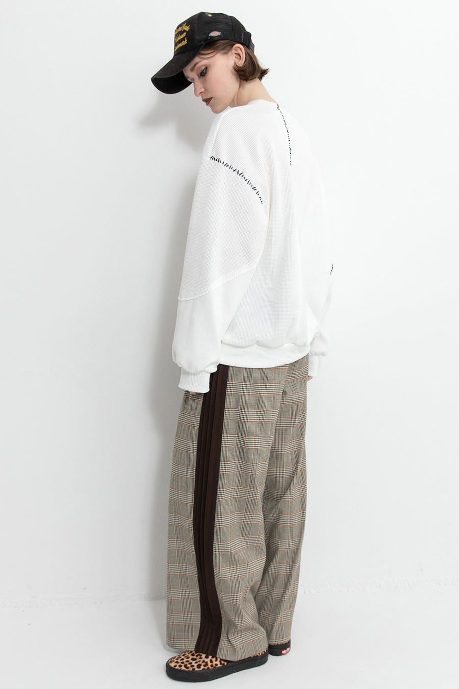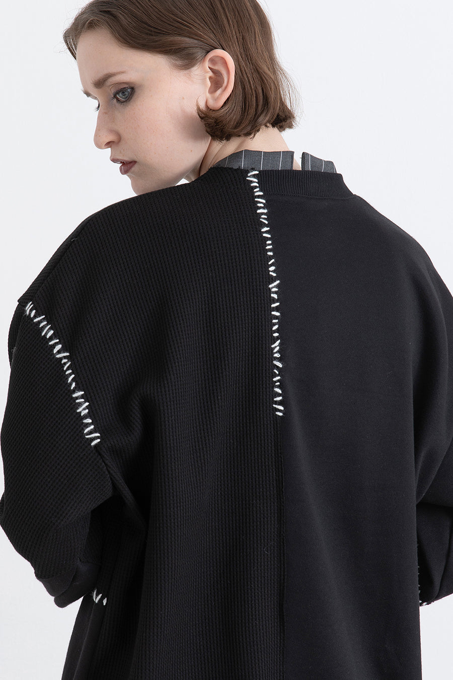 凹凸感のあるワッフルと裏毛の異素材を切り替えた、表情のあるオーバーサイズプルオーバー。程よい凹凸感のあるワッフル生地と柔らかな裏毛素材を組み合わせ、シンプルながらも奥行きのあるデザイン。切り替え部分に施した配色ステッチもさりげないアクセントに。ホワイトとブラックはクリーンな印象、カーキ×ネイビーの配色はコントラストを楽しめるカラー配色。ゆったりとしたサイズ感で、抜け感もあり、ボトムスを選ばす着用できるのもうれしいポイント。