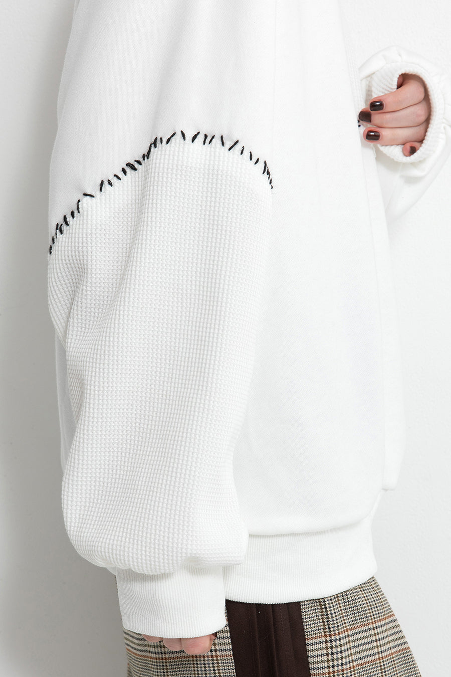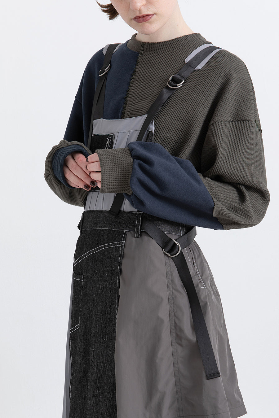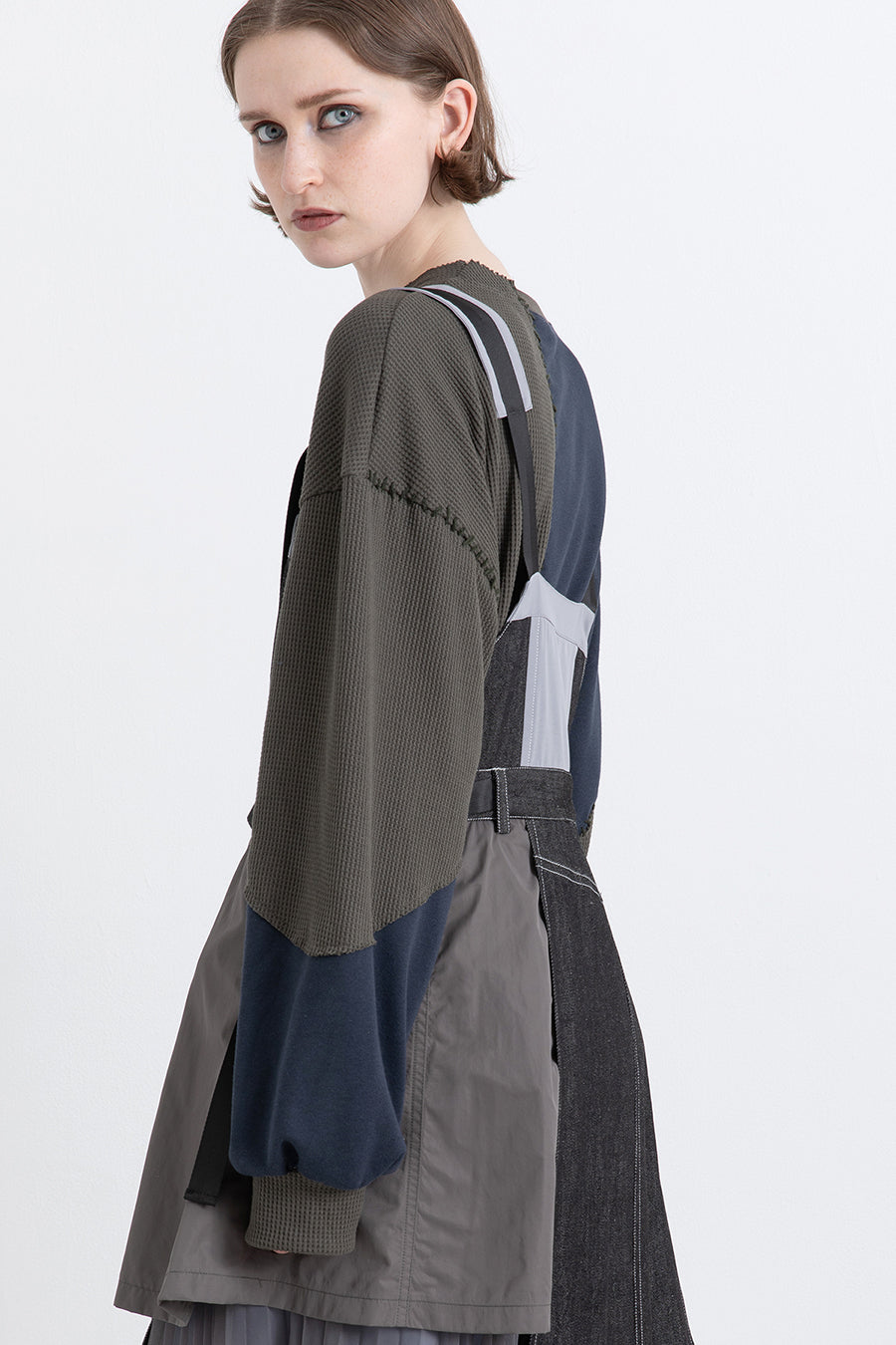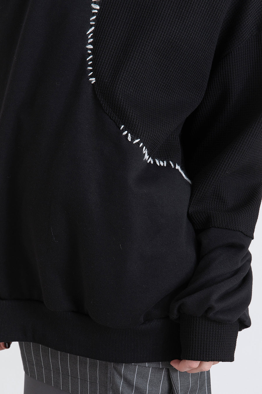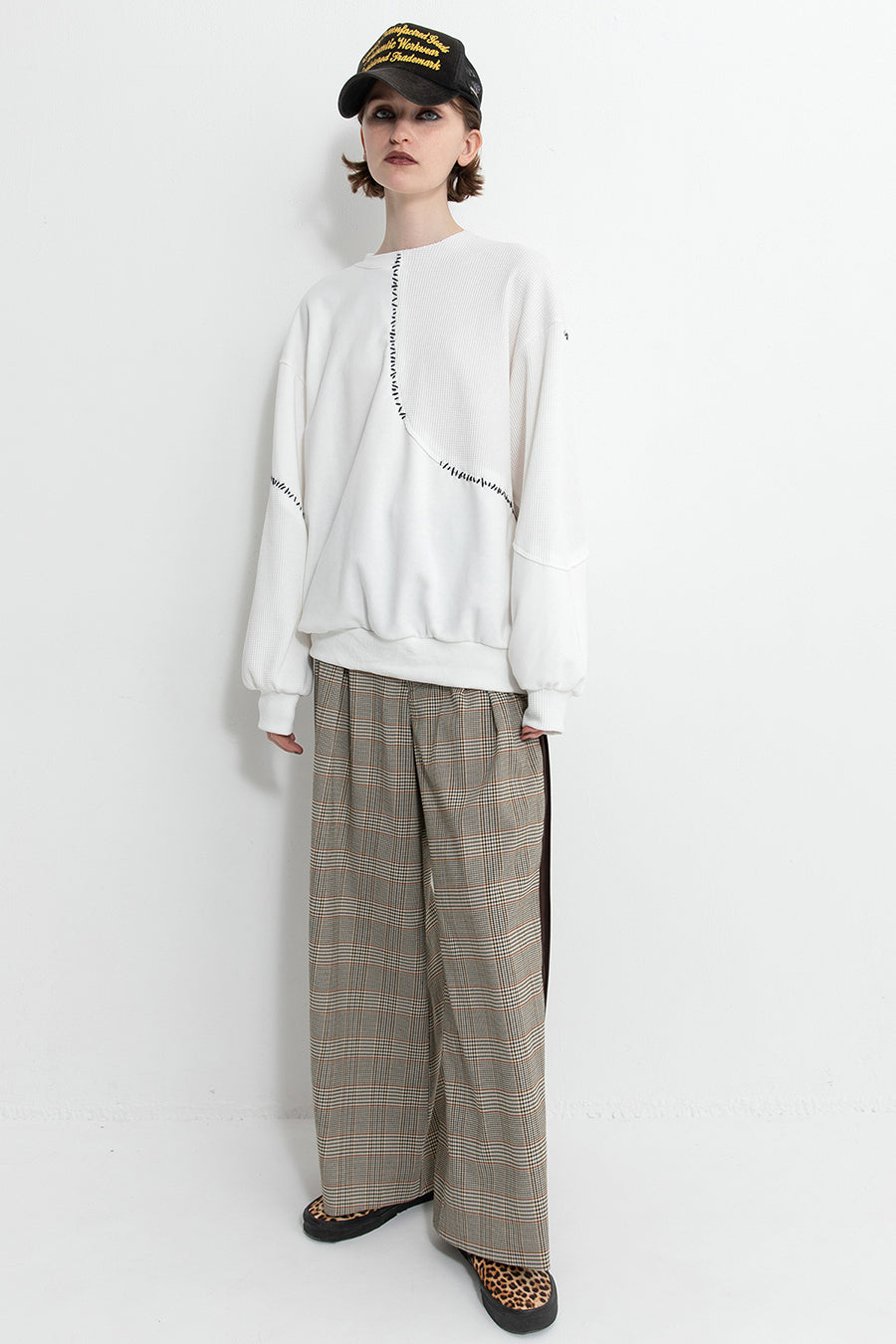 凹凸感のあるワッフルと裏毛の異素材を切り替えた、表情のあるオーバーサイズプルオーバー。程よい凹凸感のあるワッフル生地と柔らかな裏毛素材を組み合わせ、シンプルながらも奥行きのあるデザイン。切り替え部分に施した配色ステッチもさりげないアクセントに。ホワイトとブラックはクリーンな印象、カーキ×ネイビーの配色はコントラストを楽しめるカラー配色。ゆったりとしたサイズ感で、抜け感もあり、ボトムスを選ばす着用できるのもうれしいポイント。