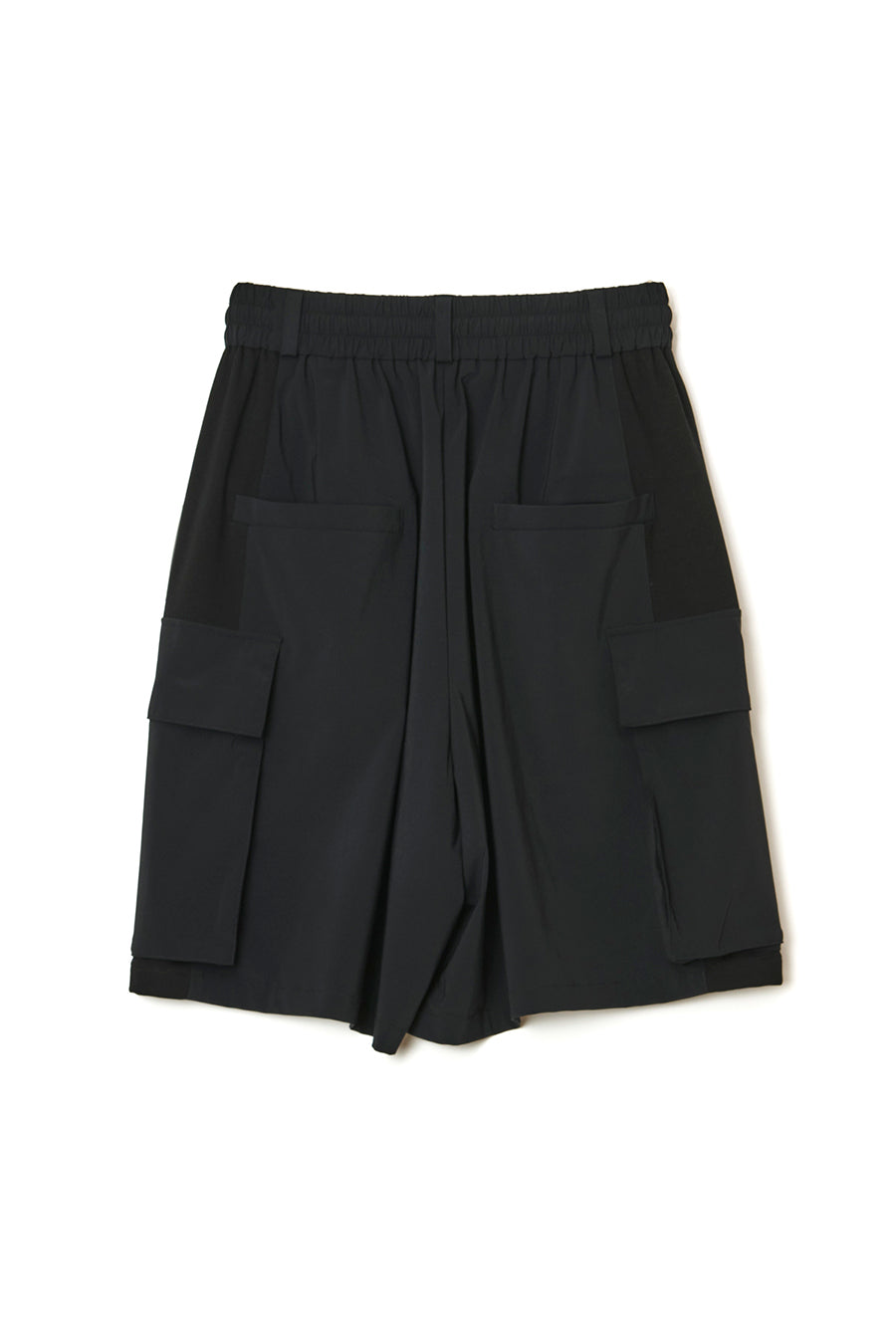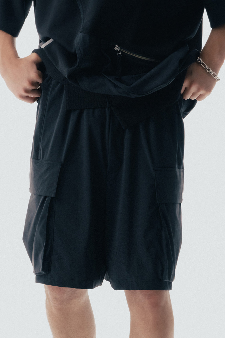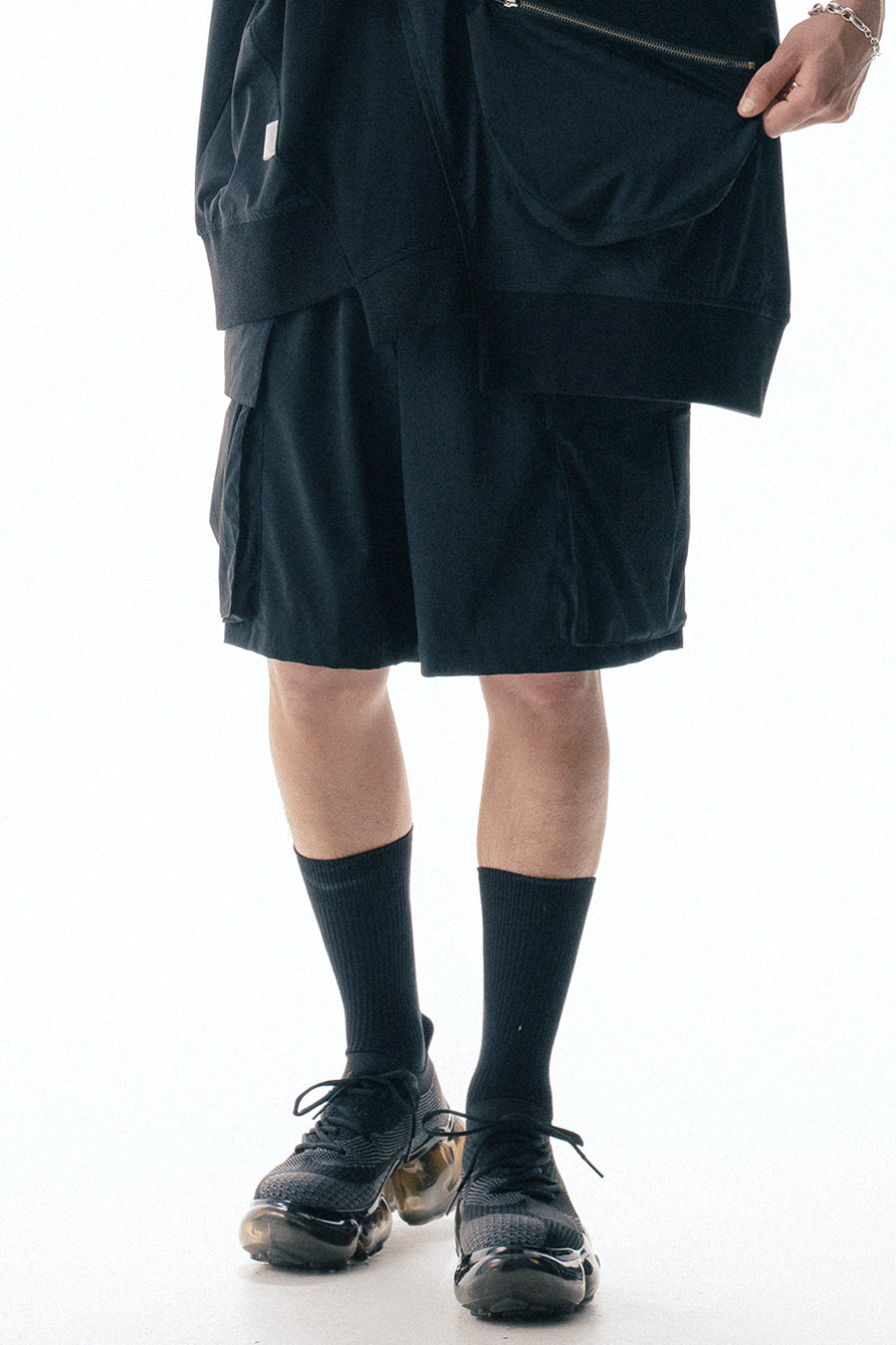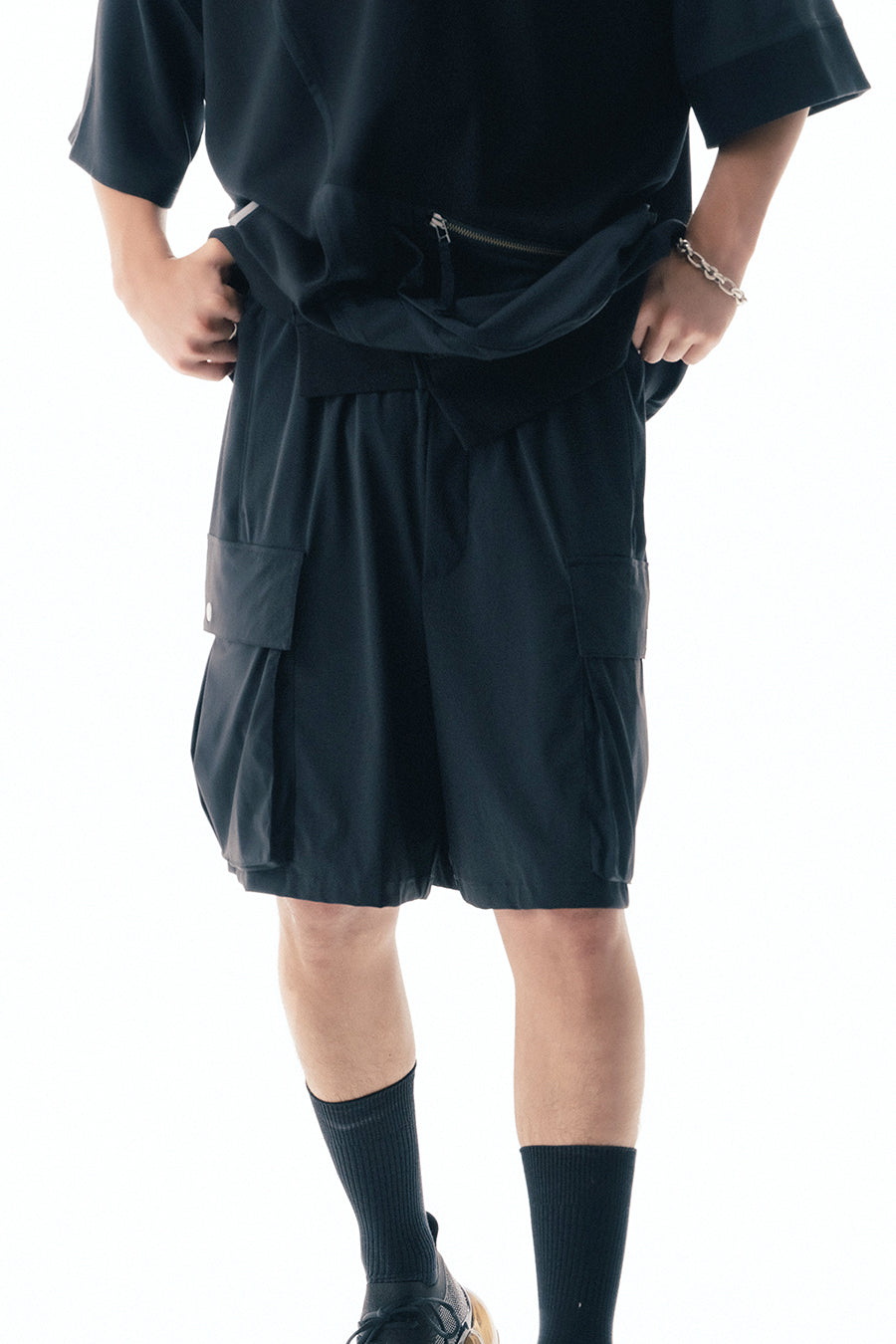 シンプルながらも洗練された印象を与える、都会のストリートに馴染むハーフパンツ。ストレッチ性に優れたナイロン素材とカットソーの絶妙な切り替えが特徴。どんなコーディネートにも合わせやすくデイリーユースに最適。2サイズ展開で、フィット感も調整可能。