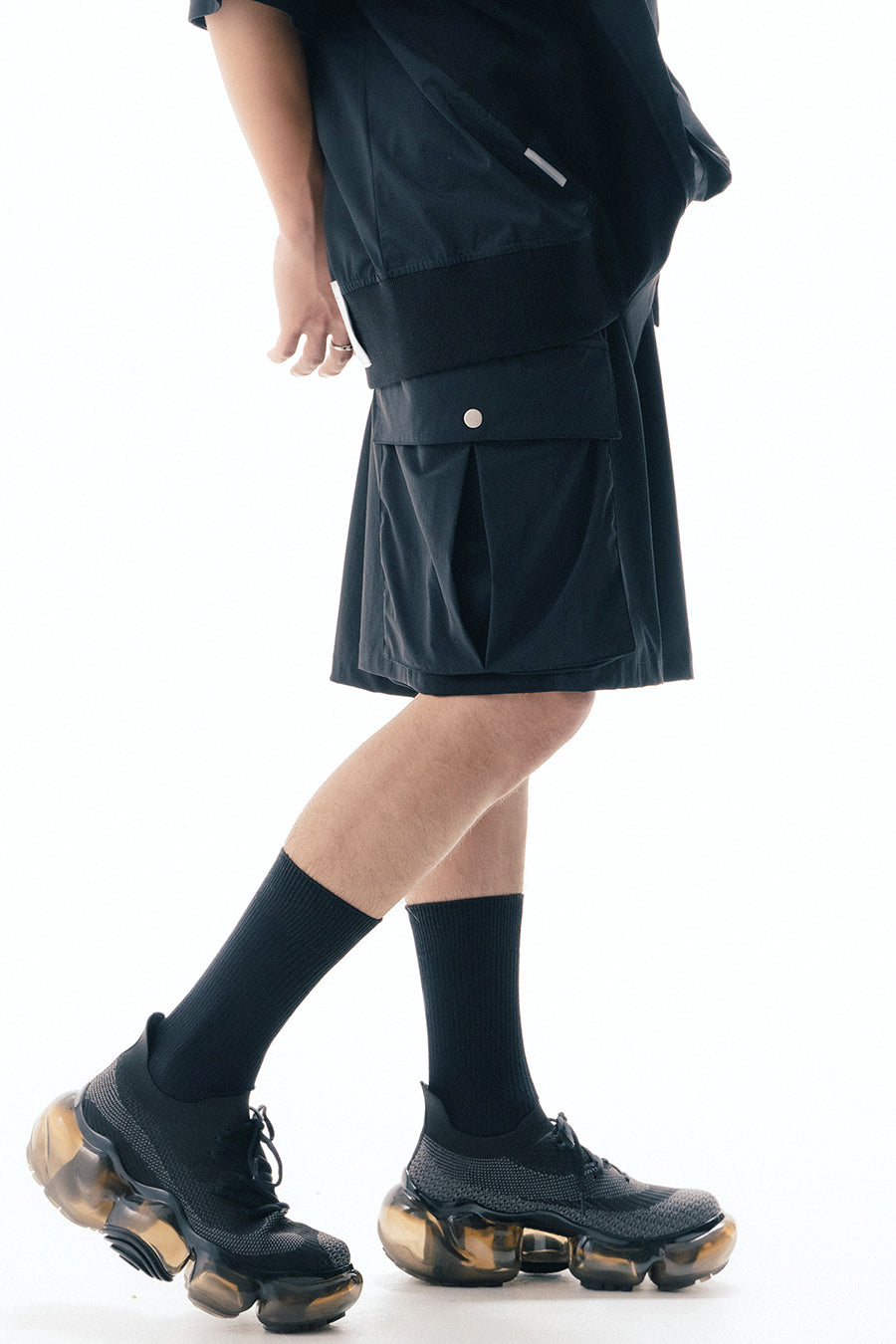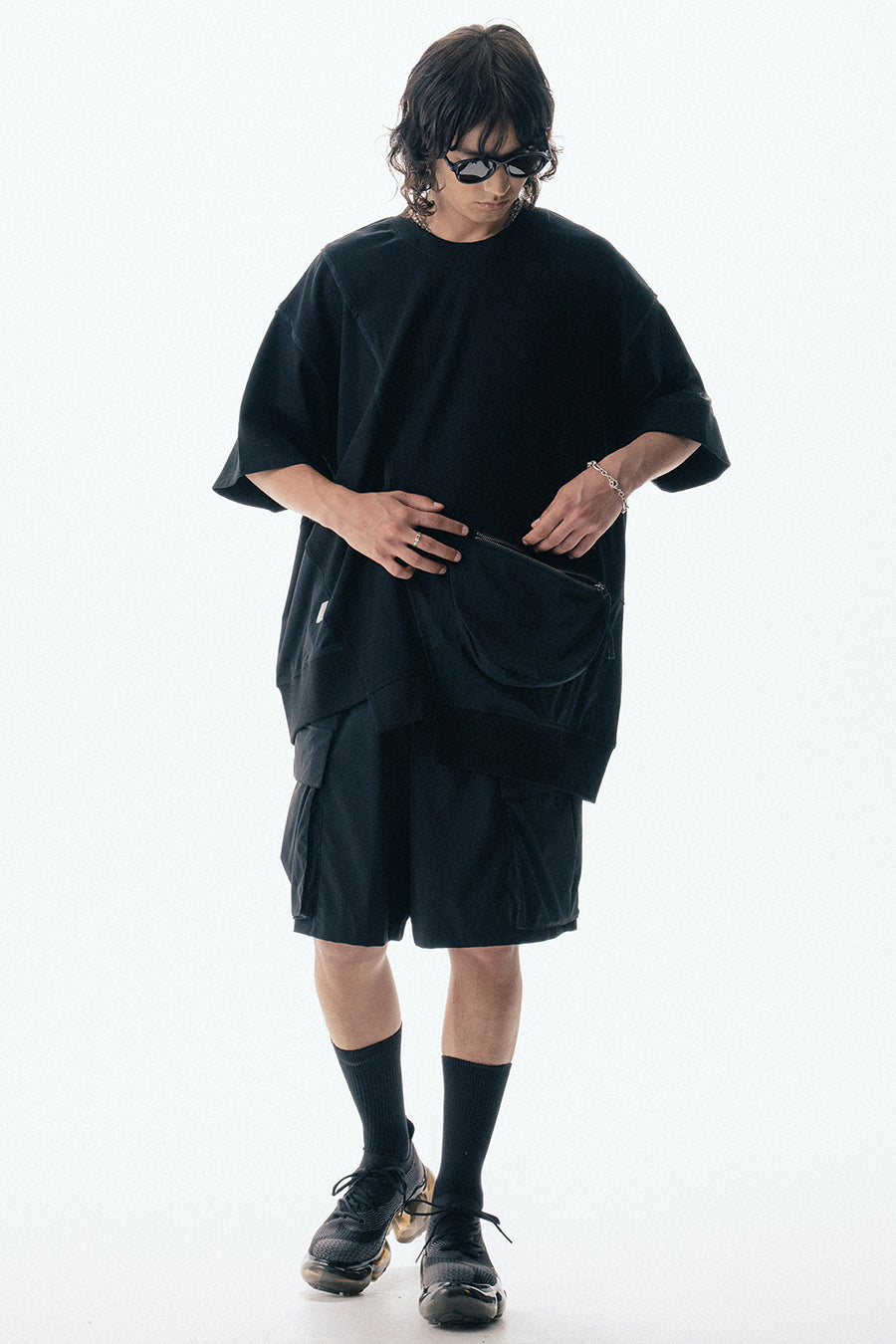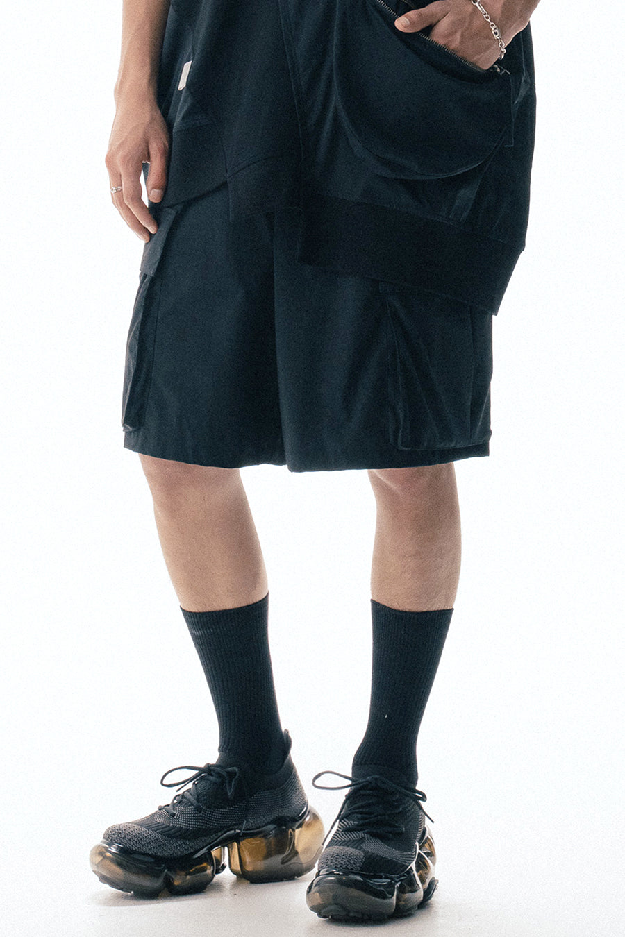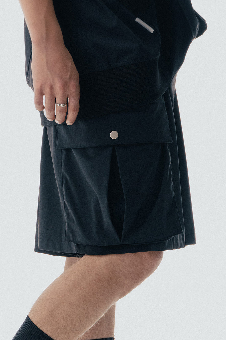 シンプルながらも洗練された印象を与える、都会のストリートに馴染むハーフパンツ。ストレッチ性に優れたナイロン素材とカットソーの絶妙な切り替えが特徴。どんなコーディネートにも合わせやすくデイリーユースに最適。2サイズ展開で、フィット感も調整可能。