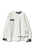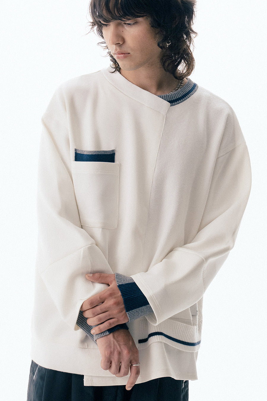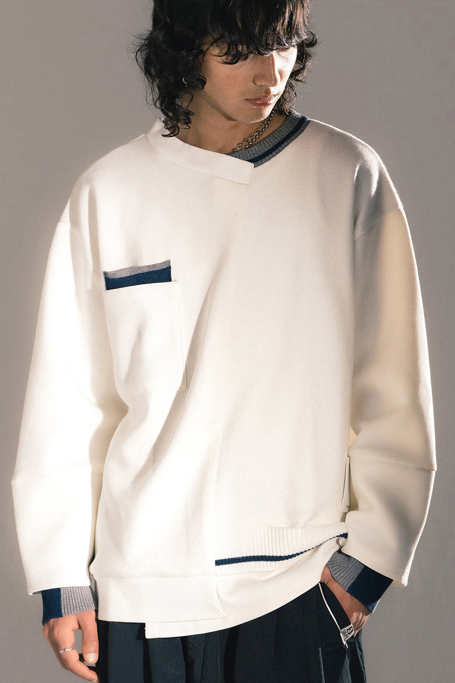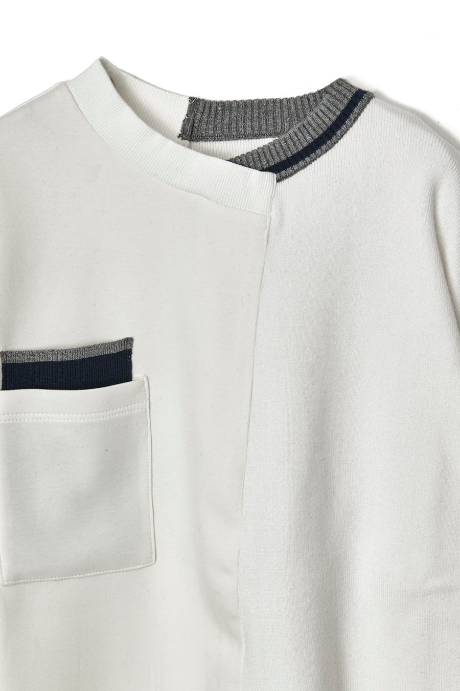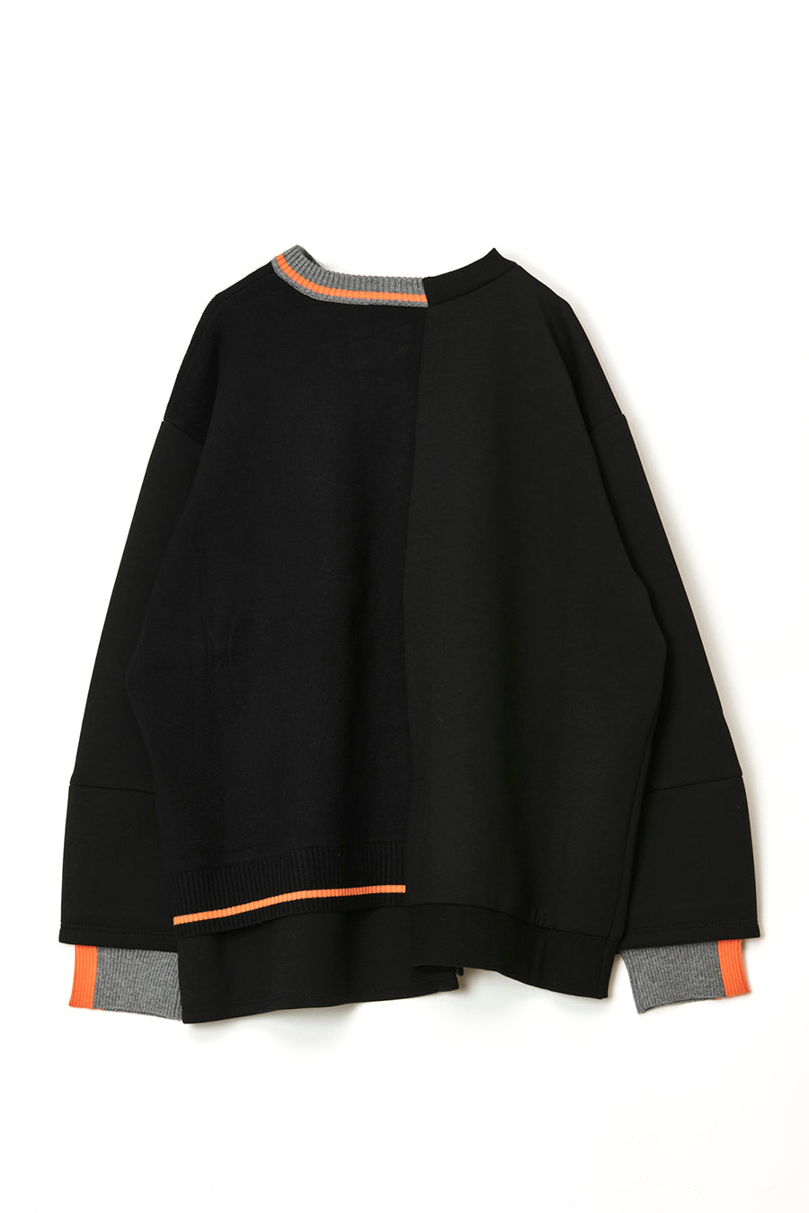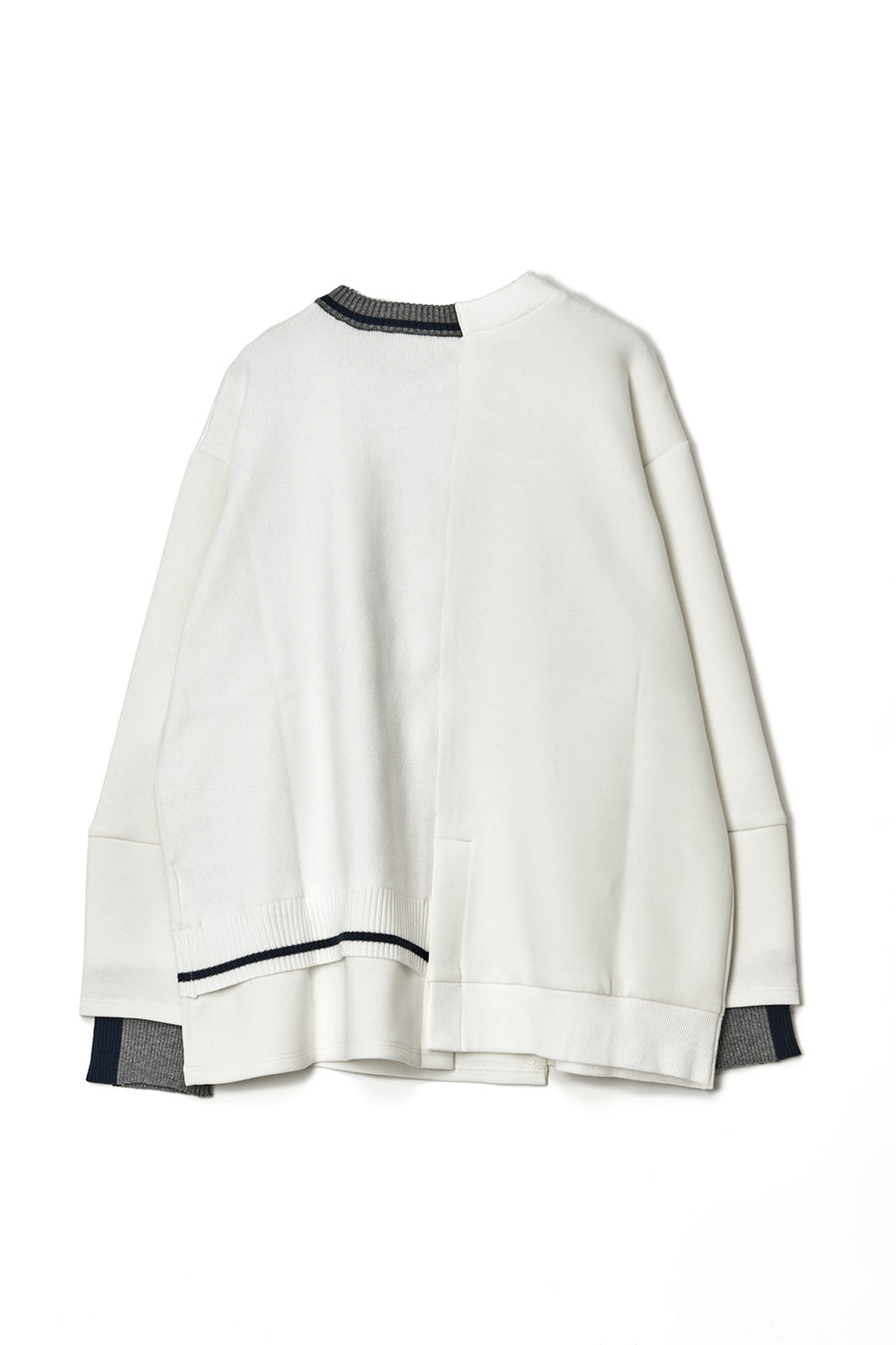ニットとダンボールカットソーを左右で切り替えた、アシンメトリーデザインのプルオーバー。裾のレイヤード風ディテールや、後ろのスリットが抜け感をプラス。袖は丸みのあるカーブラインで、袖口からリブニットが覗く立体的な仕上がりに。配色の襟リブや胸ポケットもアクセント。