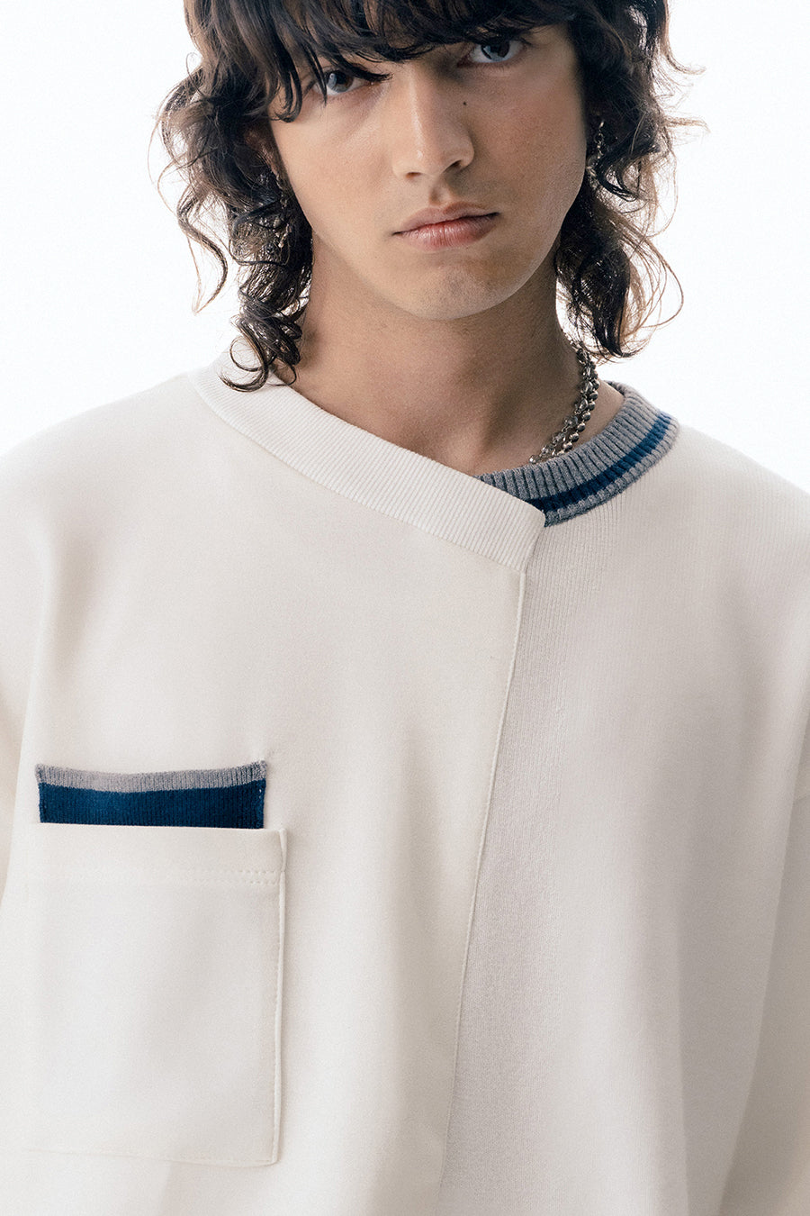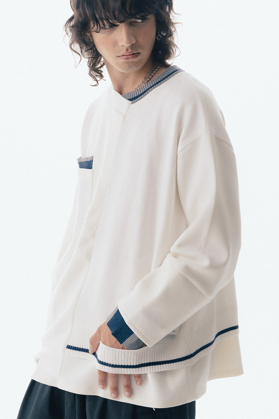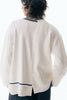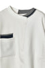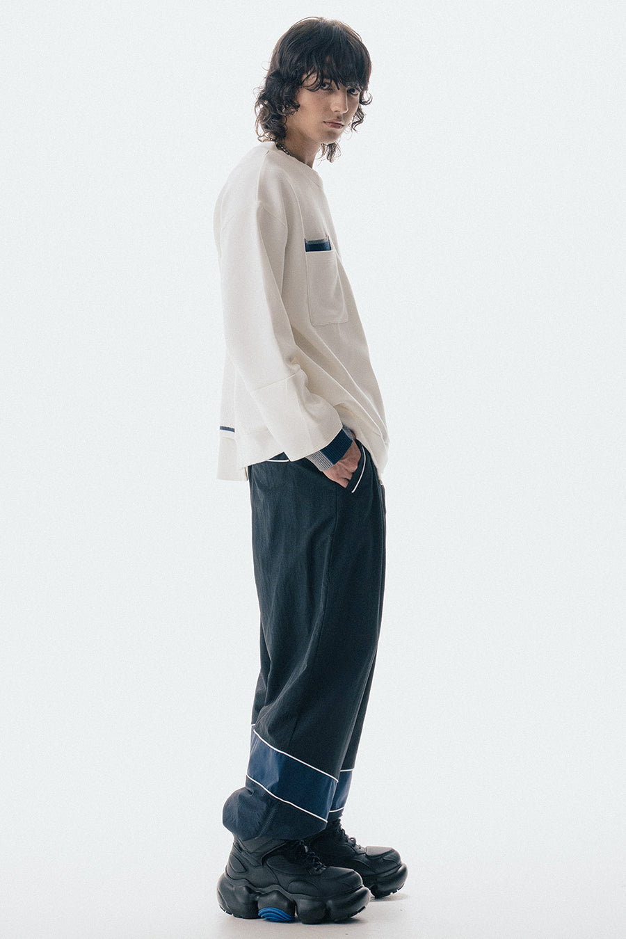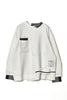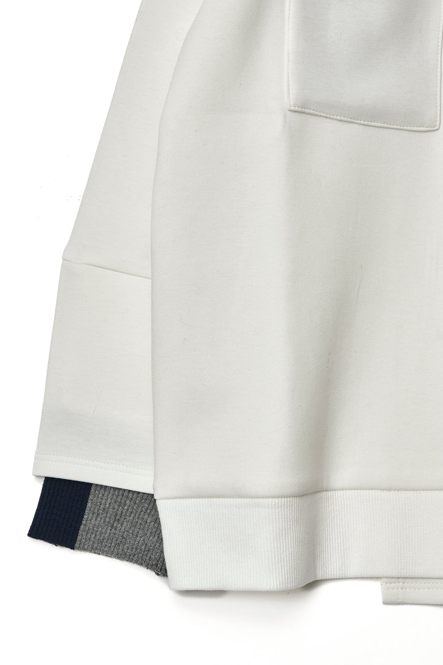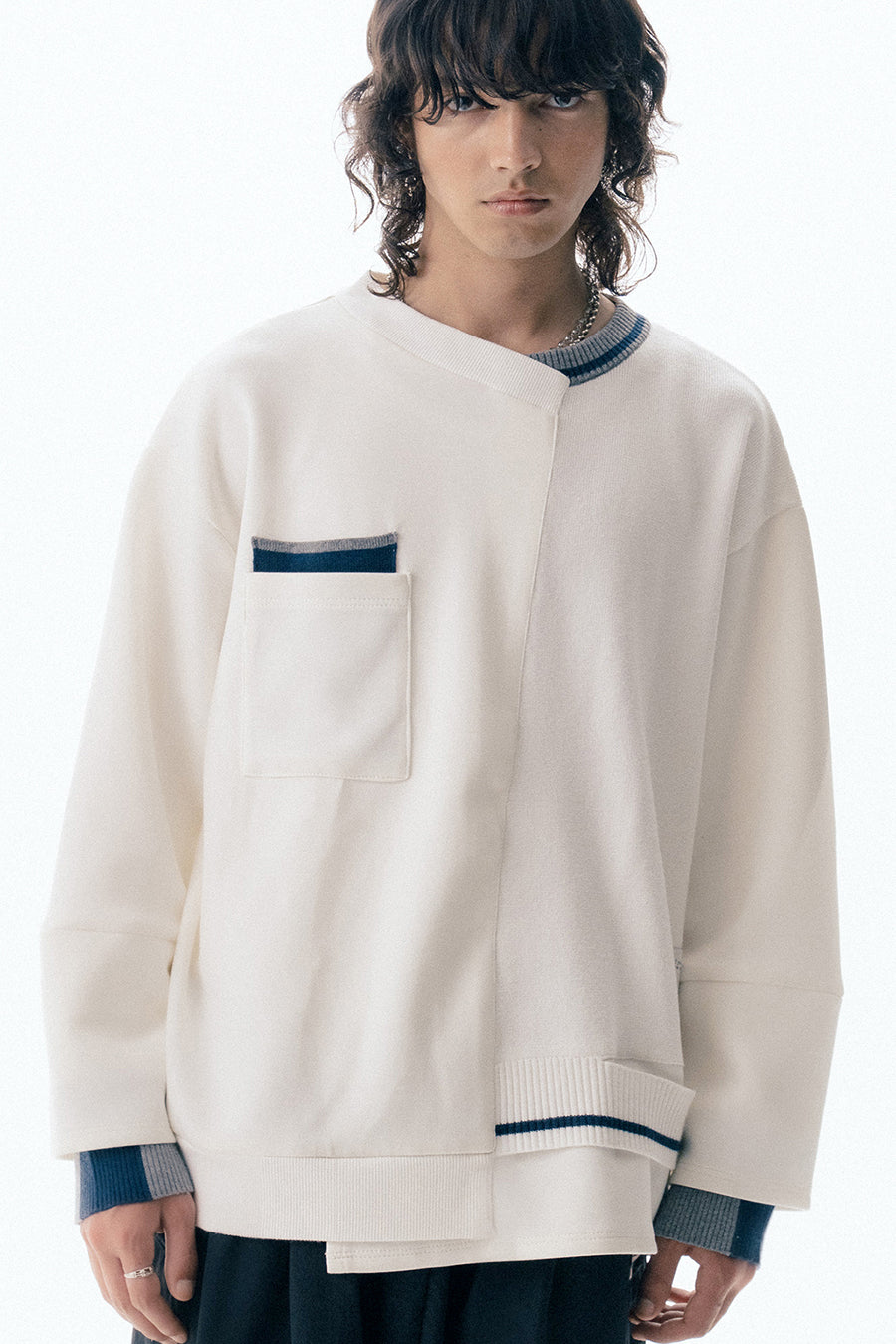 ニットとダンボールカットソーを左右で切り替えた、アシンメトリーデザインのプルオーバー。裾のレイヤード風ディテールや、後ろのスリットが抜け感をプラス。袖は丸みのあるカーブラインで、袖口からリブニットが覗く立体的な仕上がりに。配色の襟リブや胸ポケットもアクセント。