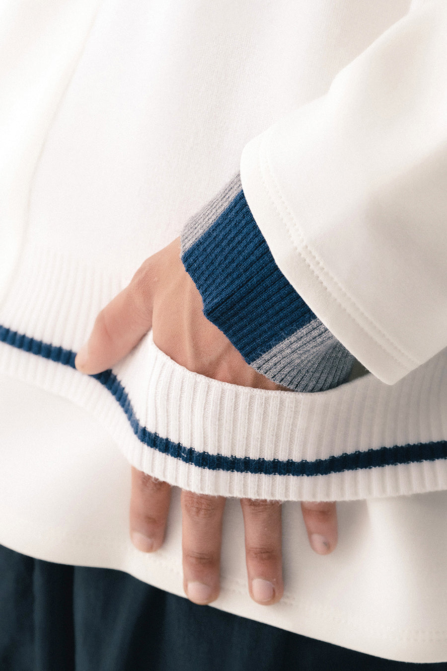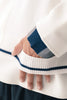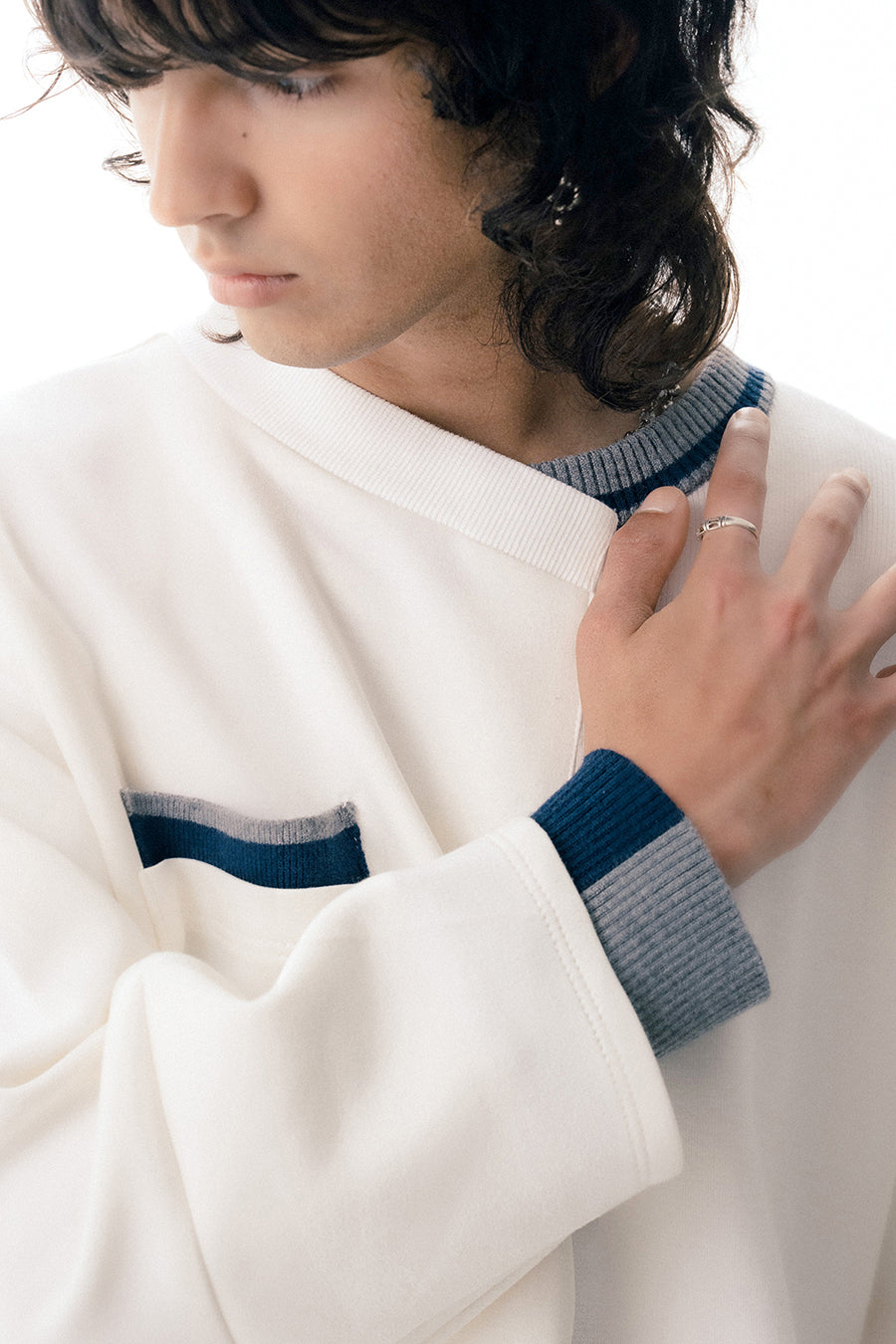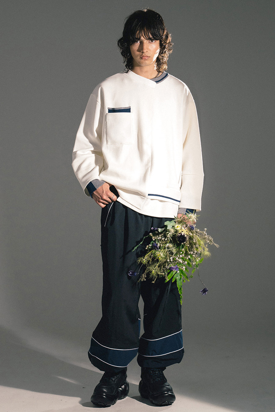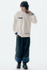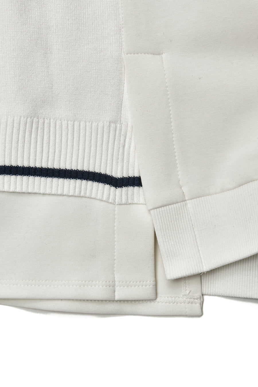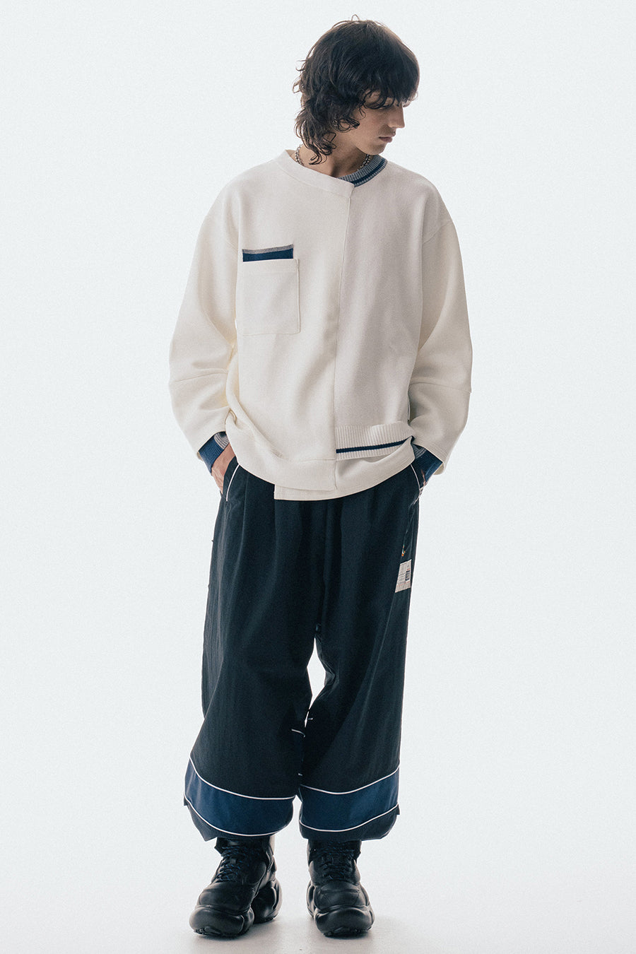 ニットとダンボールカットソーを左右で切り替えた、アシンメトリーデザインのプルオーバー。裾のレイヤード風ディテールや、後ろのスリットが抜け感をプラス。袖は丸みのあるカーブラインで、袖口からリブニットが覗く立体的な仕上がりに。配色の襟リブや胸ポケットもアクセント。