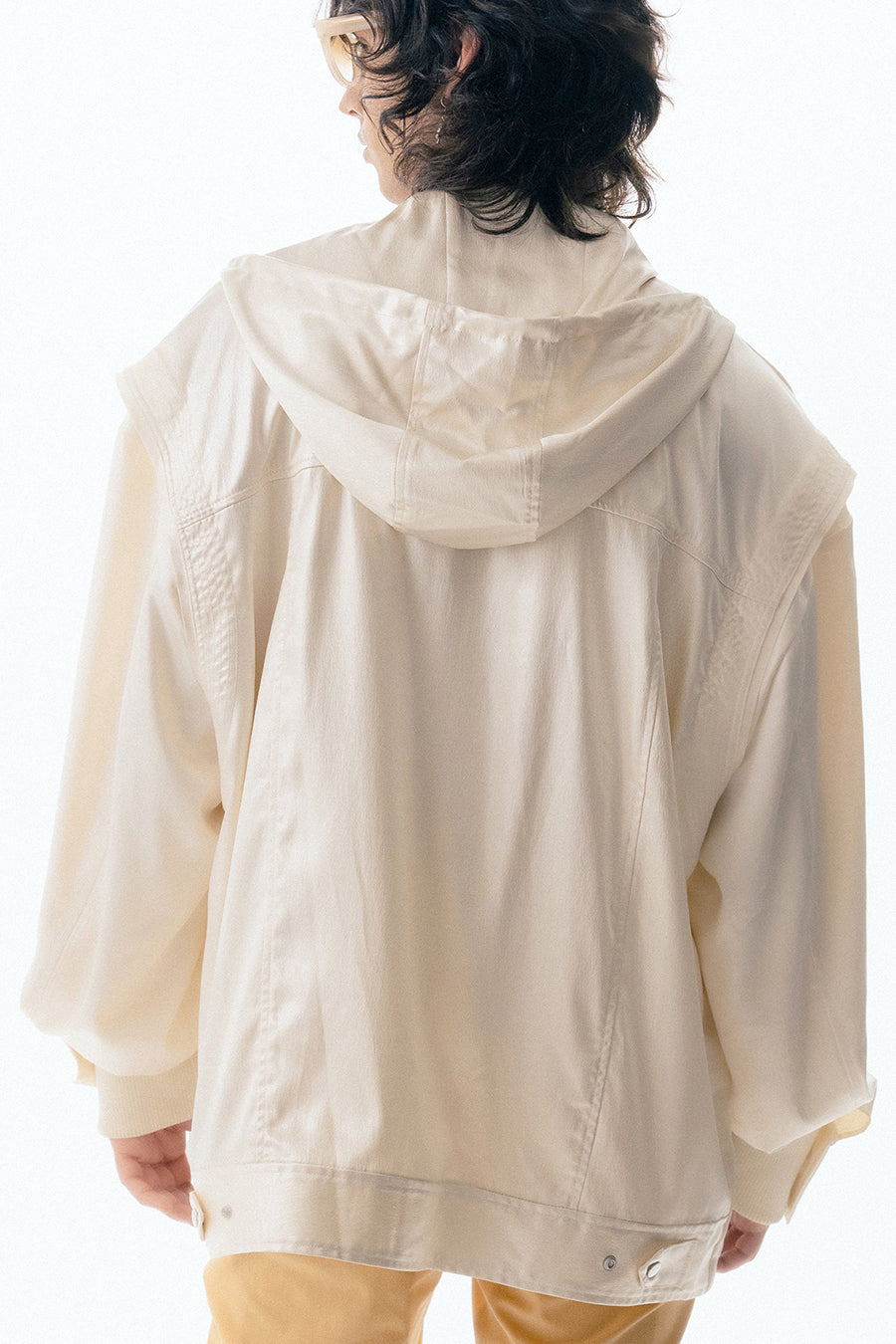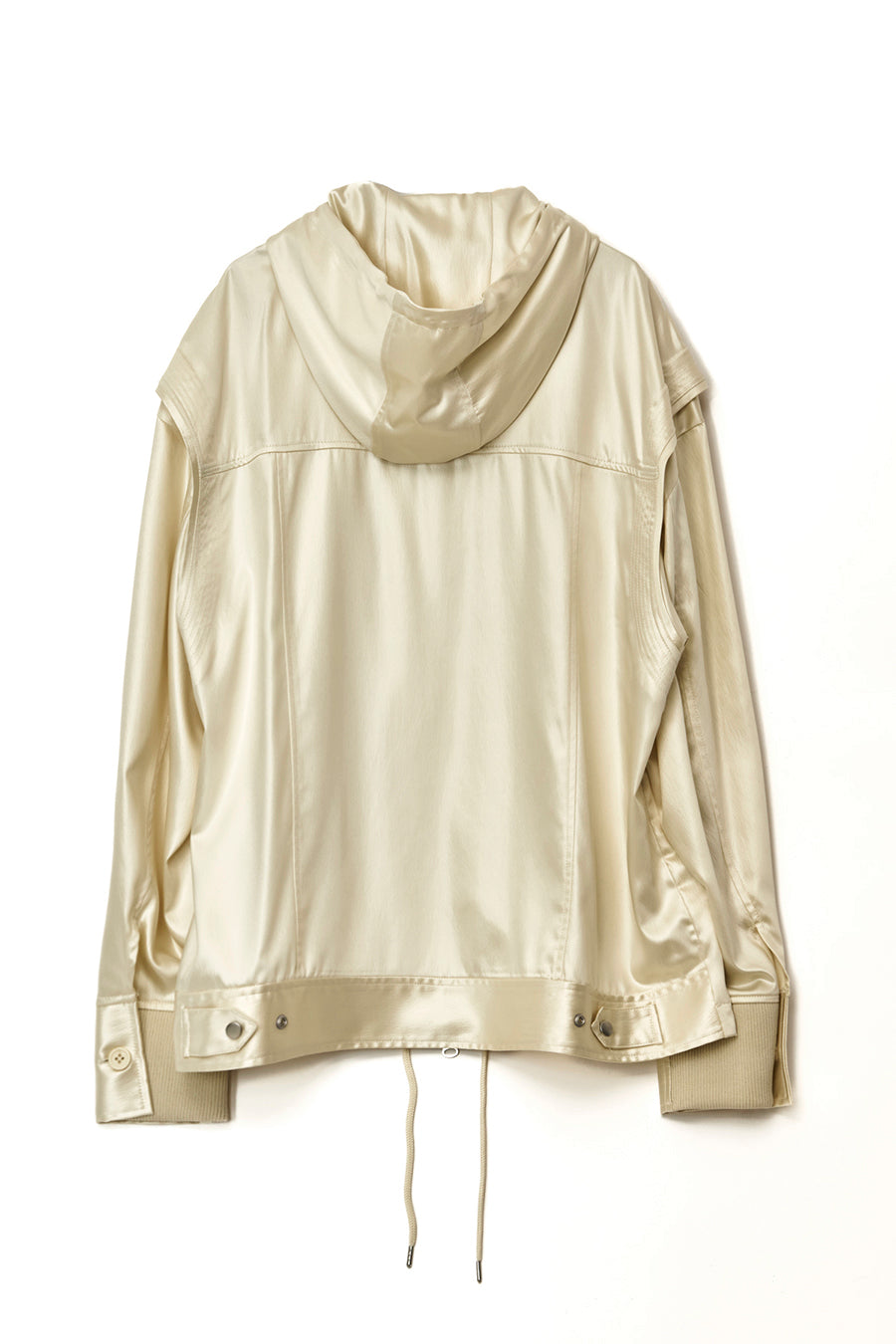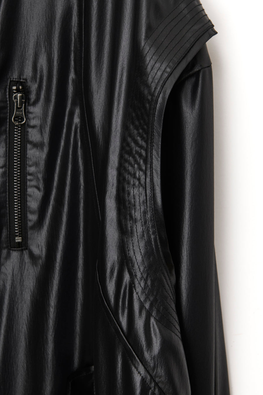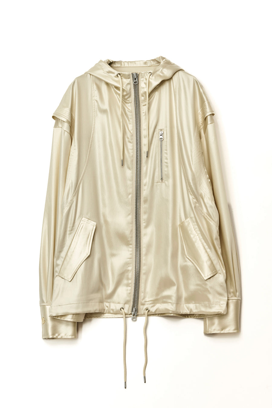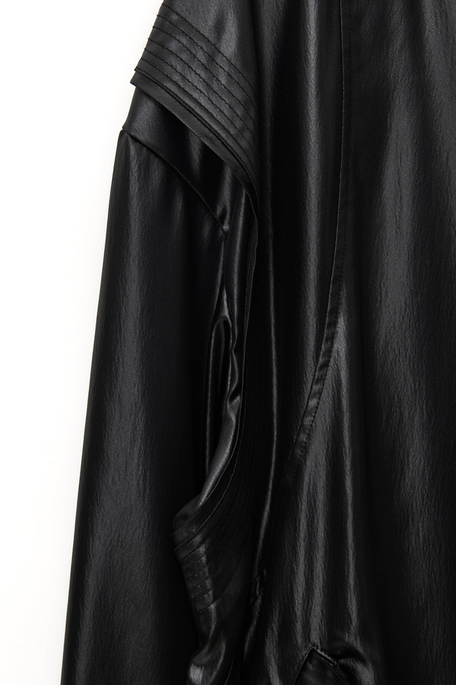 上品な微光沢と自然なドレープが特徴のレザーライクサテンを使用したブルゾン。肩にはステッチワークを施し、シンプルながらもエッジの効いたデザイン。フロントファスナーは、ムシを二重に重ねた特徴的なディテール。落ち感のある素材感と、裏地無しなので、シャツ感覚で気軽に羽織れるアイテム。