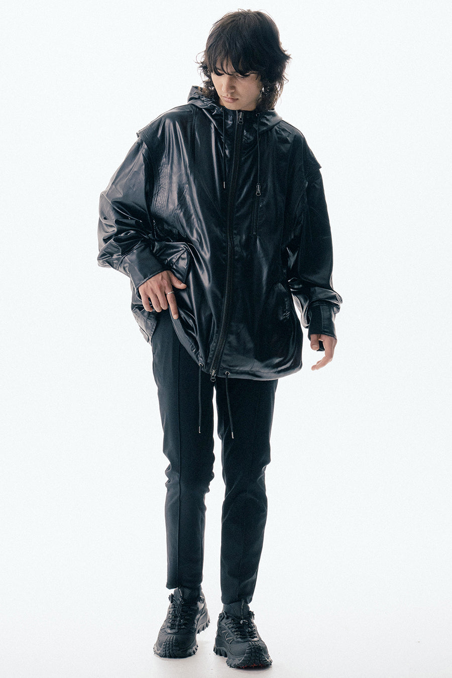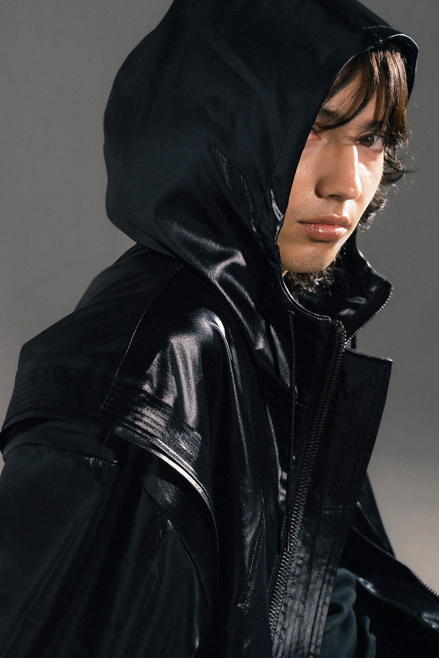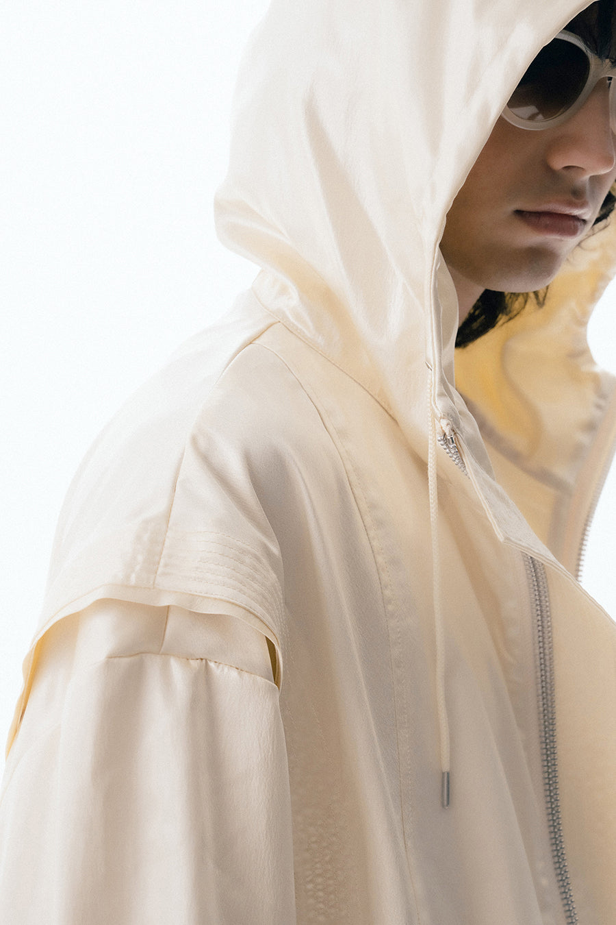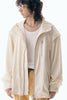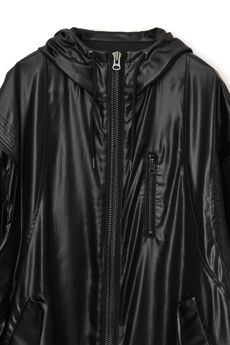 上品な微光沢と自然なドレープが特徴のレザーライクサテンを使用したブルゾン。肩にはステッチワークを施し、シンプルながらもエッジの効いたデザイン。フロントファスナーは、ムシを二重に重ねた特徴的なディテール。落ち感のある素材感と、裏地無しなので、シャツ感覚で気軽に羽織れるアイテム。