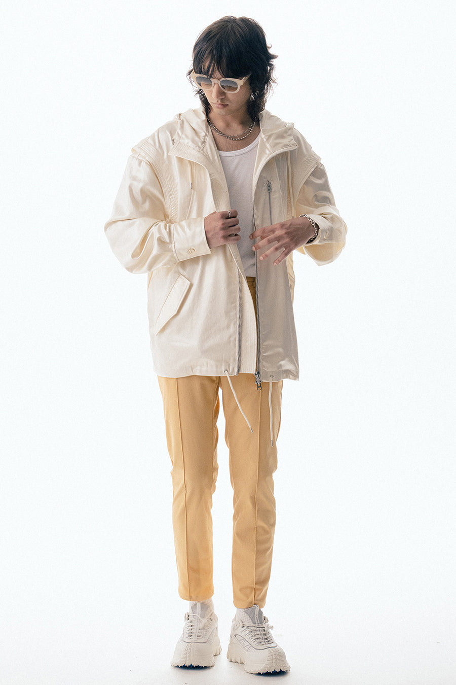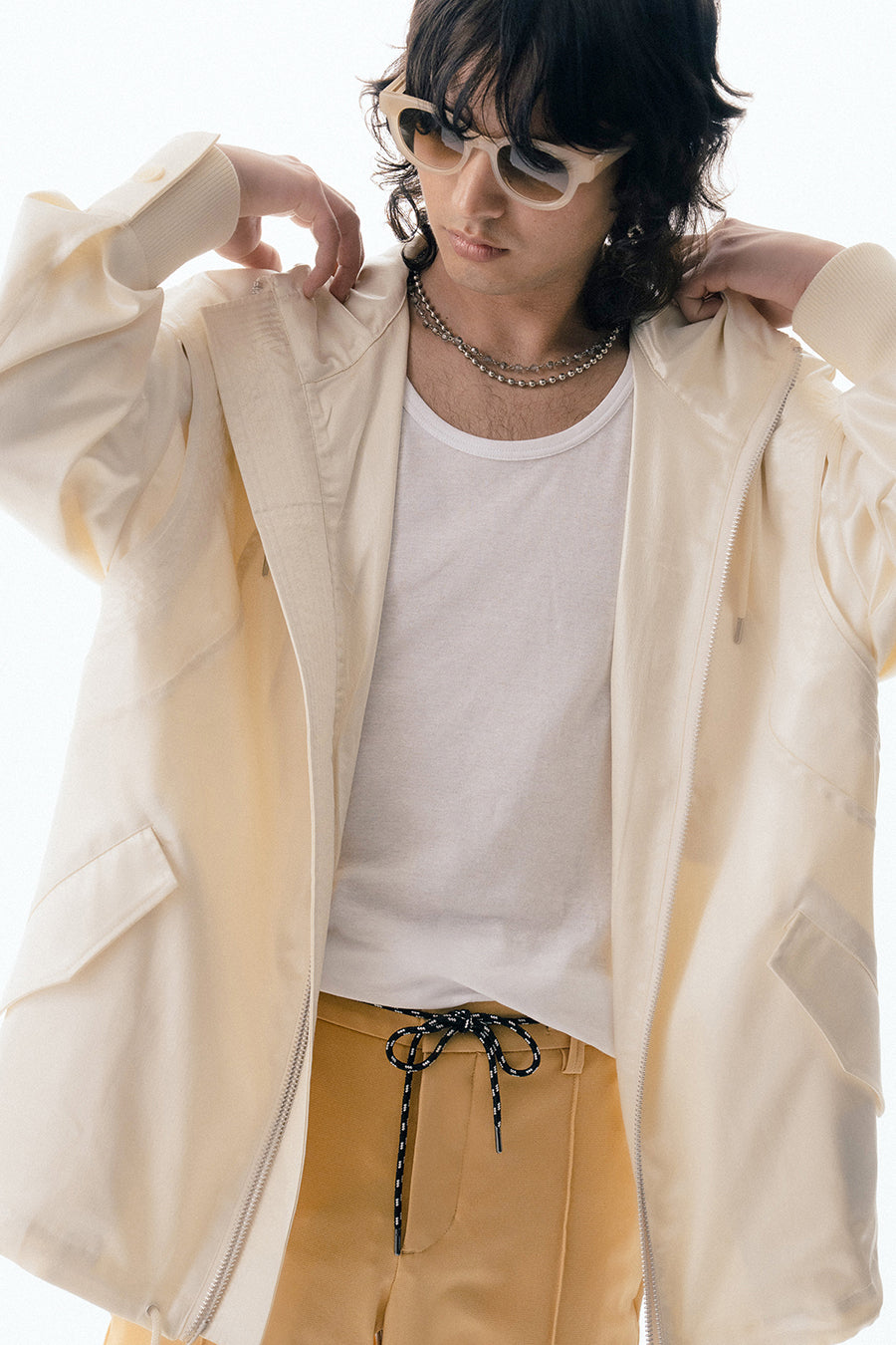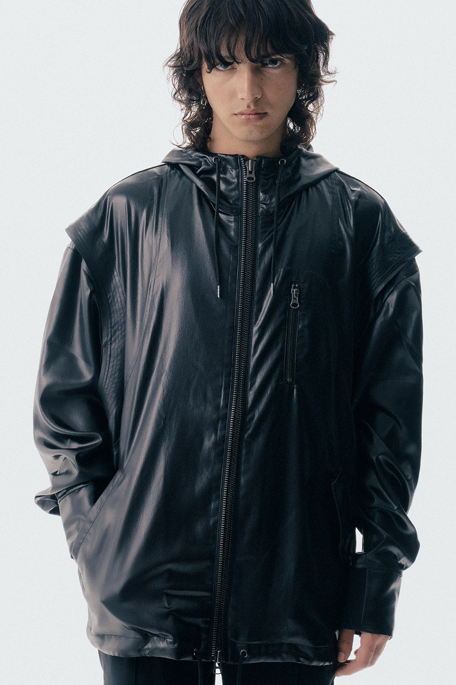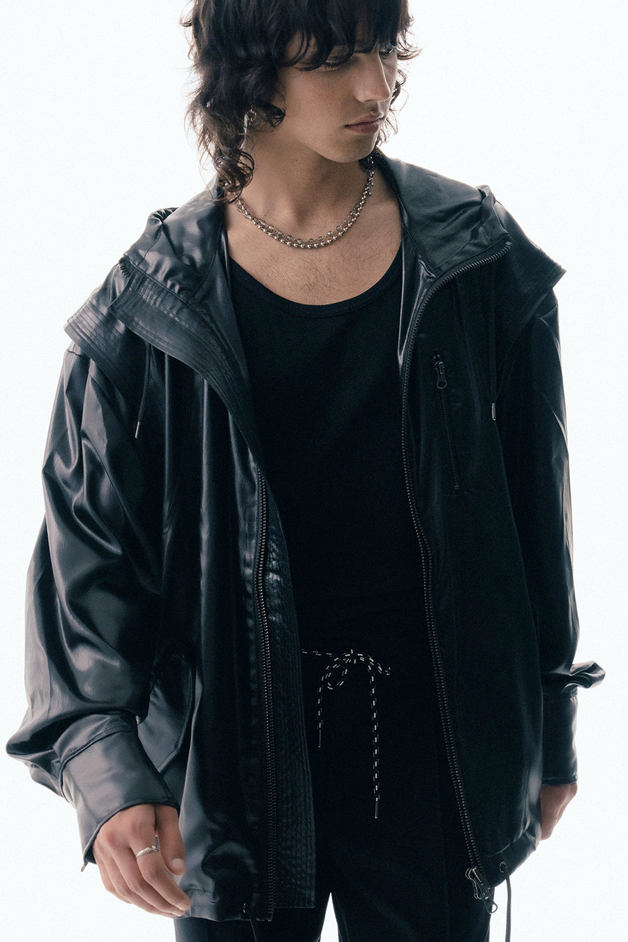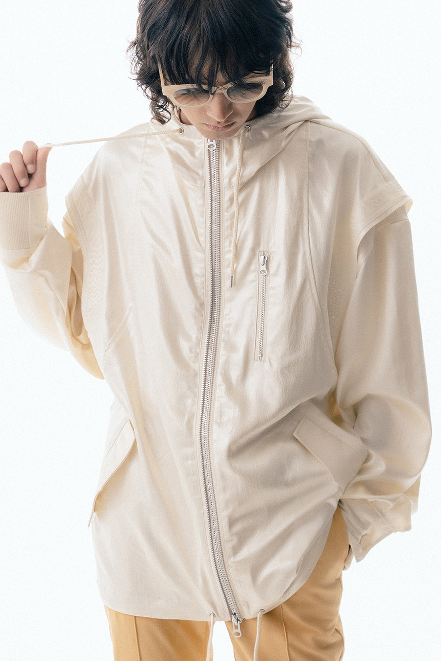 上品な微光沢と自然なドレープが特徴のレザーライクサテンを使用したブルゾン。肩にはステッチワークを施し、シンプルながらもエッジの効いたデザイン。フロントファスナーは、ムシを二重に重ねた特徴的なディテール。落ち感のある素材感と、裏地無しなので、シャツ感覚で気軽に羽織れるアイテム。