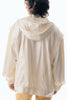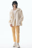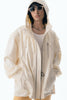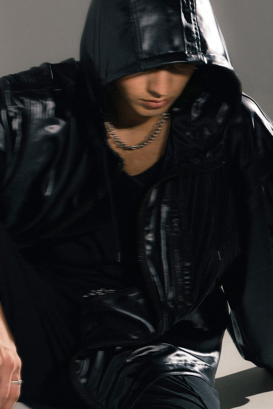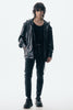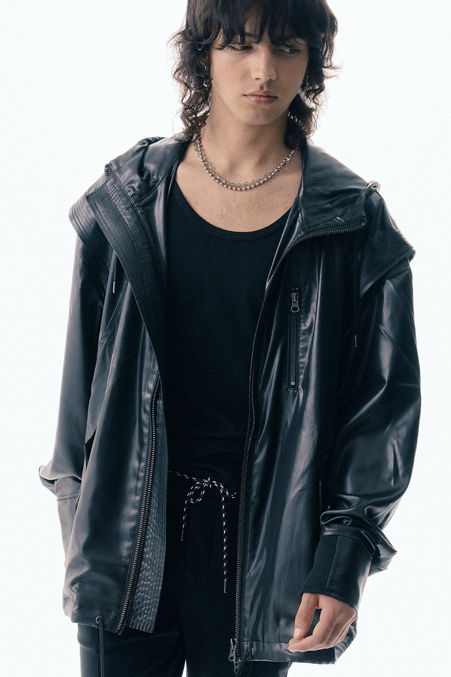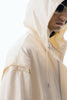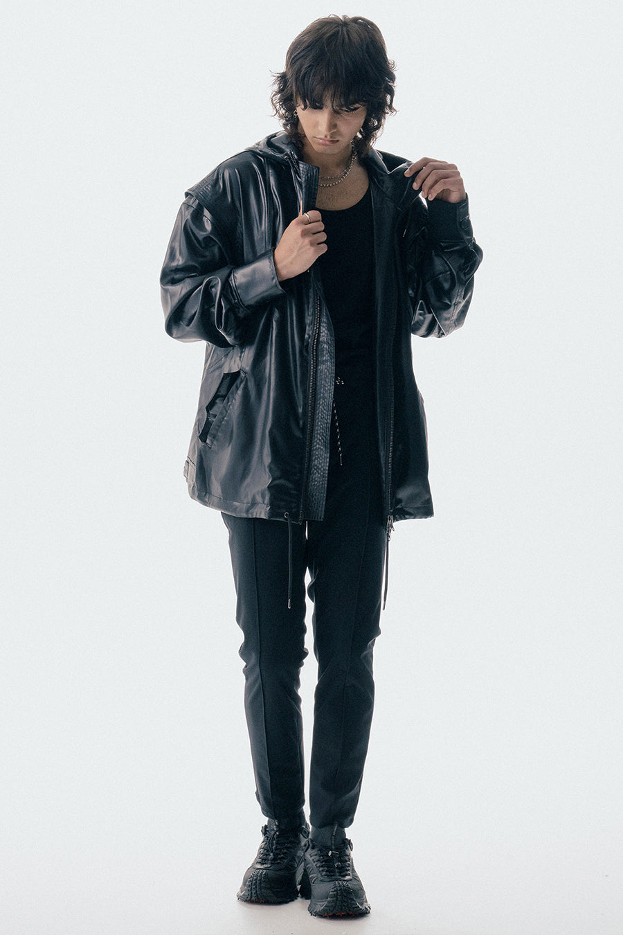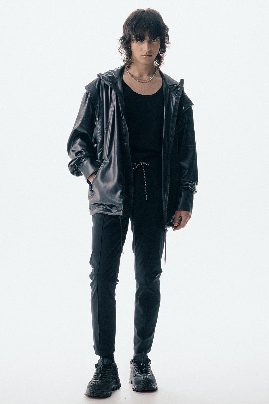 上品な微光沢と自然なドレープが特徴のレザーライクサテンを使用したブルゾン。肩にはステッチワークを施し、シンプルながらもエッジの効いたデザイン。フロントファスナーは、ムシを二重に重ねた特徴的なディテール。落ち感のある素材感と、裏地無しなので、シャツ感覚で気軽に羽織れるアイテム。