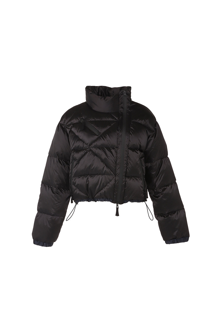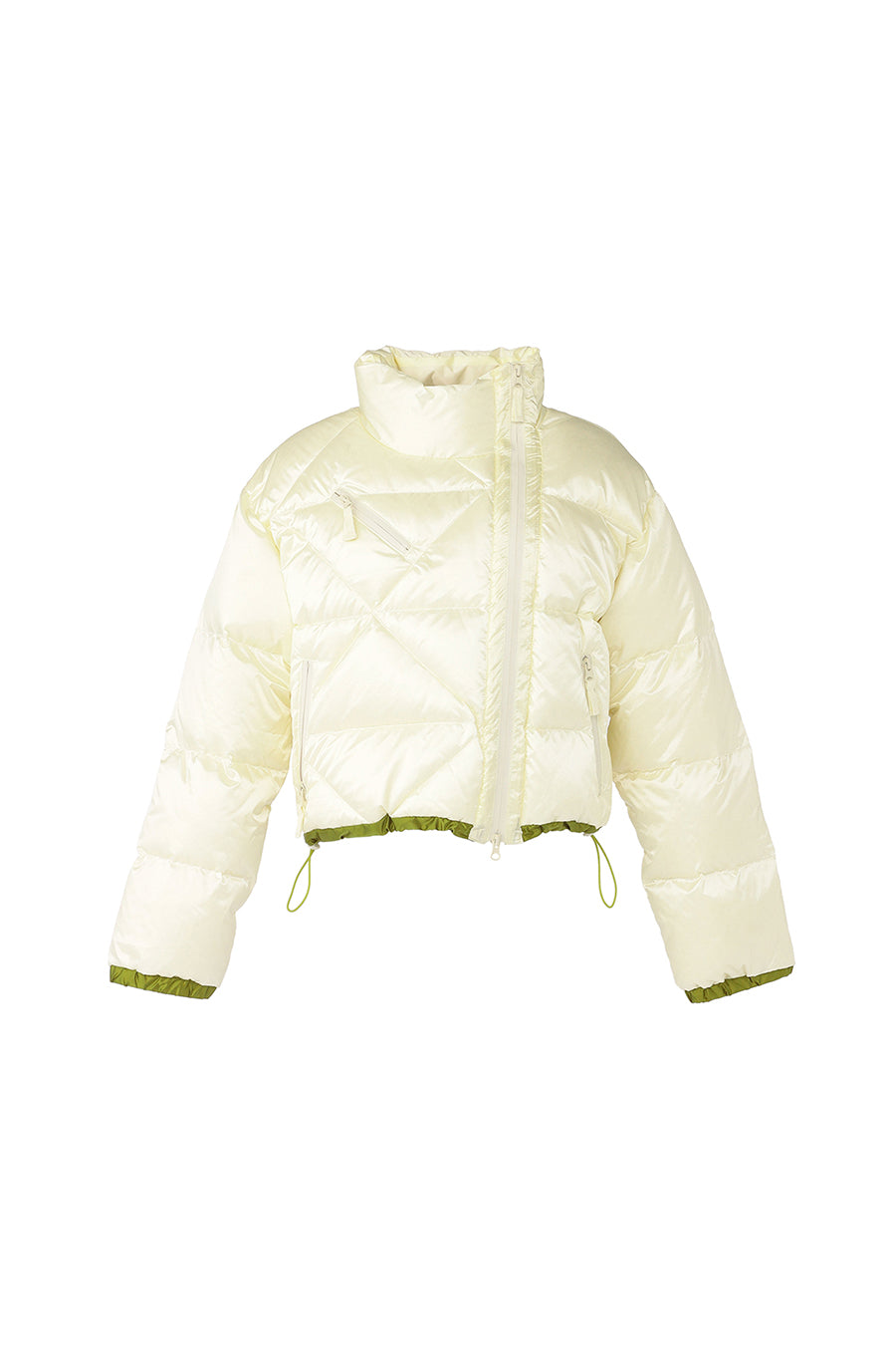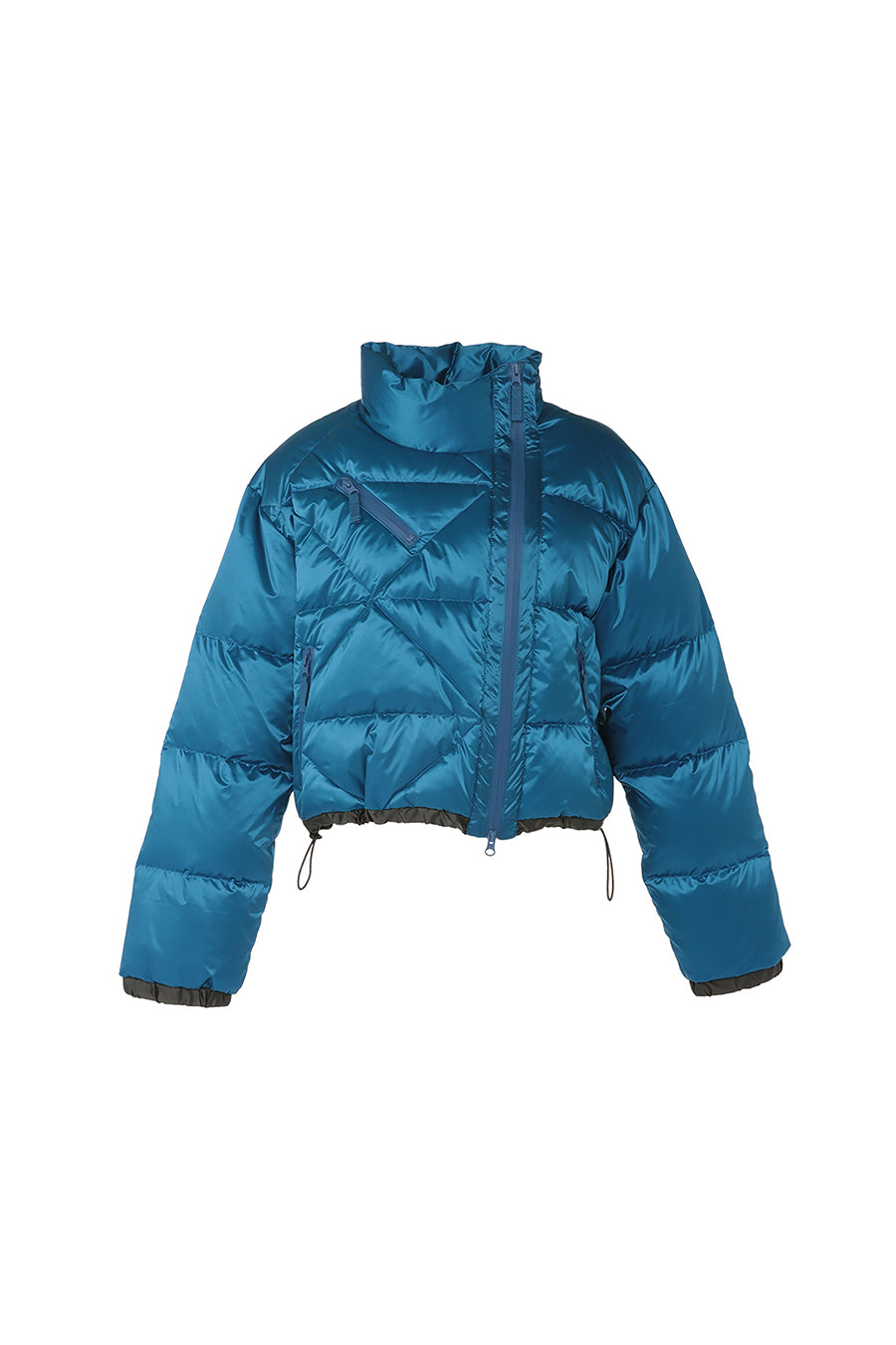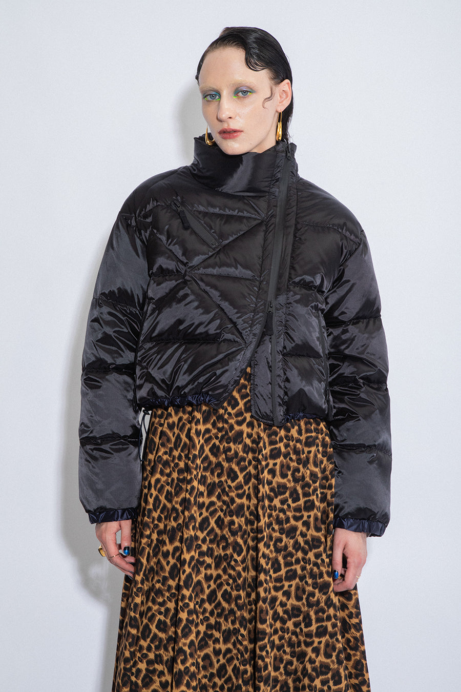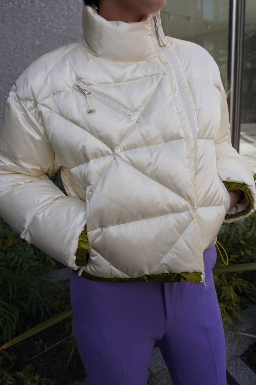 フロントは斜めにダブルジップ、身頃はトライアングル柄のオリジナルダウンステッチと横段ステッチをアシンメトリーに配置。