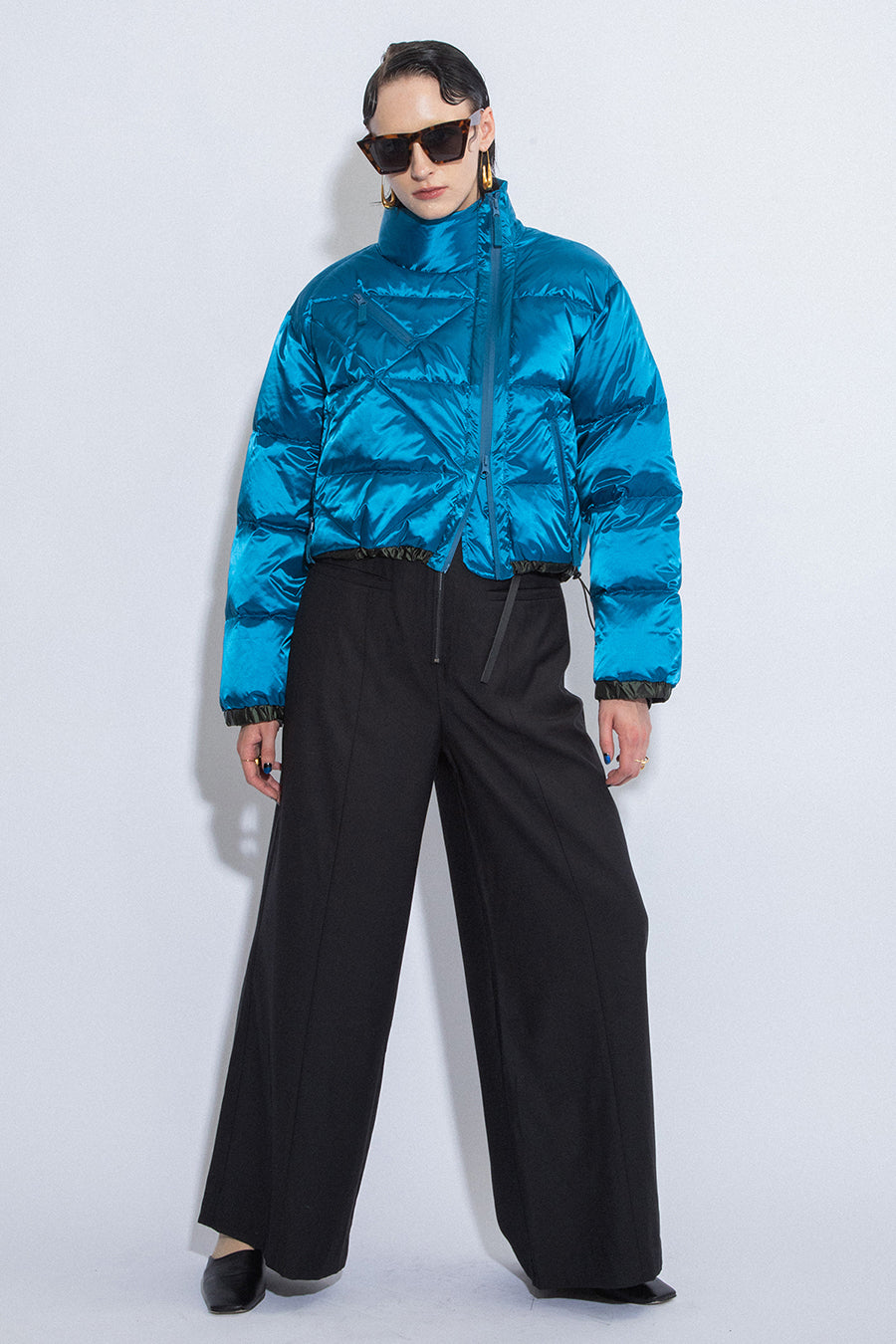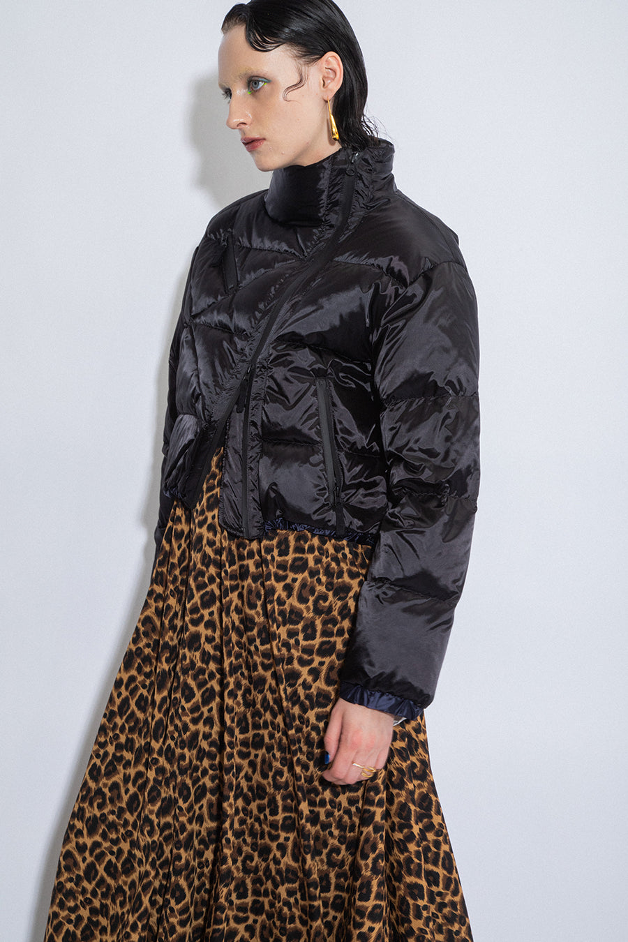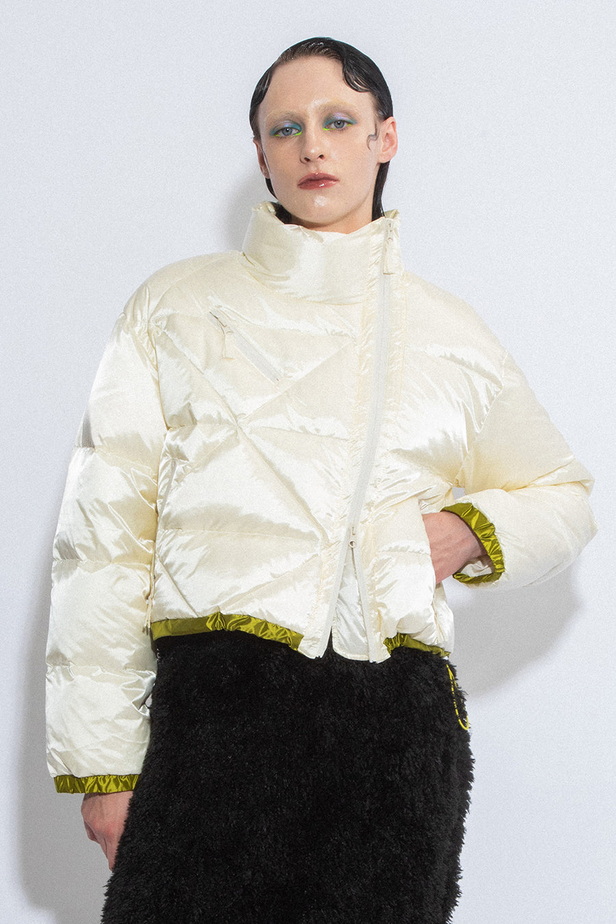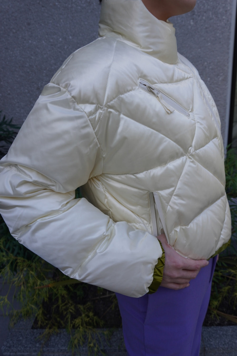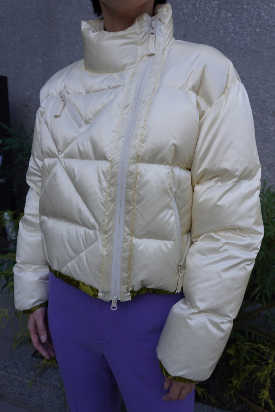 フロントは斜めにダブルジップ、身頃はトライアングル柄のオリジナルダウンステッチと横段ステッチをアシンメトリーに配置。