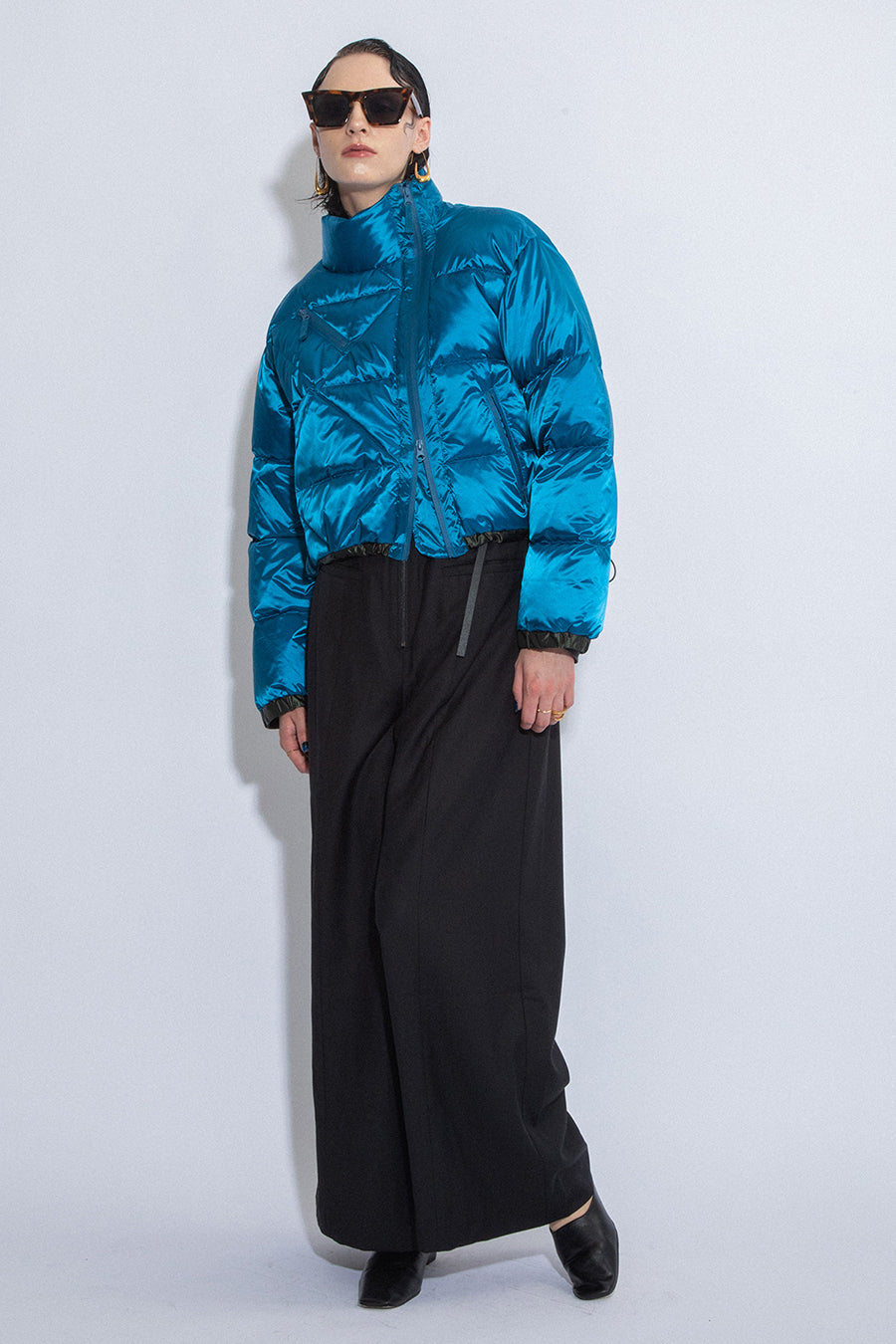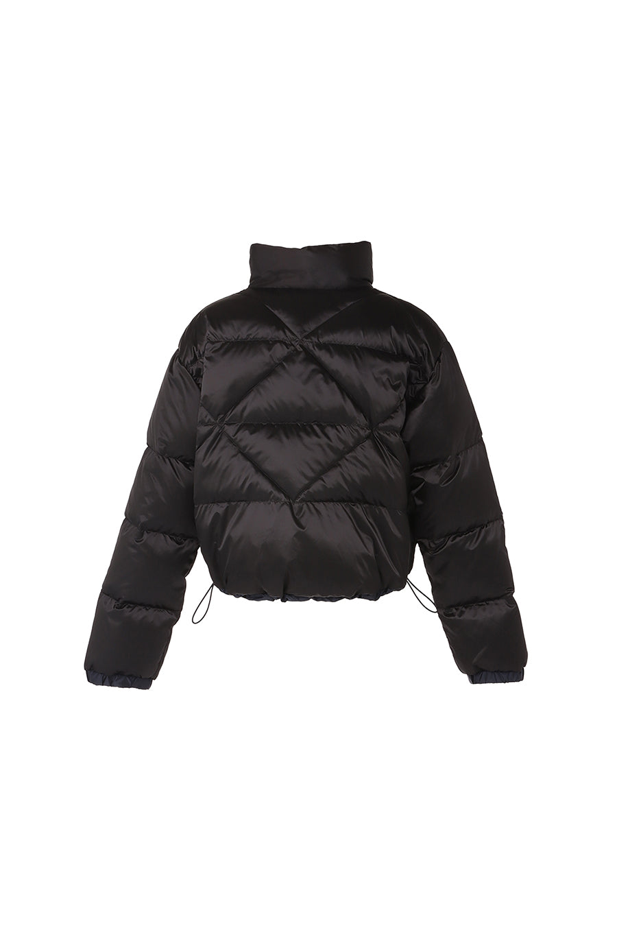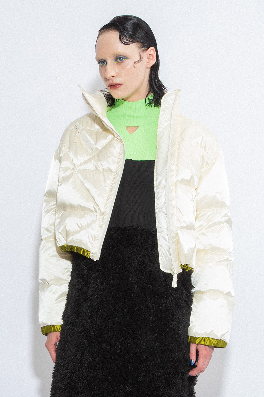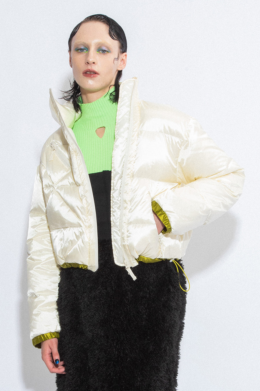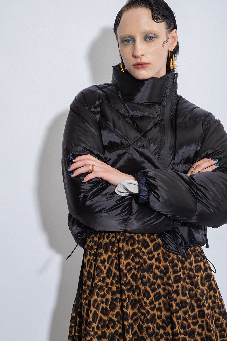フロントは斜めにダブルジップ、身頃はトライアングル柄のオリジナルダウンステッチと横段ステッチをアシンメトリーに配置。
