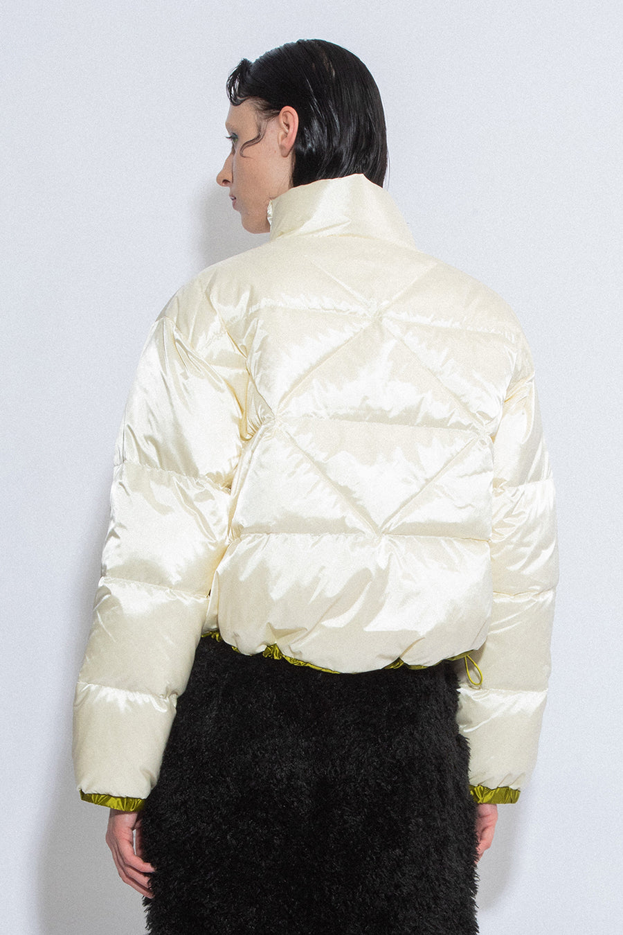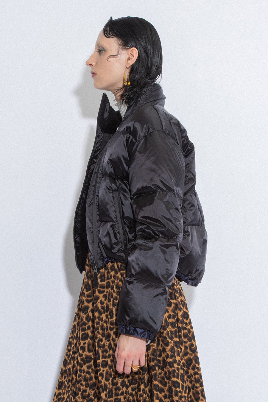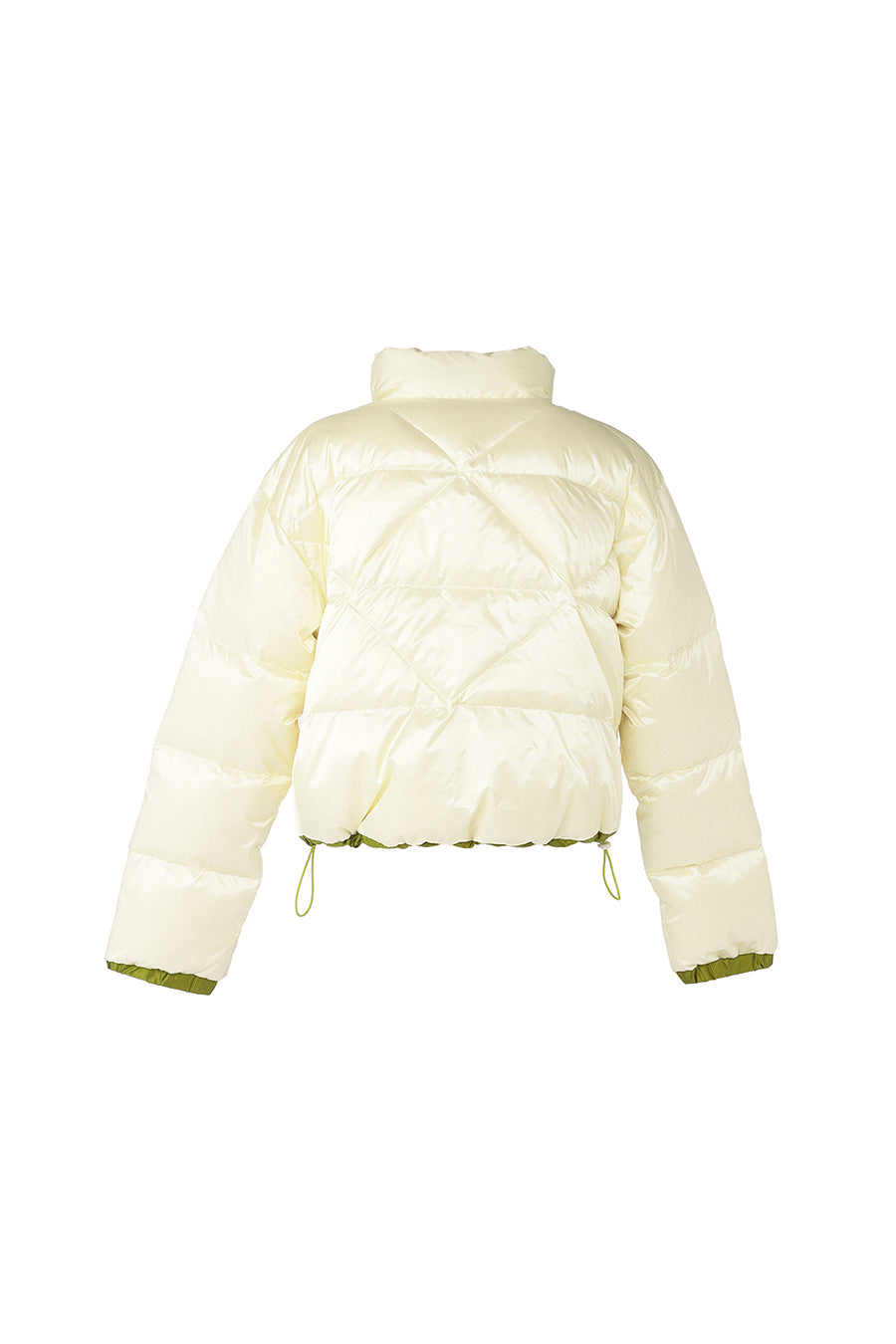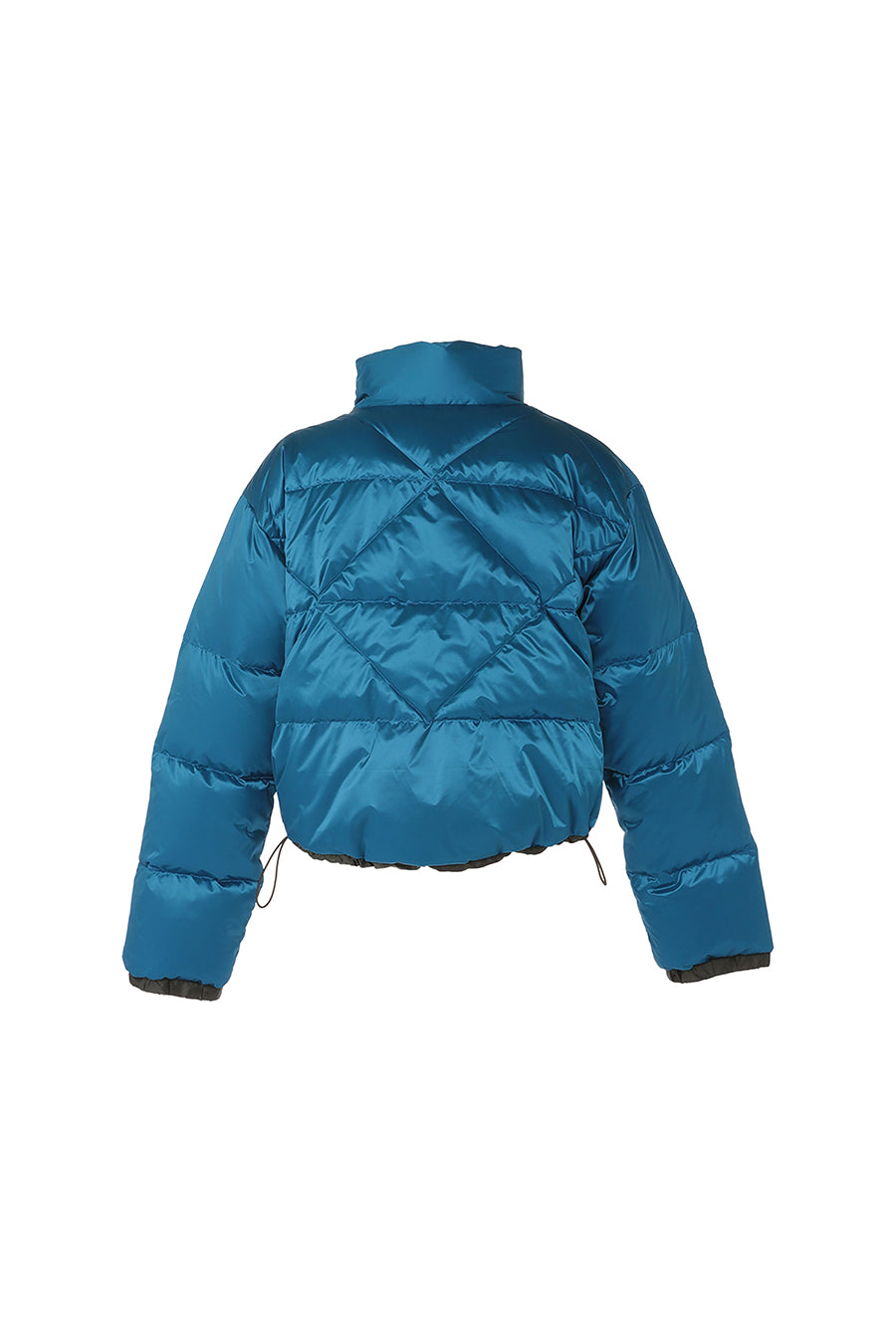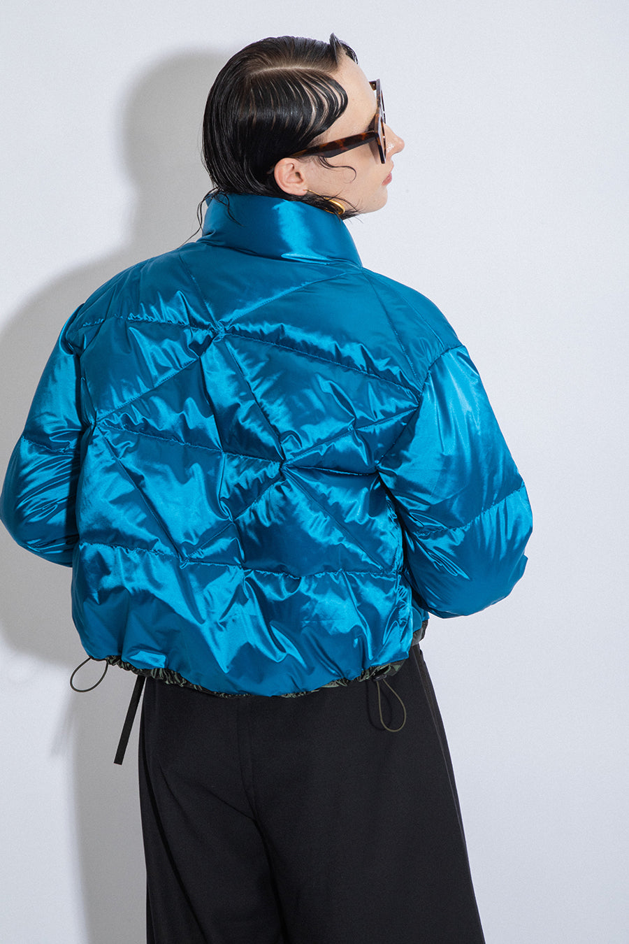 フロントは斜めにダブルジップ、身頃はトライアングル柄のオリジナルダウンステッチと横段ステッチをアシンメトリーに配置。