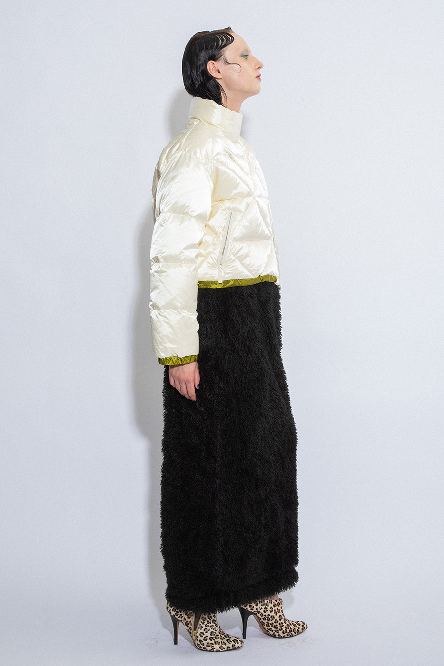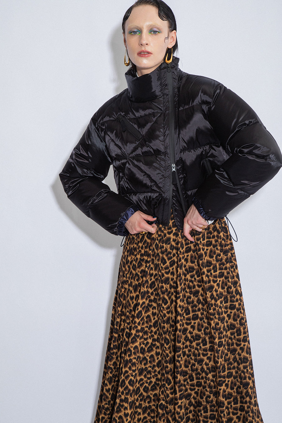 裾に向かってAラインに広がるシルエットですが、ゴムコードで調整出来るので、丸いボリュームシルエットに変化することもできます。