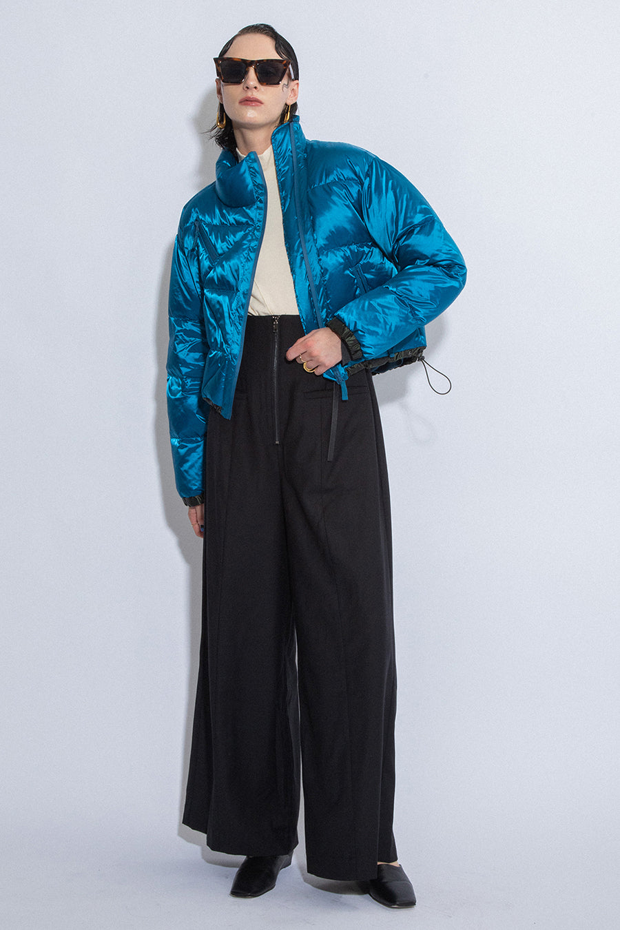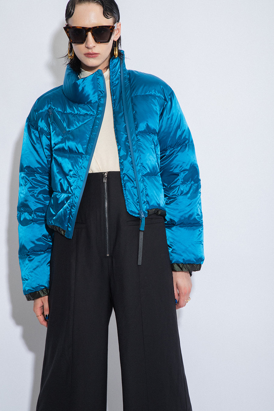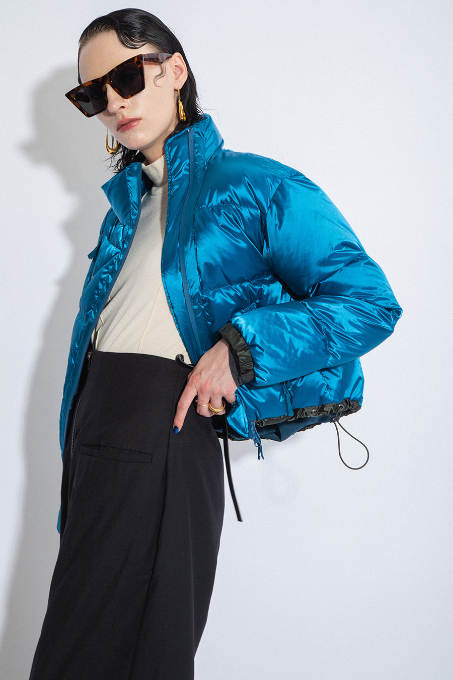 ドロップショルダーとスタンドカラーがニュアンスのある一着。