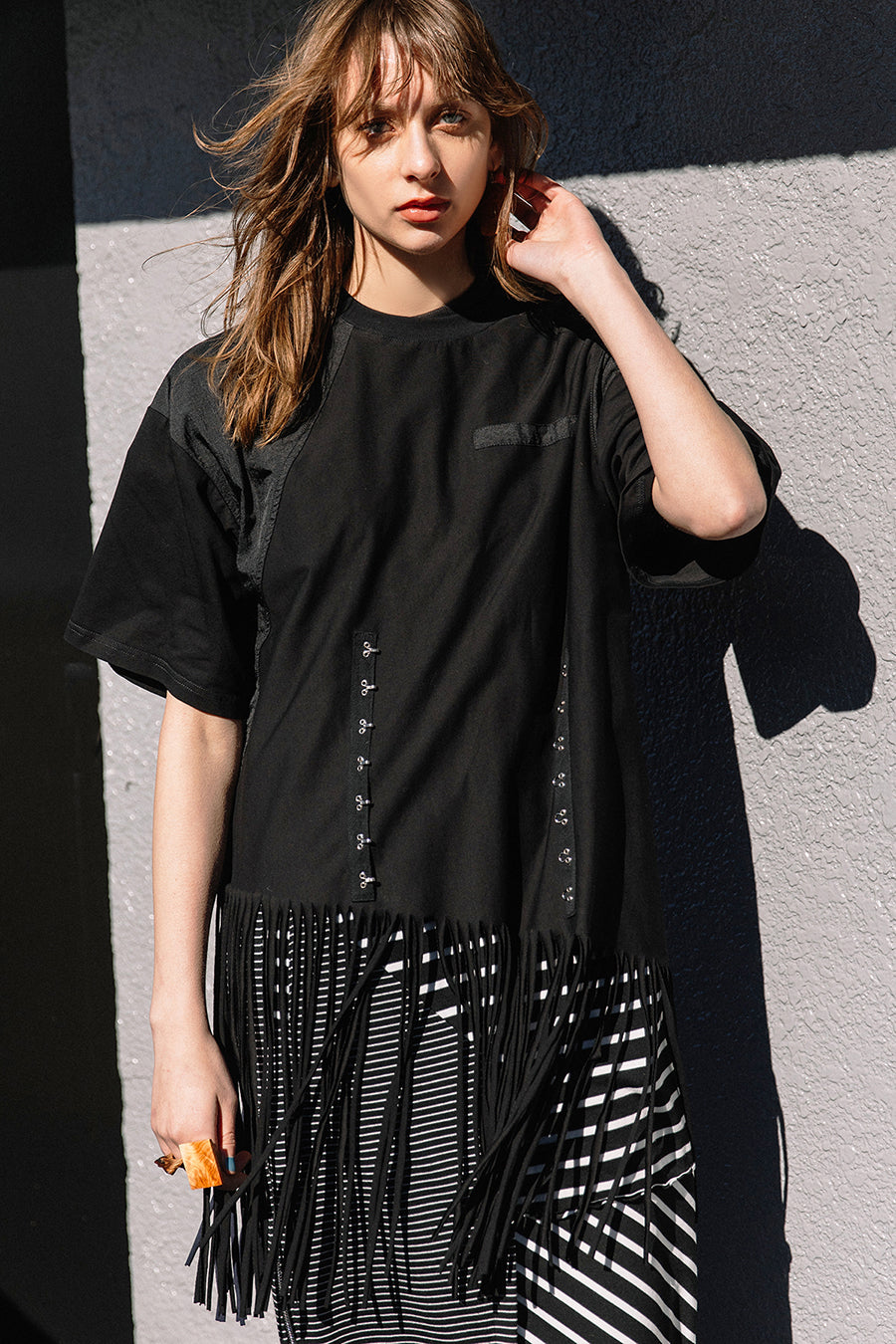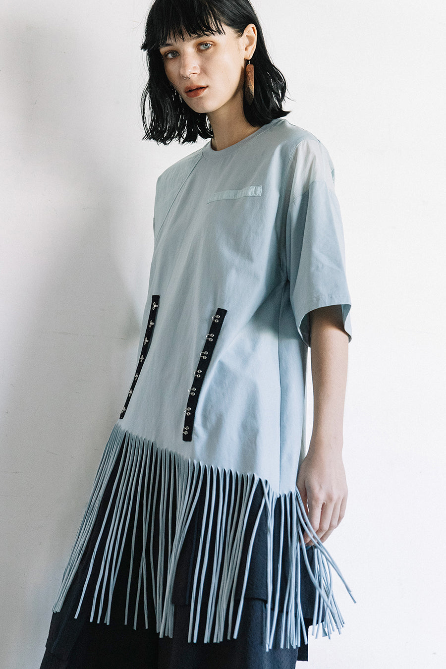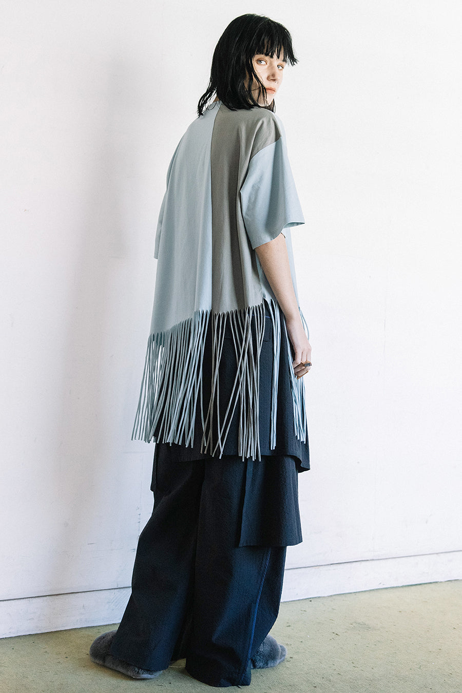 身頃の裾に切り込みを入れて作ったくるっと丸まるフリンジが目を引き、