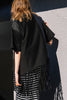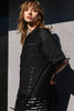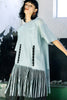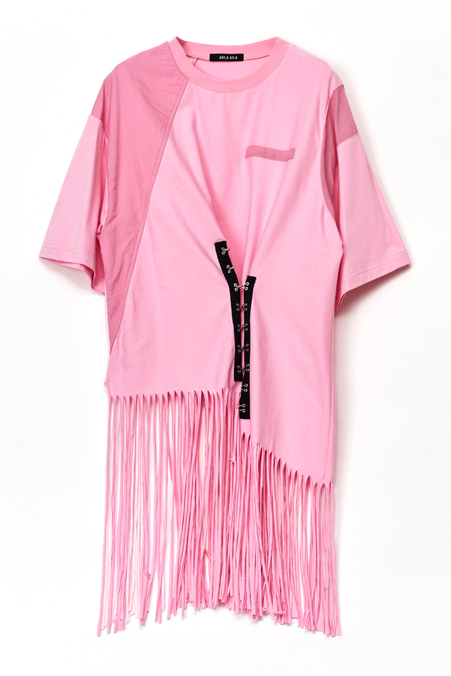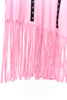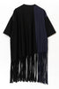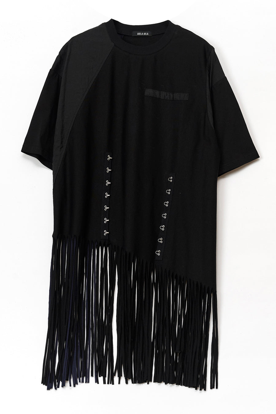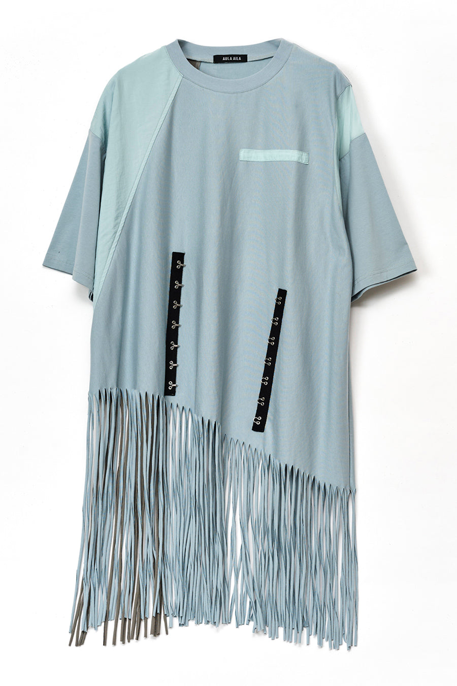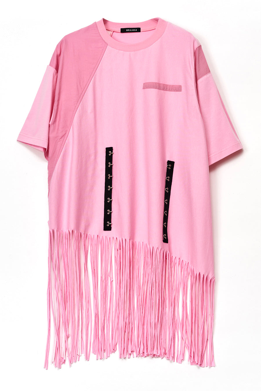 左右アシンメトリー丈のフリンジは、体の動きに合わせて揺れドラマティックな印象。