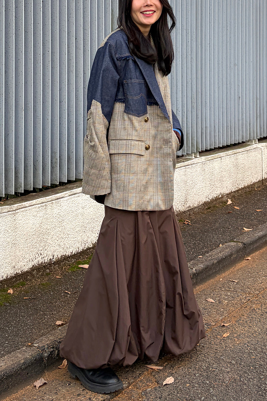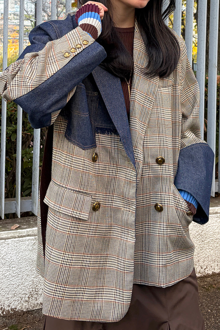 毎年好評のGジャンとテーラージャケットをリメイクしたようなデザインのジャケット。今年は秋らしいマニッシュなチェックを取り入れ、ストライプとデニムとの異素材をコンビネーション。細かいディティールにこだわったAULA AILAらしい人気のデザイン。袖口はブルゾン風にゴム仕様でボリュームをつけ新鮮さをだし、釦はアンティークゴールドのメタル釦を使用しヴィンテージ感とトレンドをプラスしてアップデート。オーバーサイスで、厚手ニットも着込めるのでロングシーズン活躍。裏付き ポケット付き。