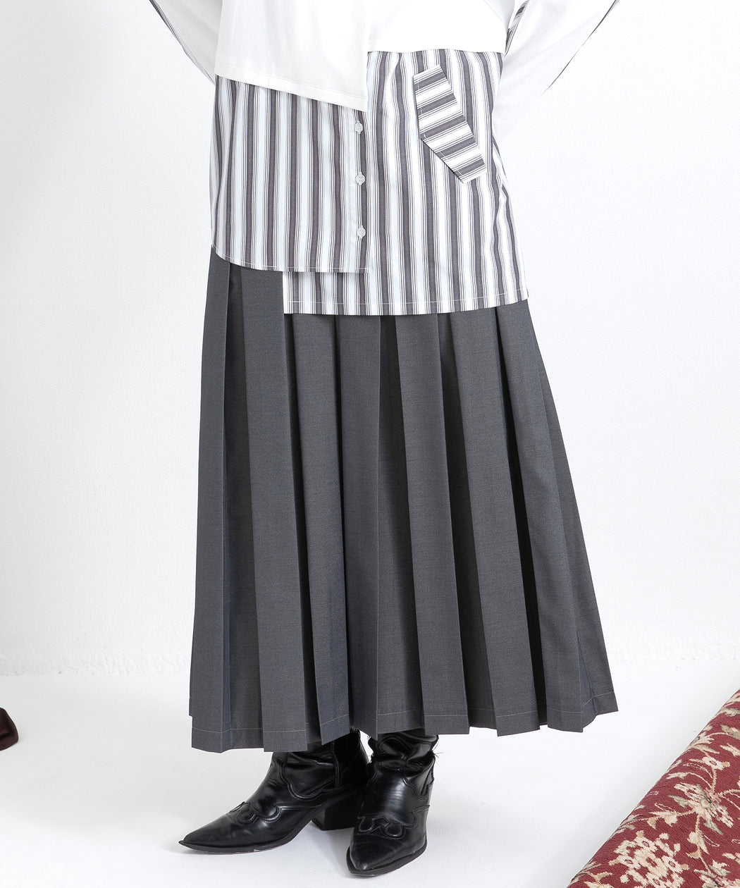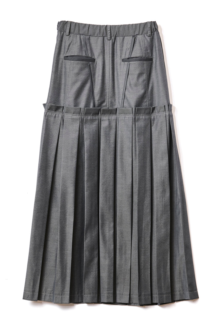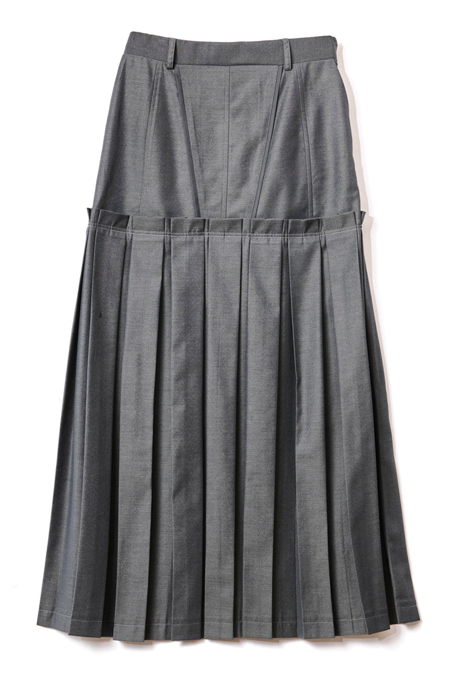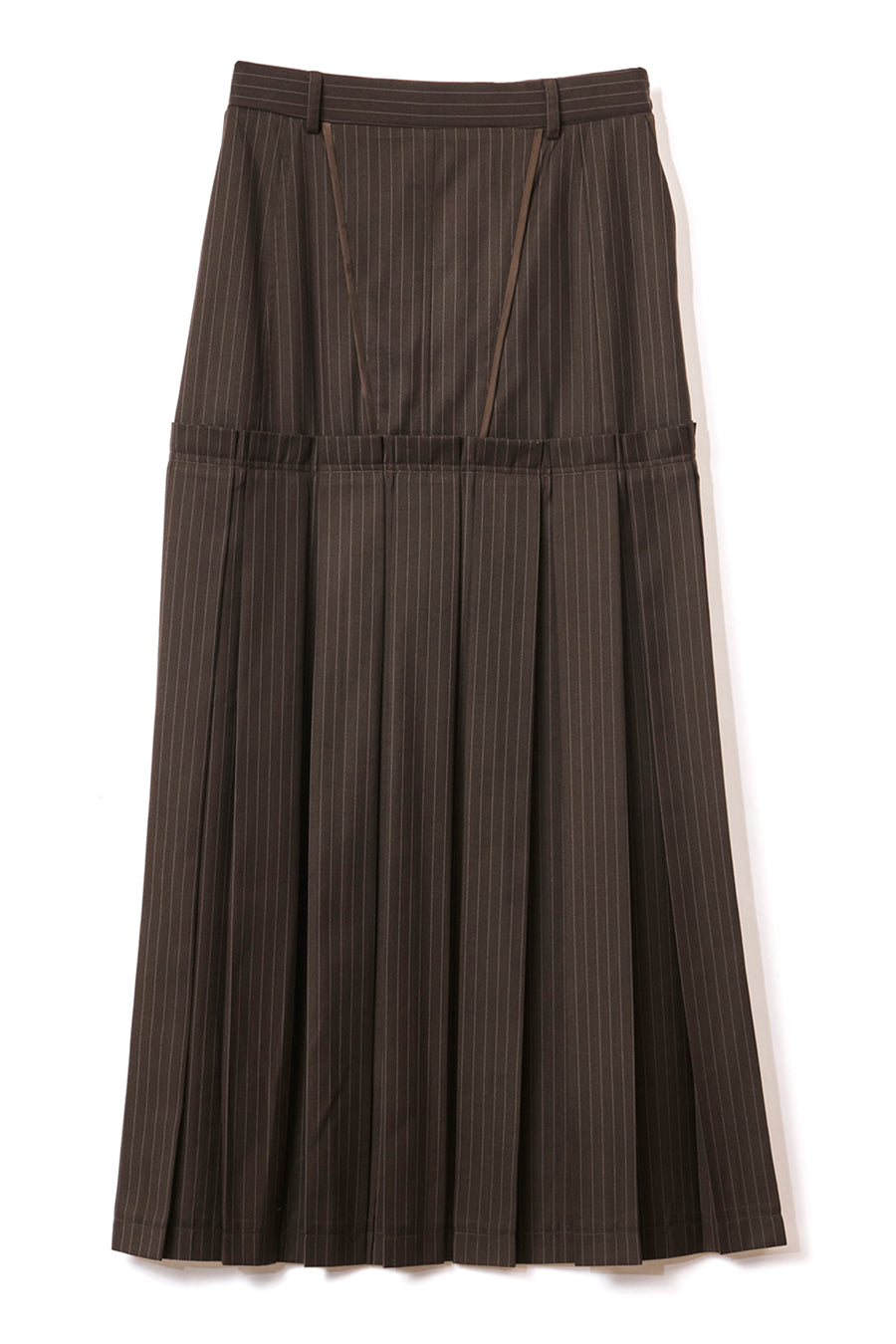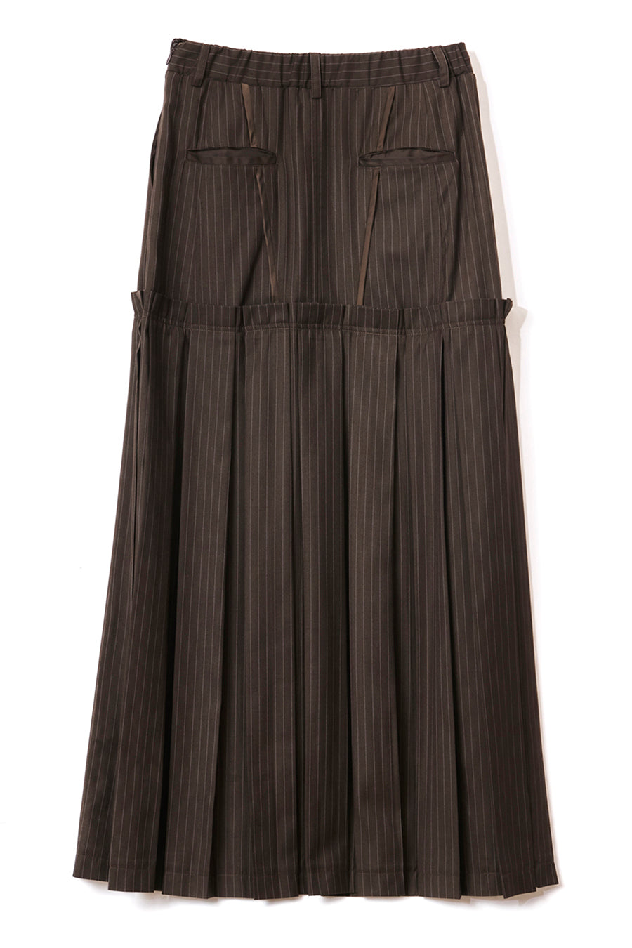 ストレートスカートの途中からBOXプリーツスカートをリメイクしたかのような立体的なデザインが目を惹くスカート。動きに合わせて広がるBOXプリーツはインパクトがあり、シンプルなトップスからセットアップのジャケットまで幅広いスタイリングが楽しめるアイテム。ウエスト周りには、切り替えデザインと同色サテンパイピングを挟み込み、デザインポイントかつ細見え効果も。ゴム仕様でストレスフリーに着られるのも嬉しい。グレーとブラックは無地。ブラウンはヴィンテージライクなピンストライプ。裏地付き。ポケット付き。