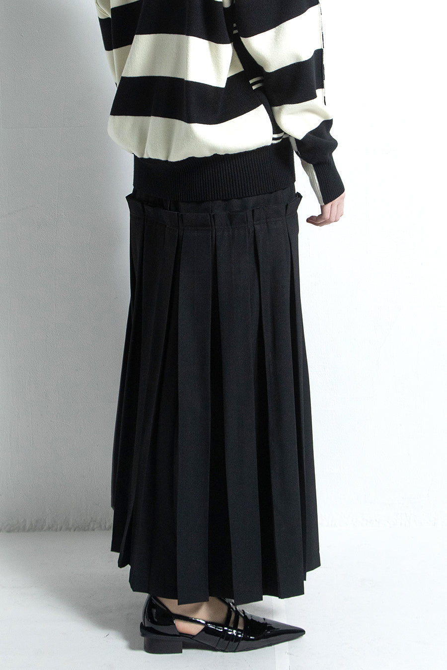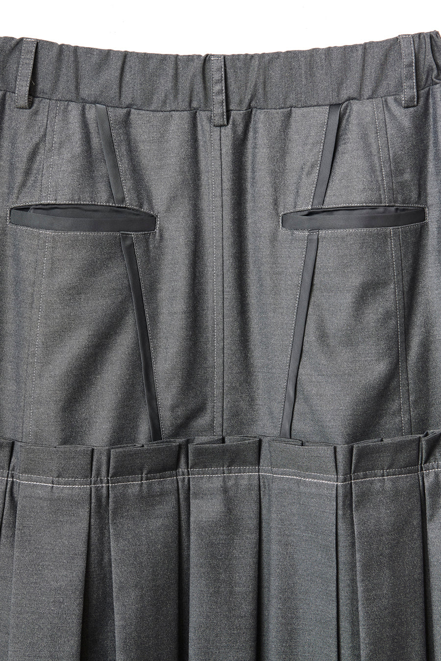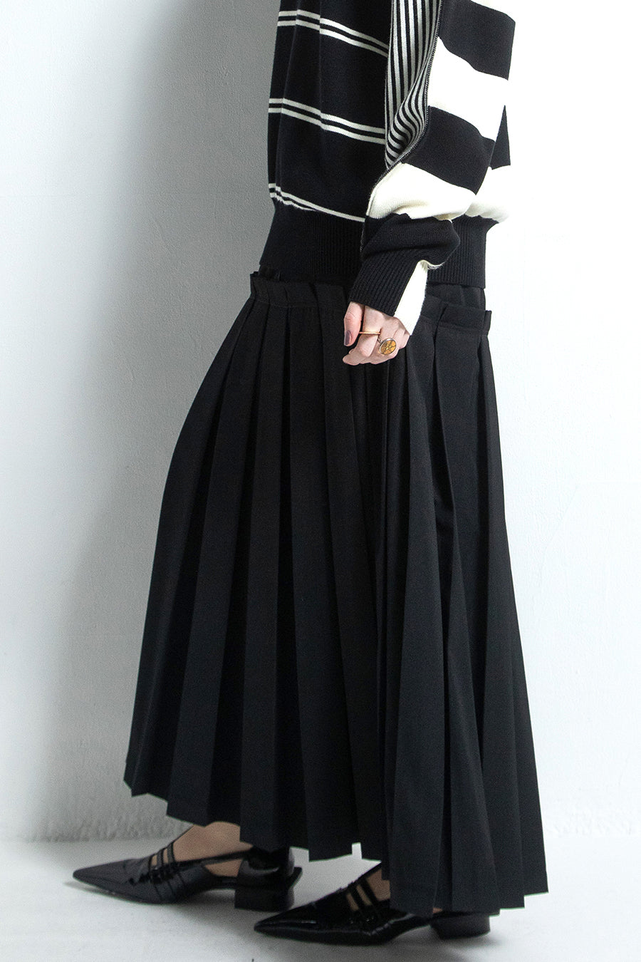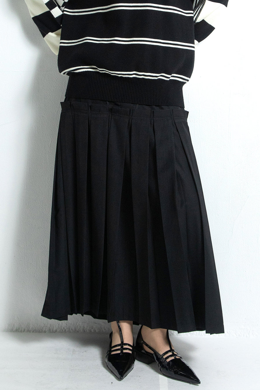 ストレートスカートの途中からBOXプリーツスカートをリメイクしたかのような立体的なデザインが目を惹くスカート。動きに合わせて広がるBOXプリーツはインパクトがあり、シンプルなトップスからセットアップのジャケットまで幅広いスタイリングが楽しめるアイテム。ウエスト周りには、切り替えデザインと同色サテンパイピングを挟み込み、デザインポイントかつ細見え効果も。ゴム仕様でストレスフリーに着られるのも嬉しい。グレーとブラックは無地。ブラウンはヴィンテージライクなピンストライプ。裏地付き。ポケット付き。