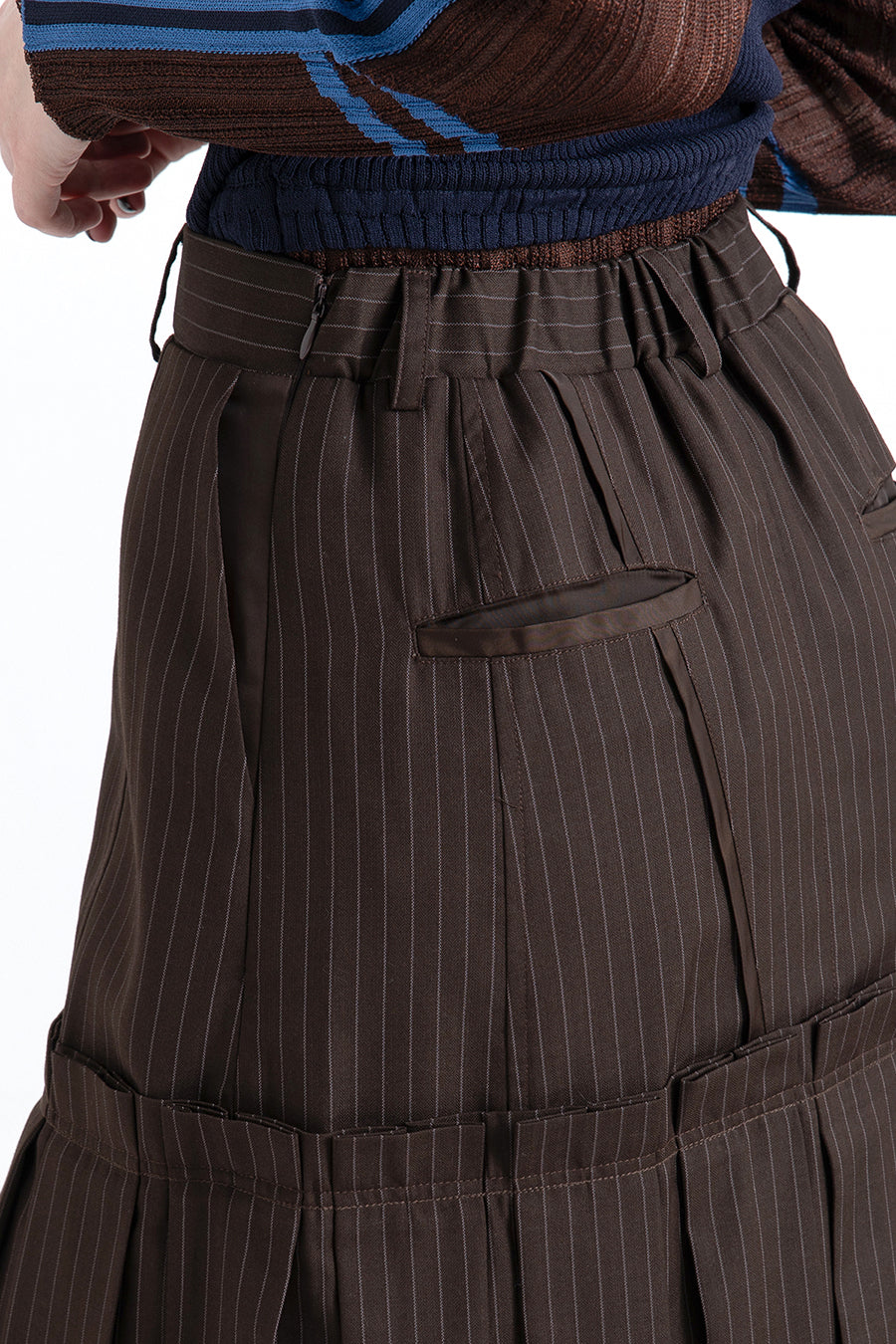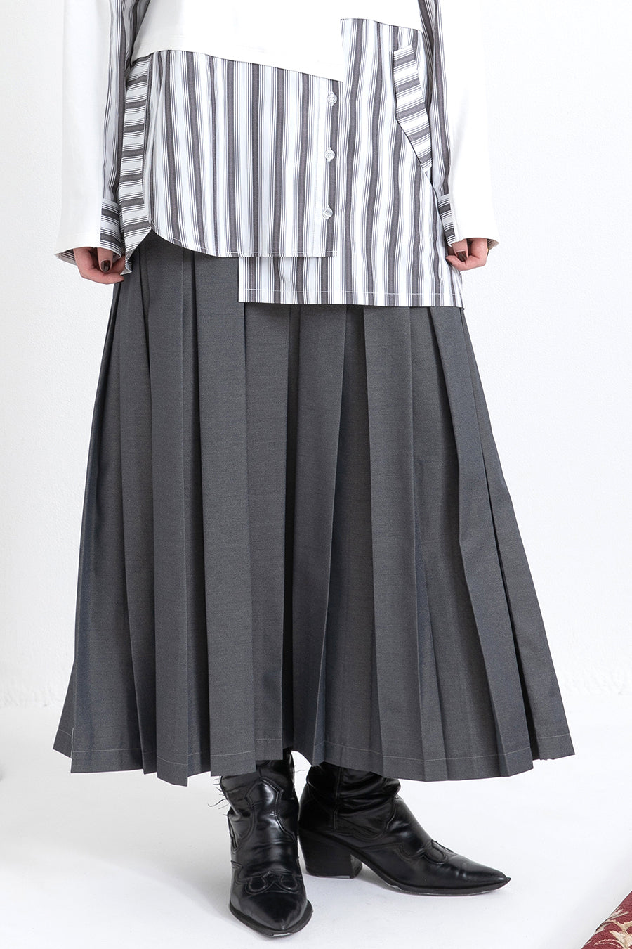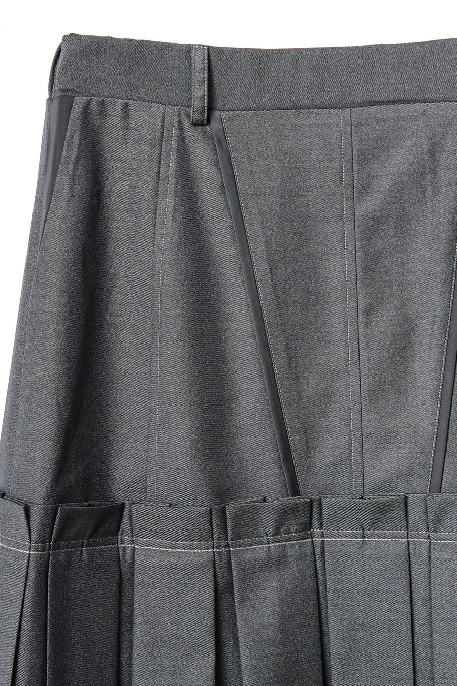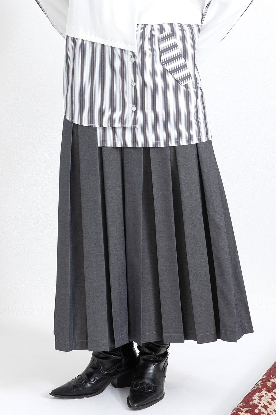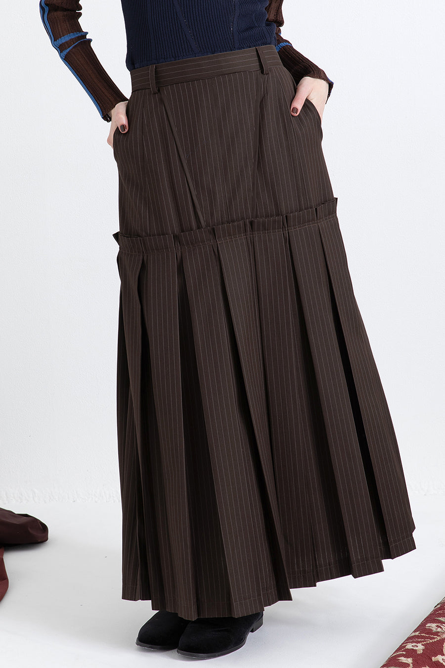 ストレートスカートの途中からBOXプリーツスカートをリメイクしたかのような立体的なデザインが目を惹くスカート。動きに合わせて広がるBOXプリーツはインパクトがあり、シンプルなトップスからセットアップのジャケットまで幅広いスタイリングが楽しめるアイテム。ウエスト周りには、切り替えデザインと同色サテンパイピングを挟み込み、デザインポイントかつ細見え効果も。ゴム仕様でストレスフリーに着られるのも嬉しい。グレーとブラックは無地。ブラウンはヴィンテージライクなピンストライプ。裏地付き。ポケット付き。