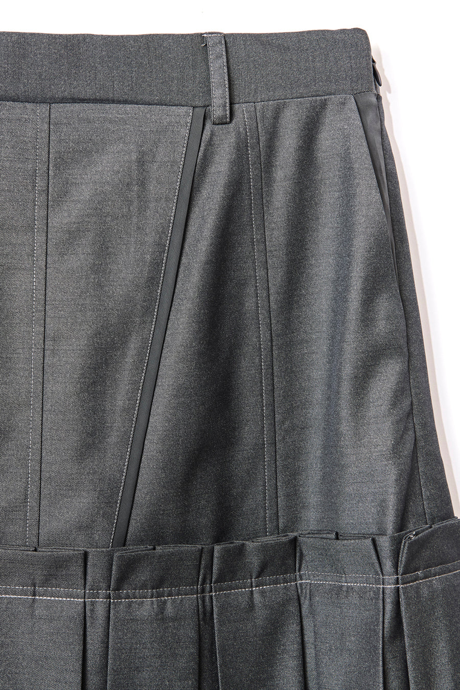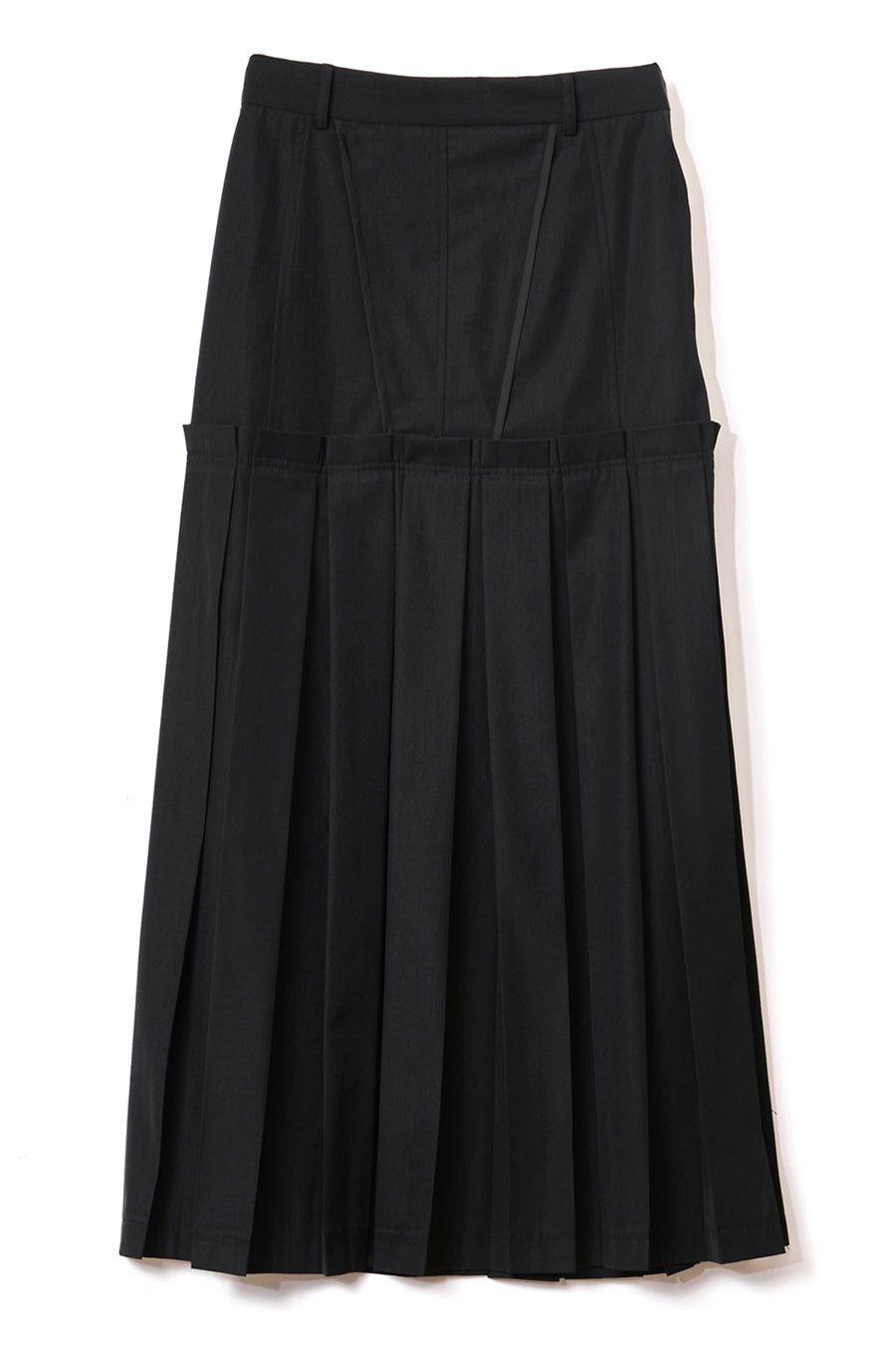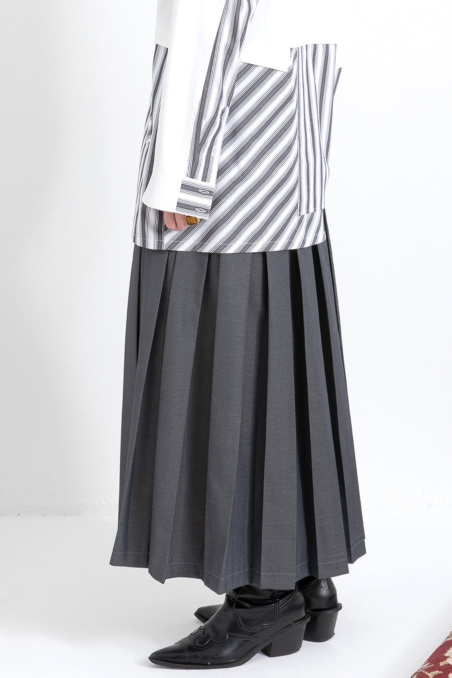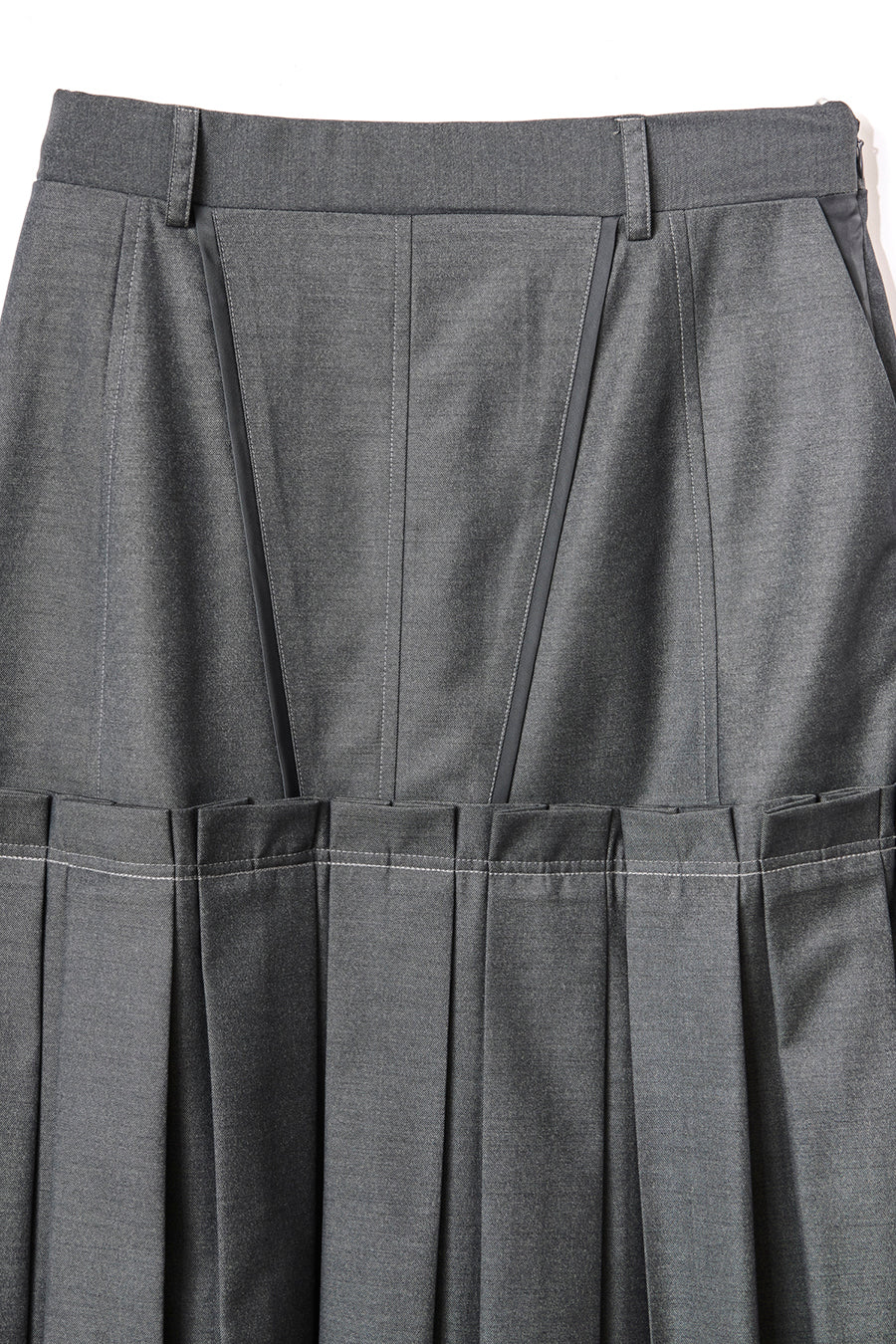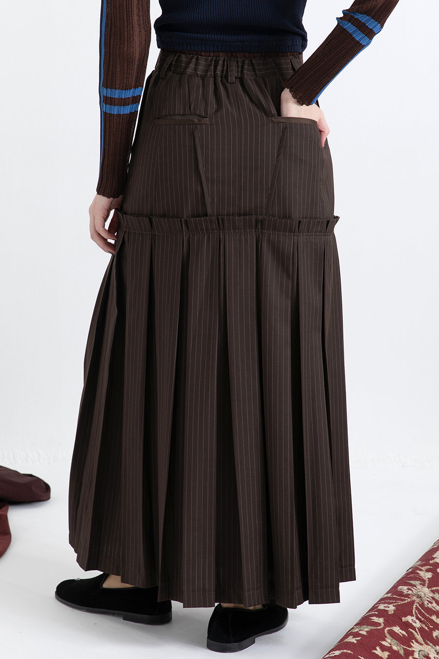 ストレートスカートの途中からBOXプリーツスカートをリメイクしたかのような立体的なデザインが目を惹くスカート。動きに合わせて広がるBOXプリーツはインパクトがあり、シンプルなトップスからセットアップのジャケットまで幅広いスタイリングが楽しめるアイテム。ウエスト周りには、切り替えデザインと同色サテンパイピングを挟み込み、デザインポイントかつ細見え効果も。ゴム仕様でストレスフリーに着られるのも嬉しい。グレーとブラックは無地。ブラウンはヴィンテージライクなピンストライプ。裏地付き。ポケット付き。