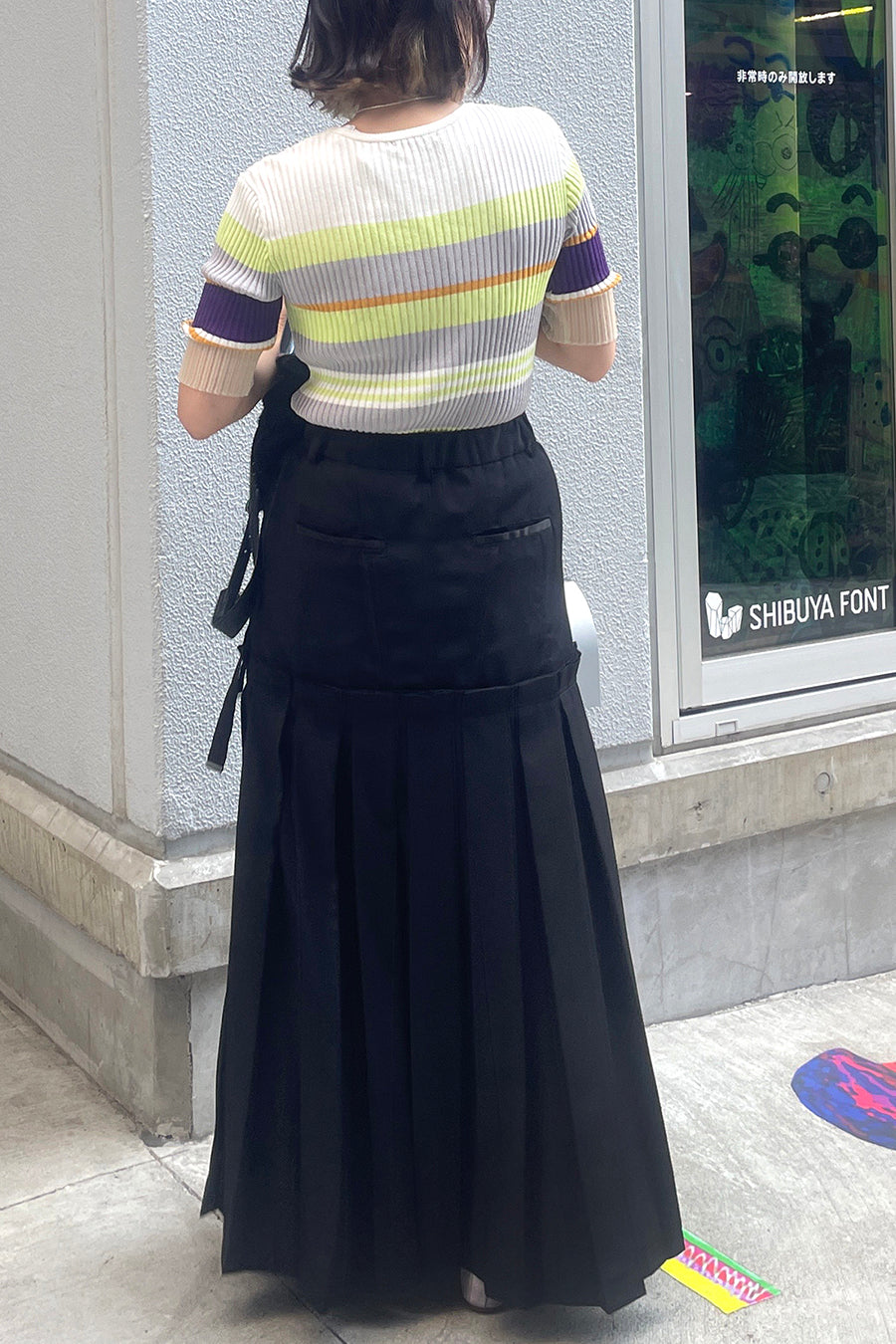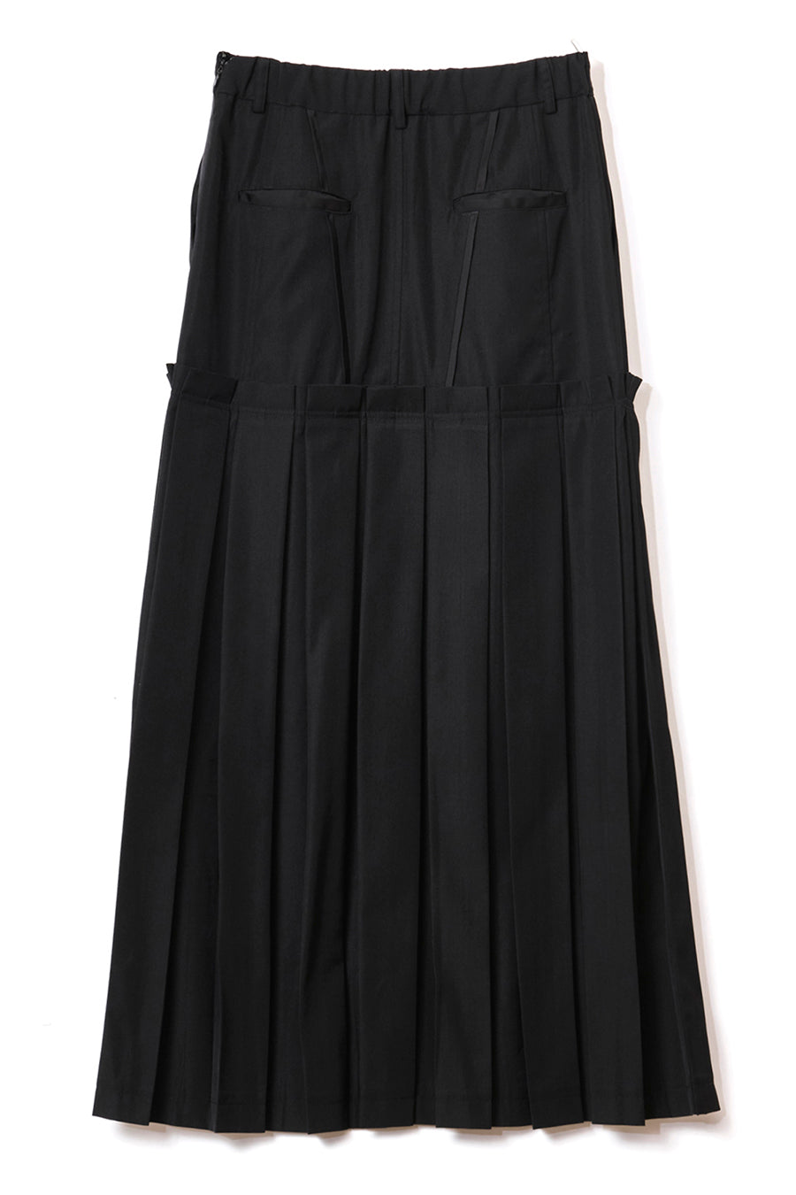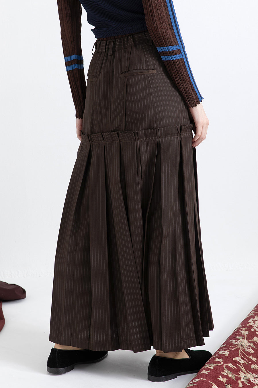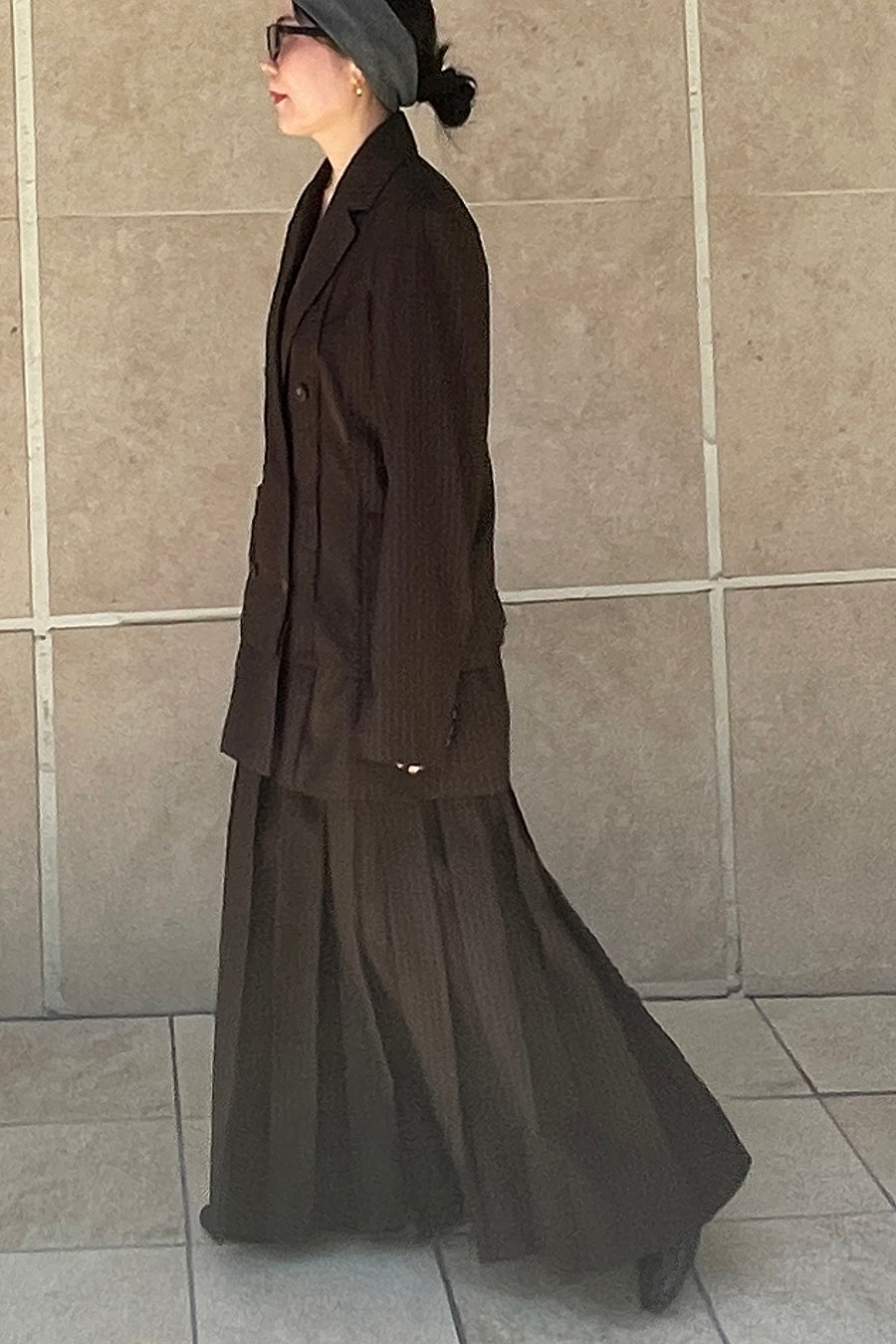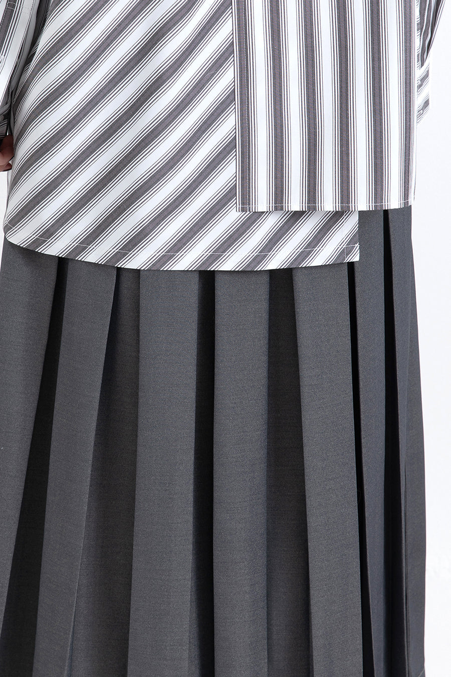 ストレートスカートの途中からBOXプリーツスカートをリメイクしたかのような立体的なデザインが目を惹くスカート。動きに合わせて広がるBOXプリーツはインパクトがあり、シンプルなトップスからセットアップのジャケットまで幅広いスタイリングが楽しめるアイテム。ウエスト周りには、切り替えデザインと同色サテンパイピングを挟み込み、デザインポイントかつ細見え効果も。ゴム仕様でストレスフリーに着られるのも嬉しい。グレーとブラックは無地。ブラウンはヴィンテージライクなピンストライプ。裏地付き。ポケット付き。