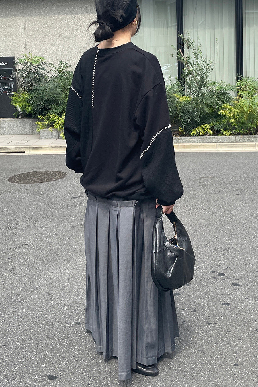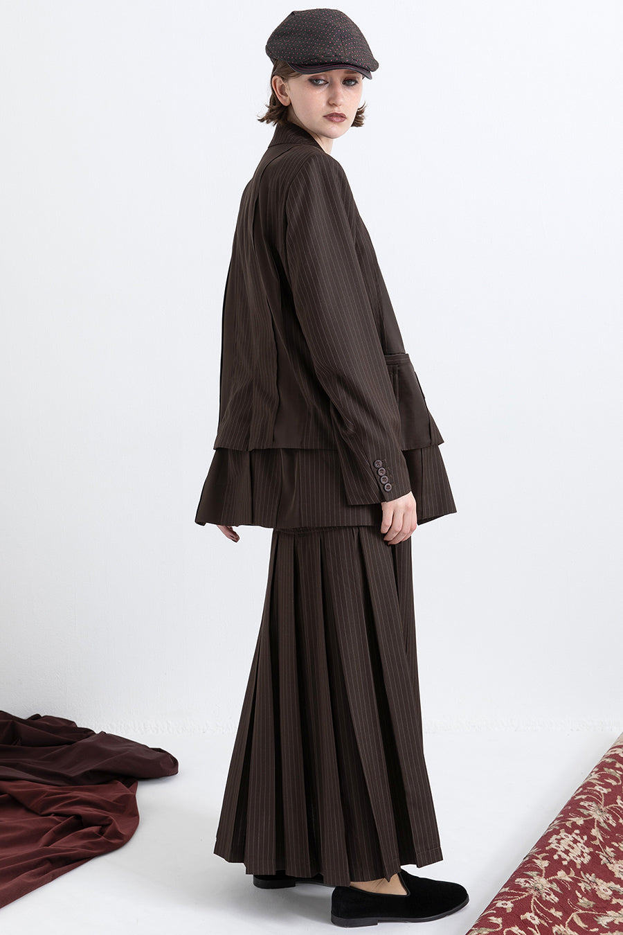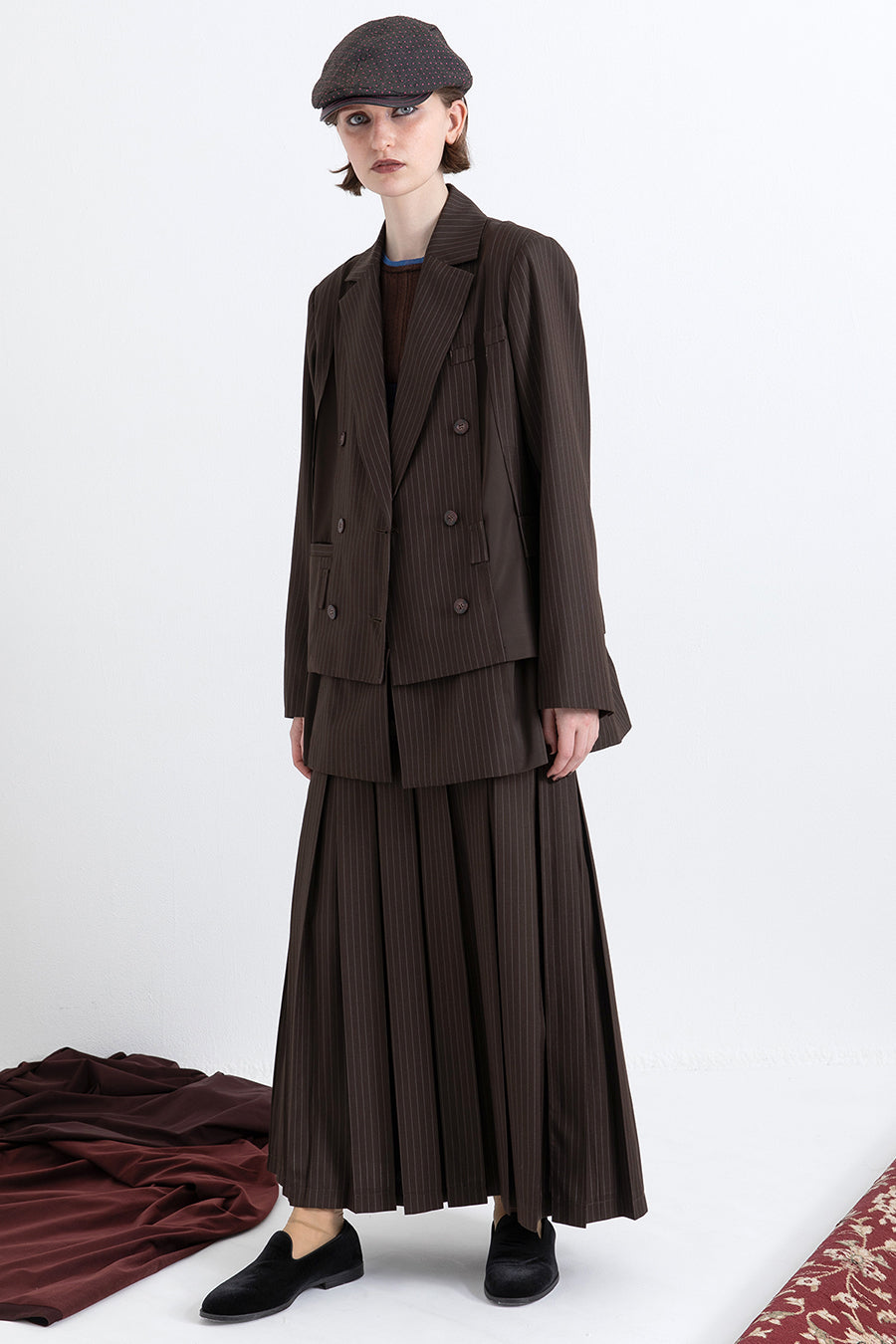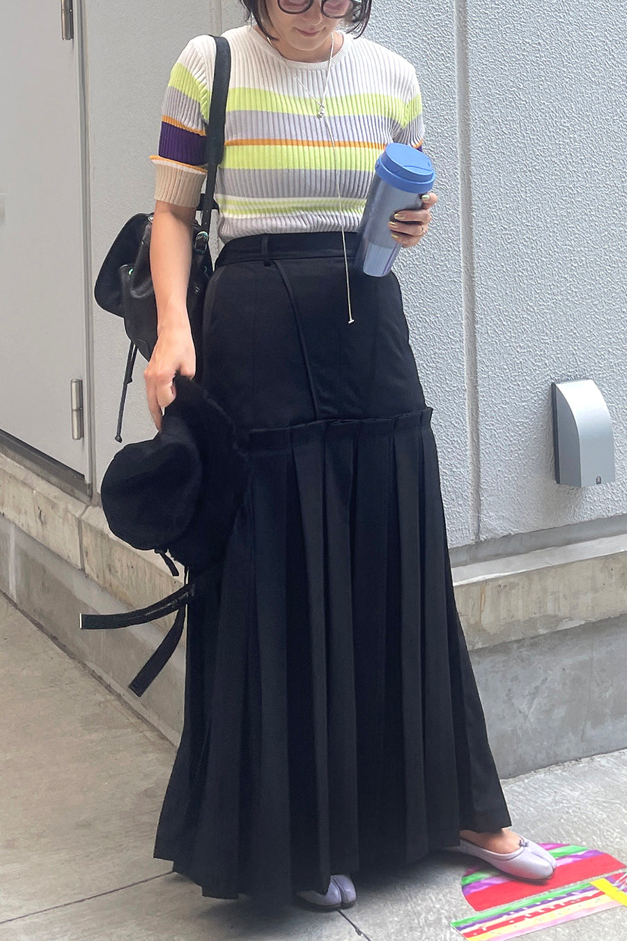ストレートスカートの途中からBOXプリーツスカートをリメイクしたかのような立体的なデザインが目を惹くスカート。動きに合わせて広がるBOXプリーツはインパクトがあり、シンプルなトップスからセットアップのジャケットまで幅広いスタイリングが楽しめるアイテム。ウエスト周りには、切り替えデザインと同色サテンパイピングを挟み込み、デザインポイントかつ細見え効果も。ゴム仕様でストレスフリーに着られるのも嬉しい。グレーとブラックは無地。ブラウンはヴィンテージライクなピンストライプ。裏地付き。ポケット付き。