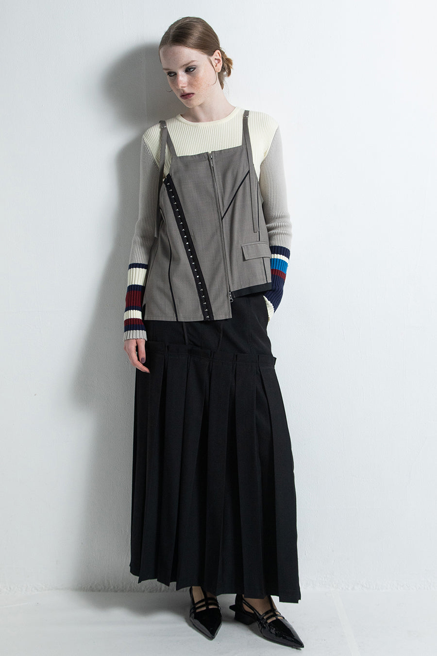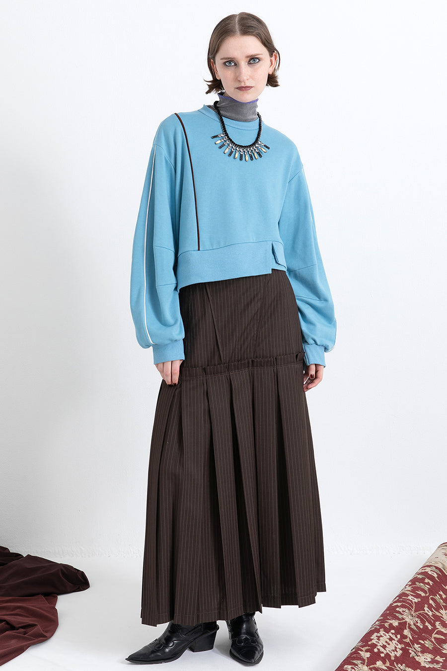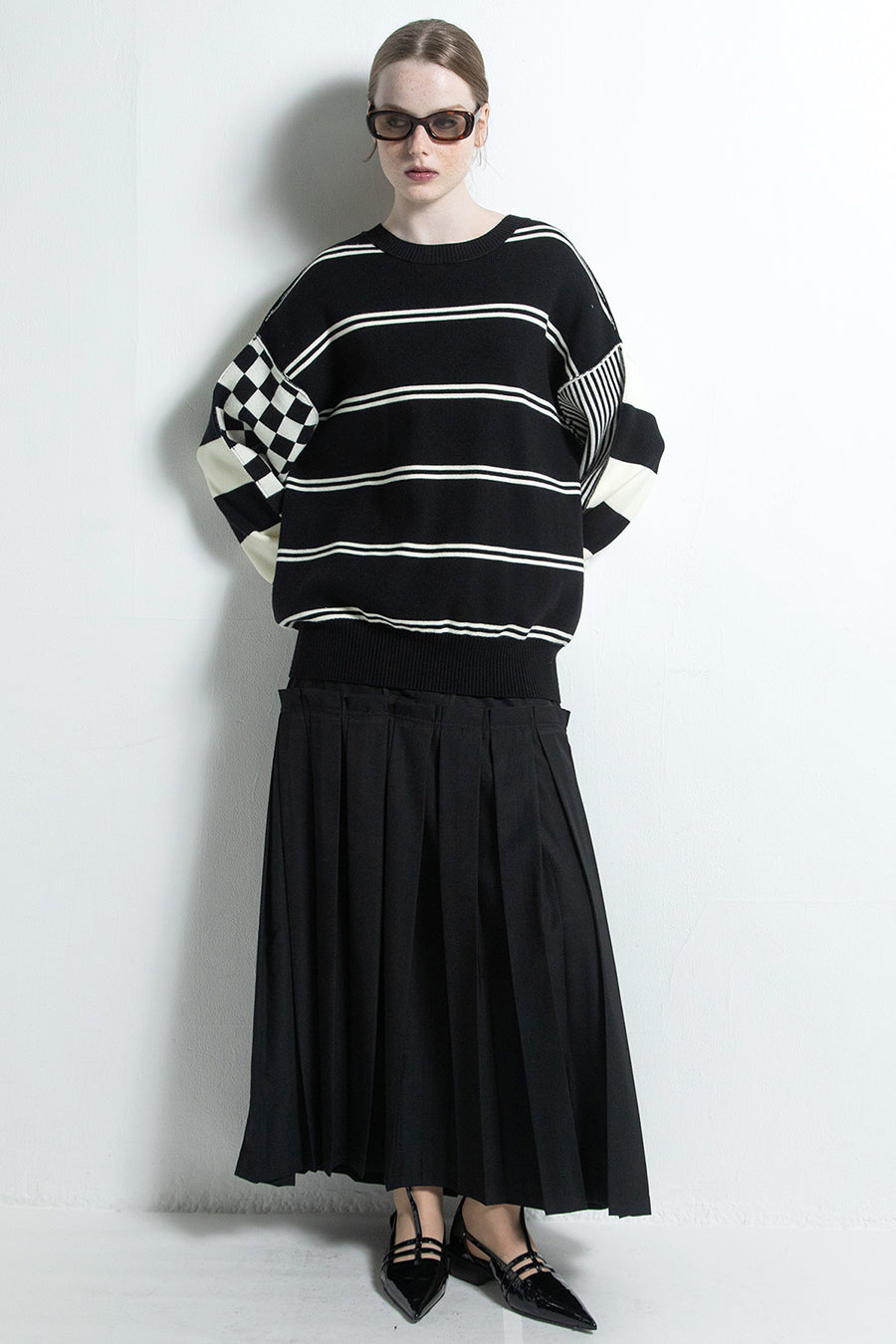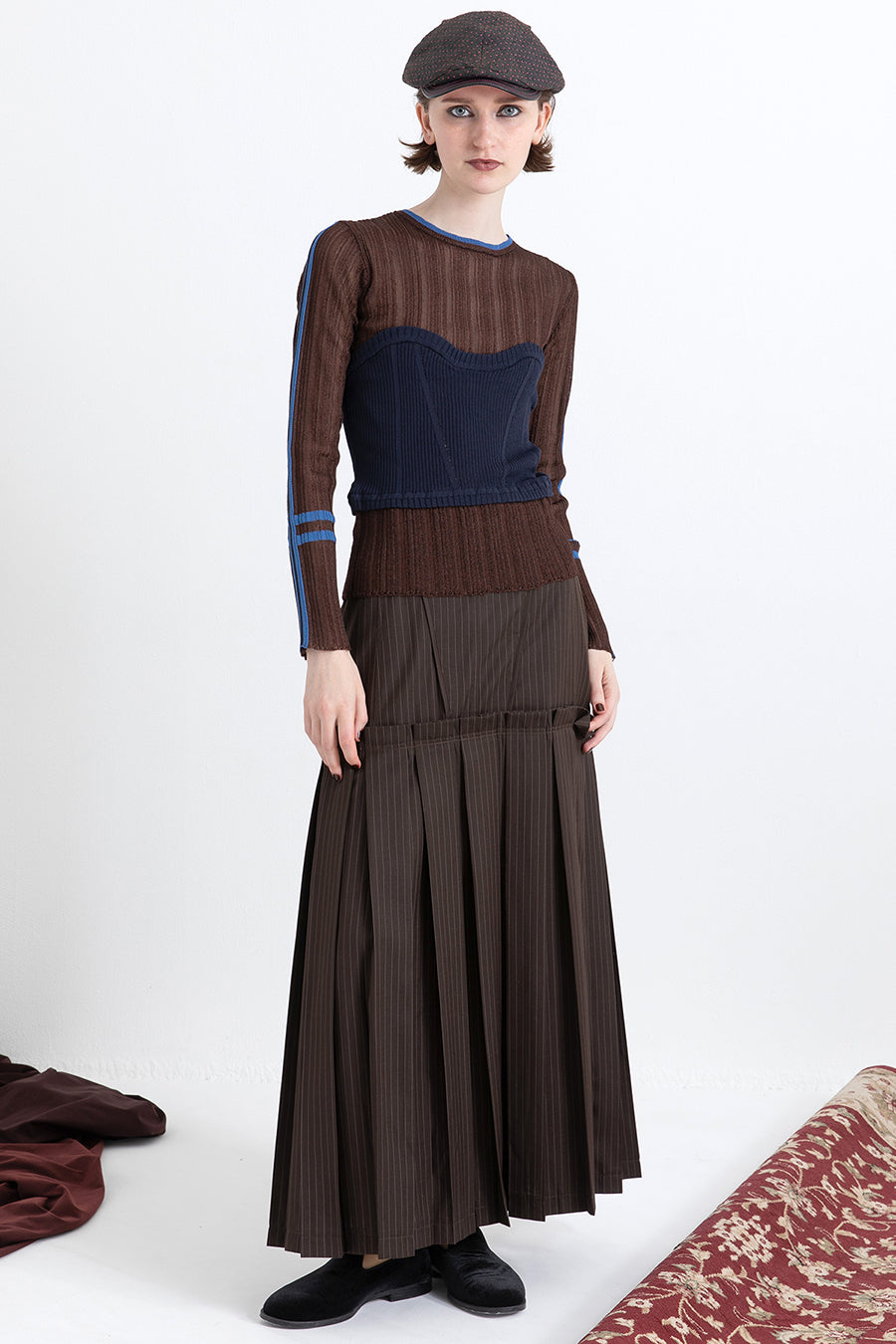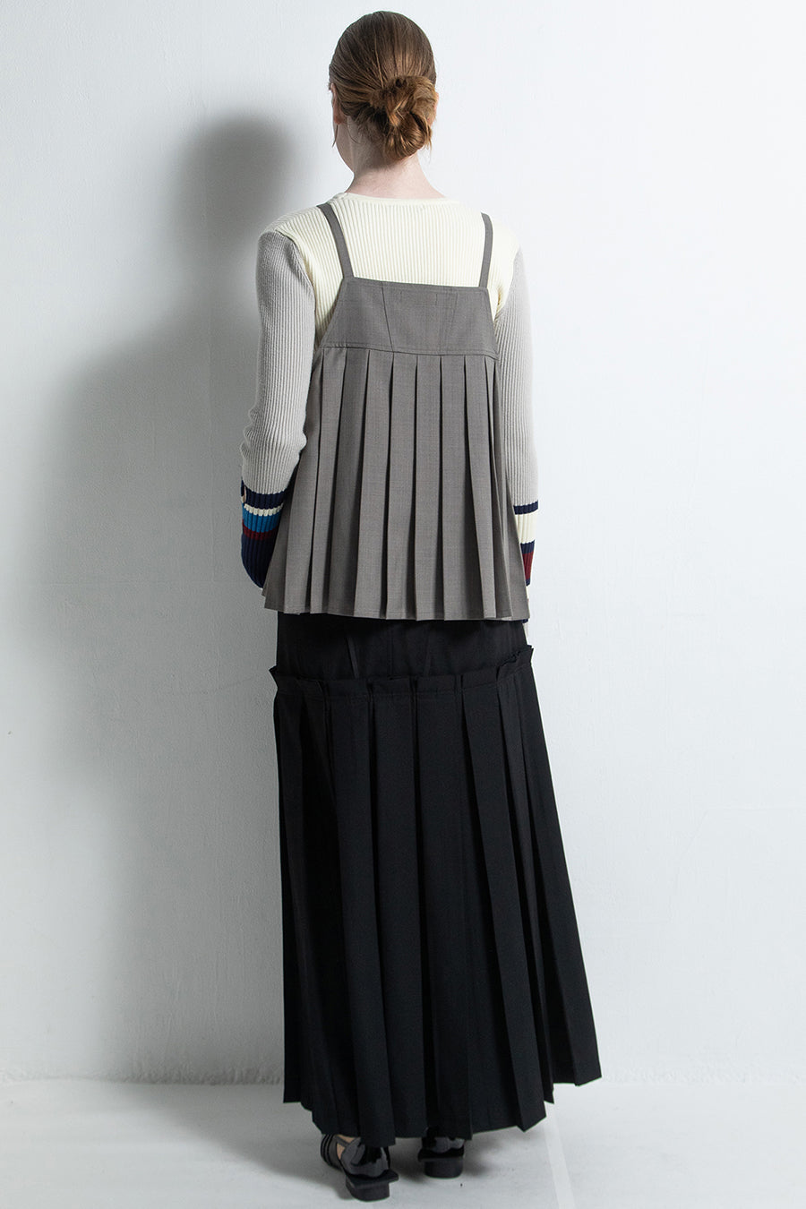 ストレートスカートの途中からBOXプリーツスカートをリメイクしたかのような立体的なデザインが目を惹くスカート。動きに合わせて広がるBOXプリーツはインパクトがあり、シンプルなトップスからセットアップのジャケットまで幅広いスタイリングが楽しめるアイテム。ウエスト周りには、切り替えデザインと同色サテンパイピングを挟み込み、デザインポイントかつ細見え効果も。ゴム仕様でストレスフリーに着られるのも嬉しい。グレーとブラックは無地。ブラウンはヴィンテージライクなピンストライプ。裏地付き。ポケット付き。