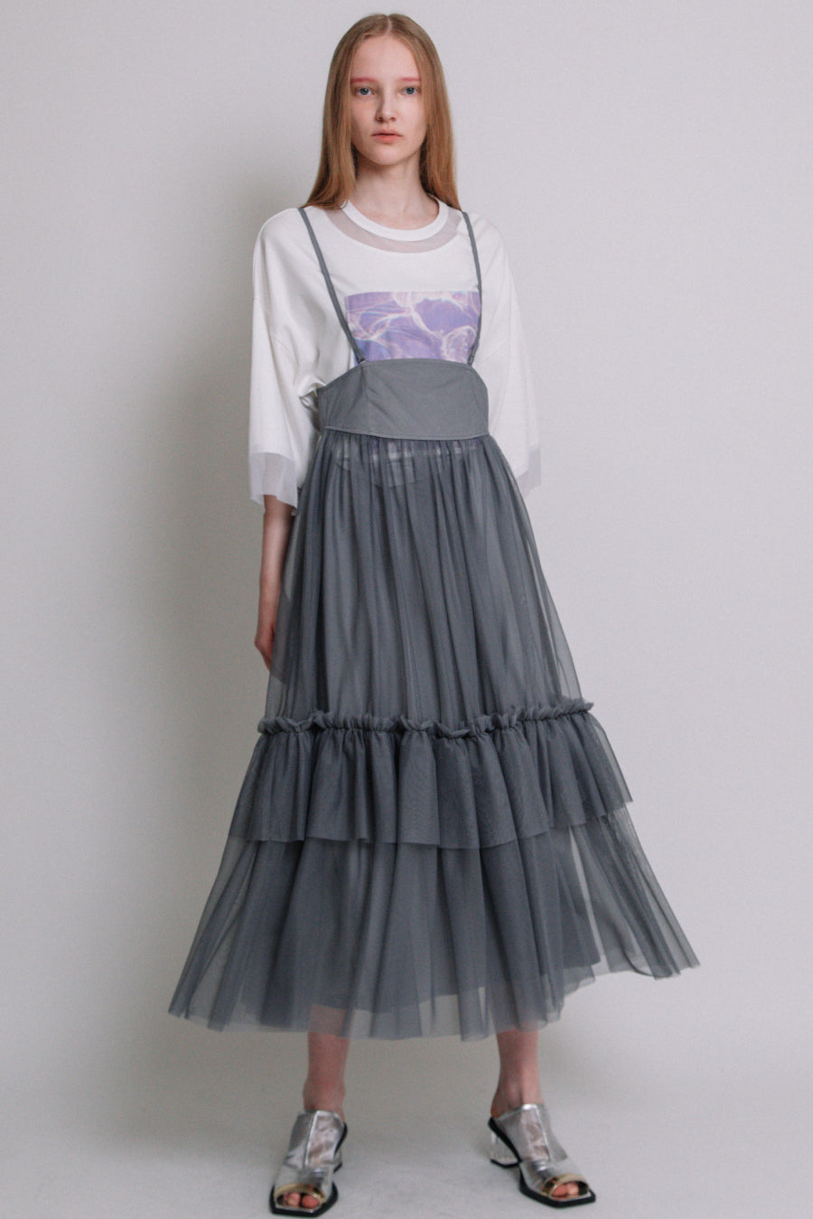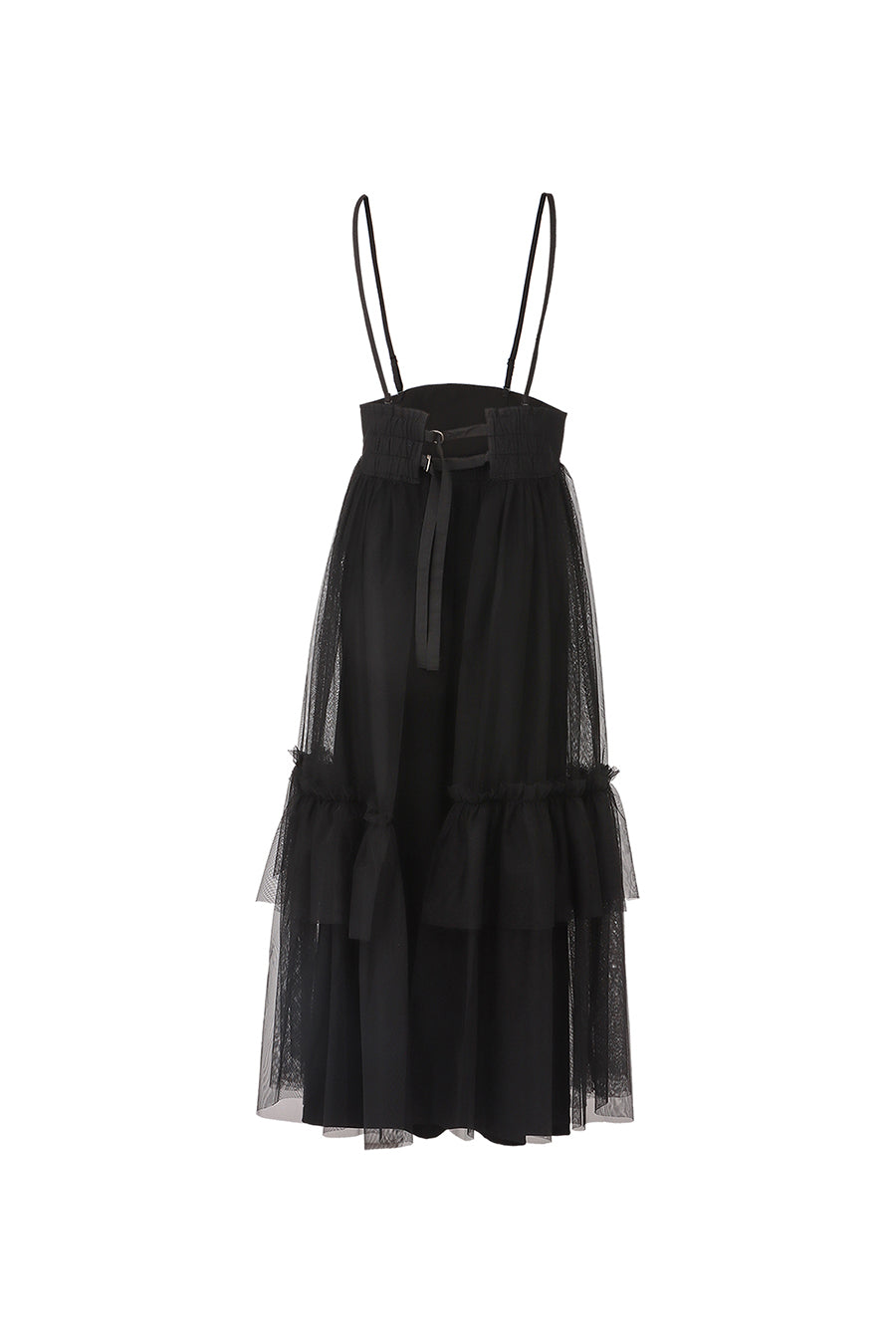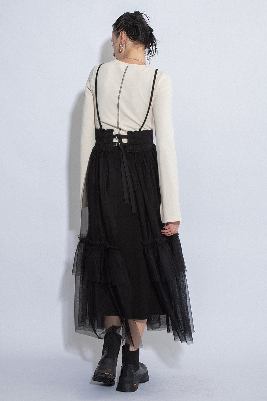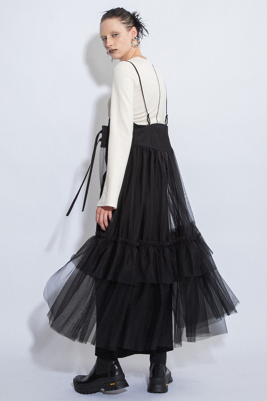 スカートにもキャミワンピースにもなる着回し抜群のチュールティアードスカート。肩ひもは取り外し出来、前後2WAY仕様なのでスタイリングに合わせて多様な着こなしを楽しめるアイテム。