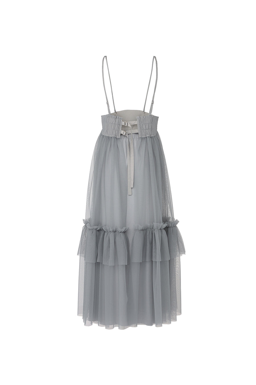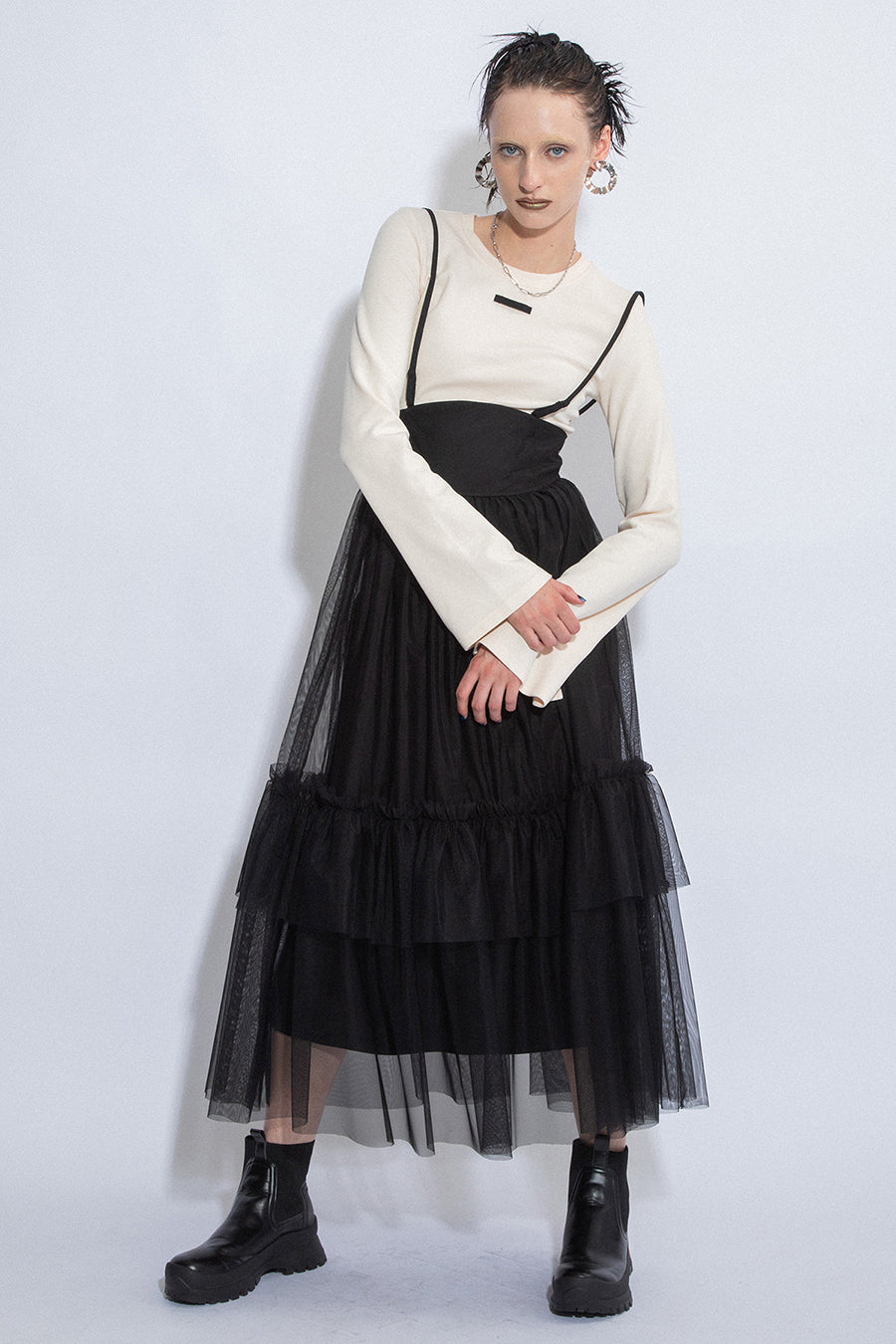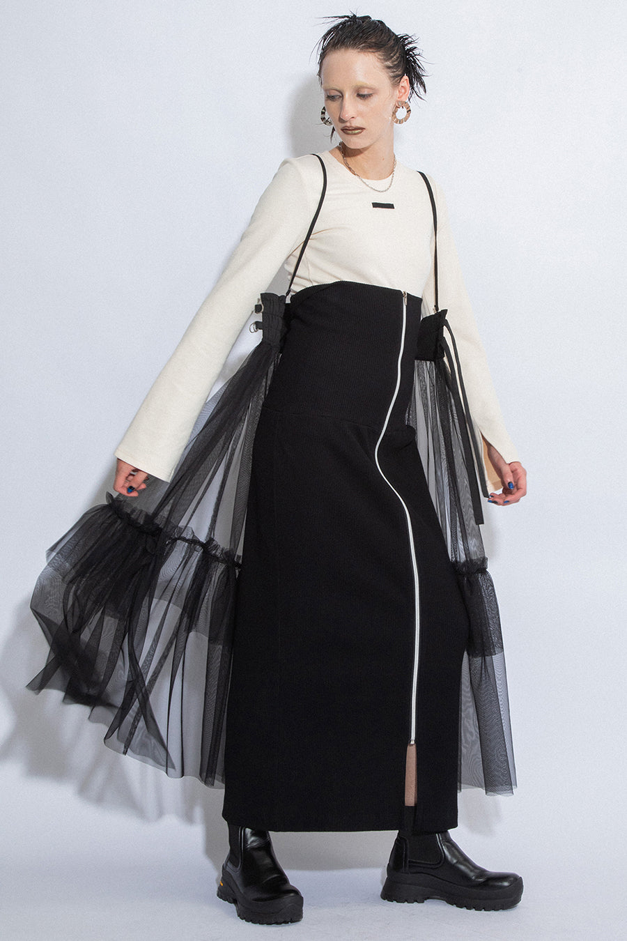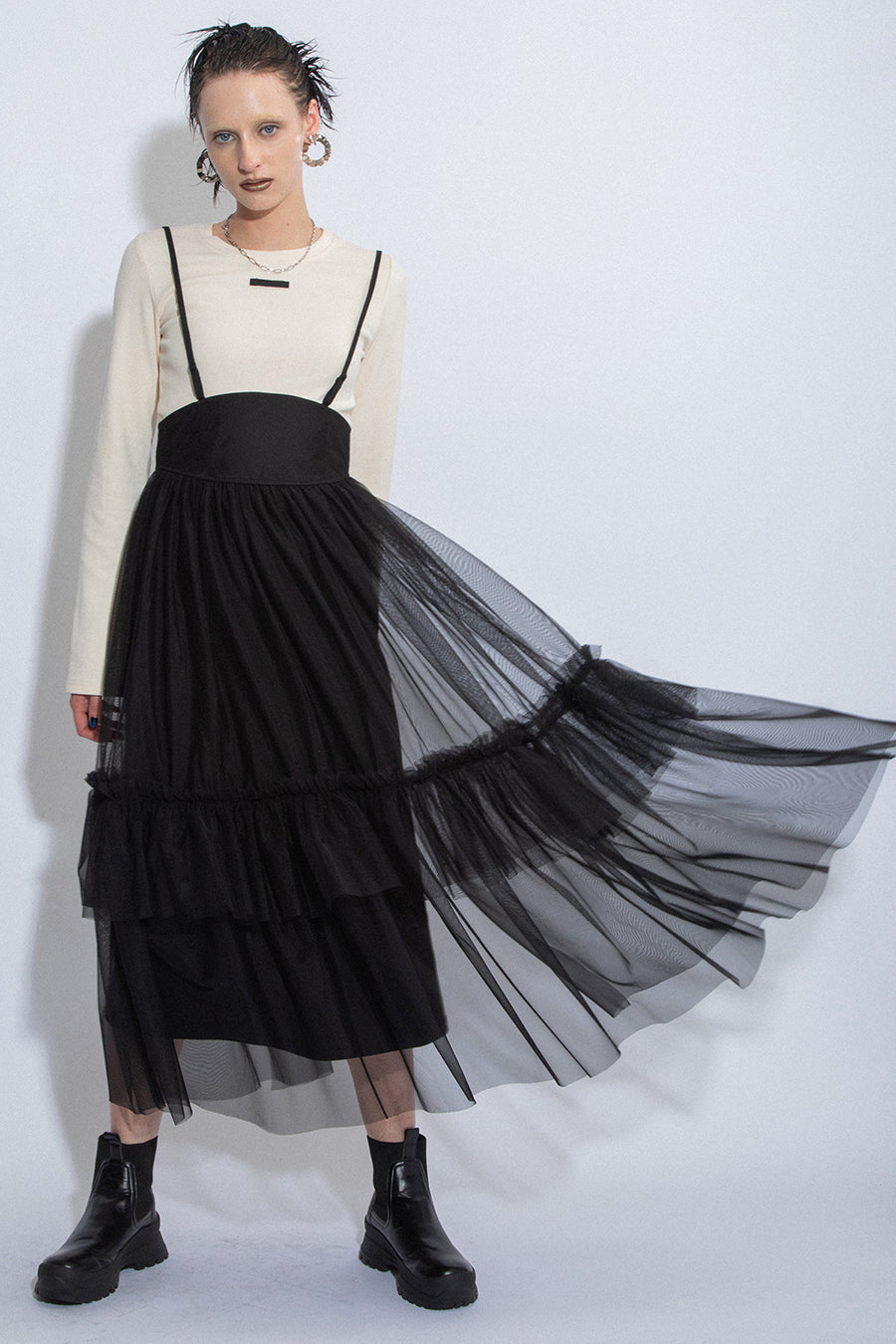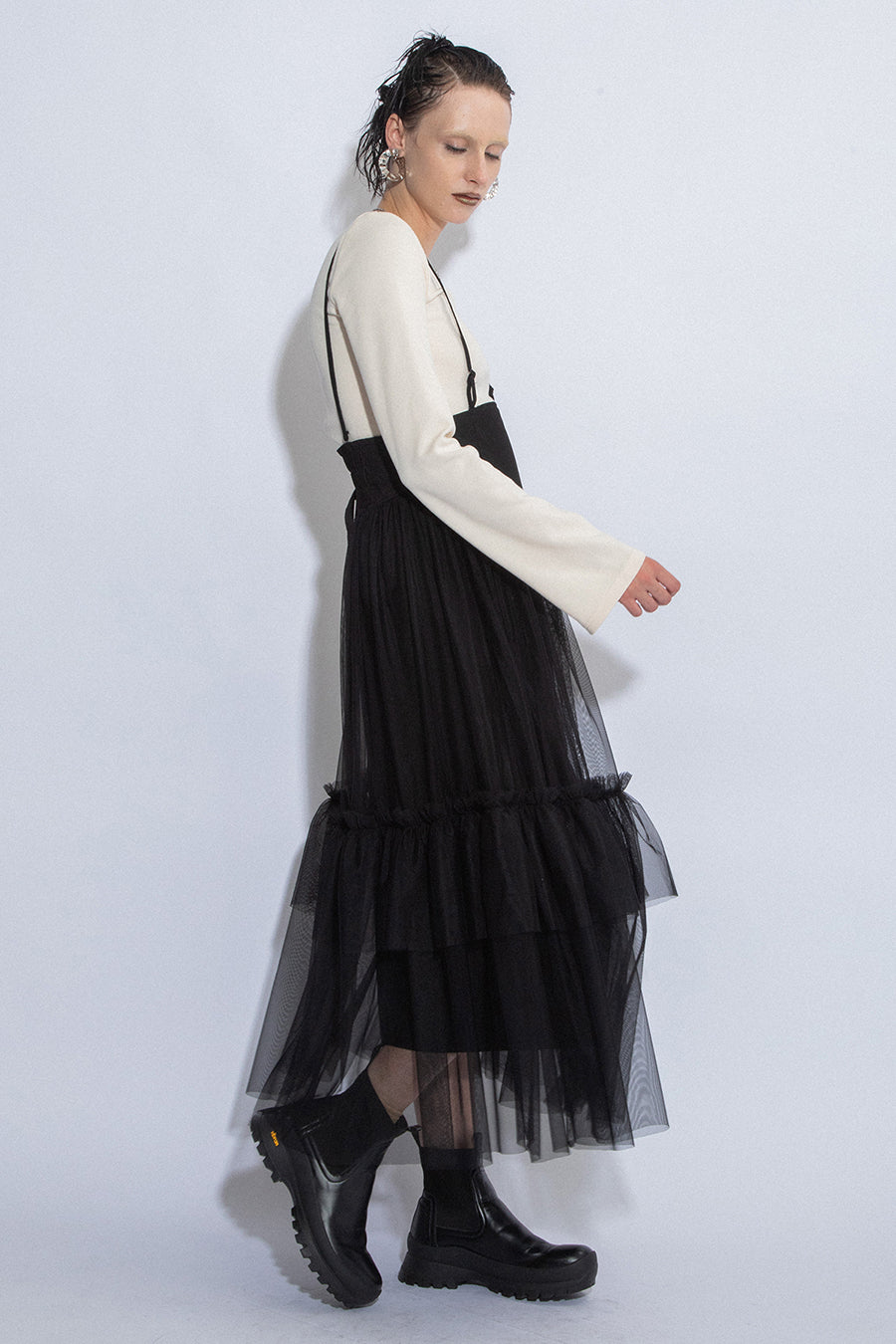 スカートにもキャミワンピースにもなる着回し抜群のチュールティアードスカート。肩ひもは取り外し出来、前後2WAY仕様なのでスタイリングに合わせて多様な着こなしを楽しめるアイテム。