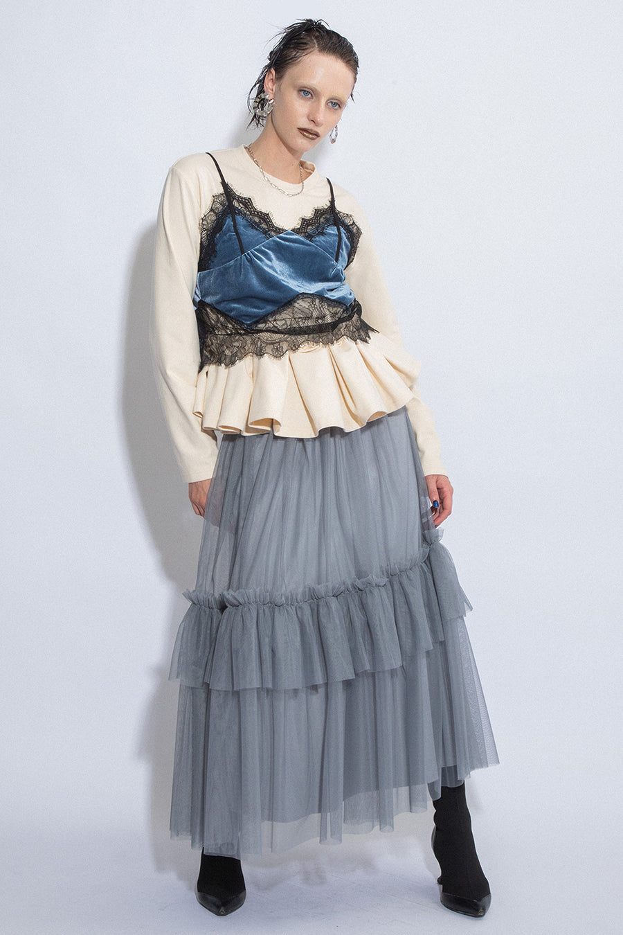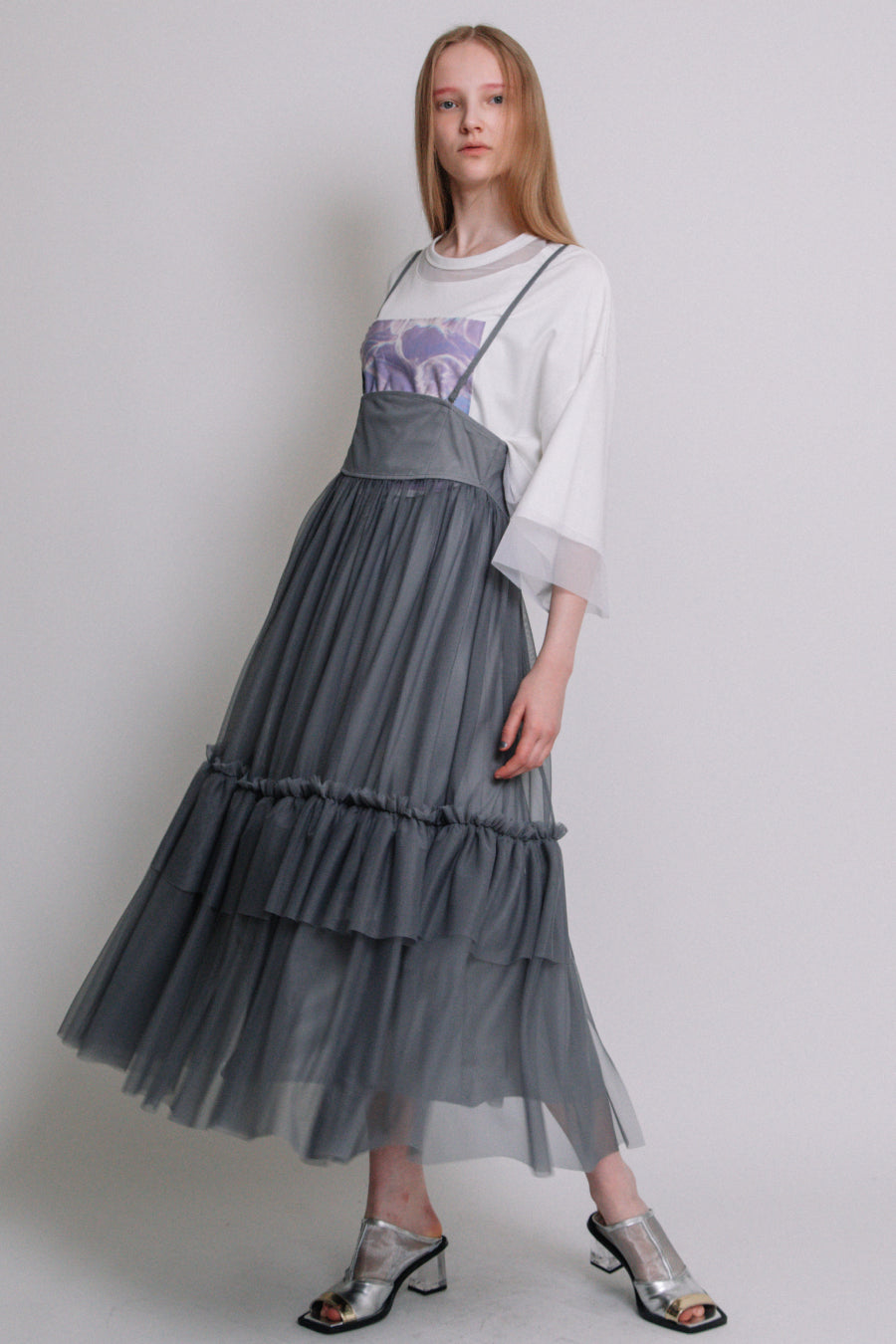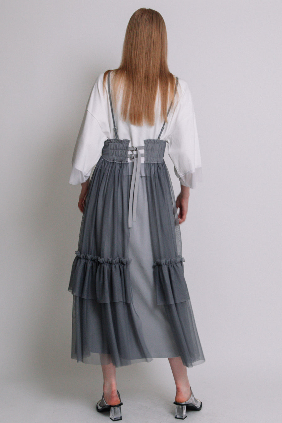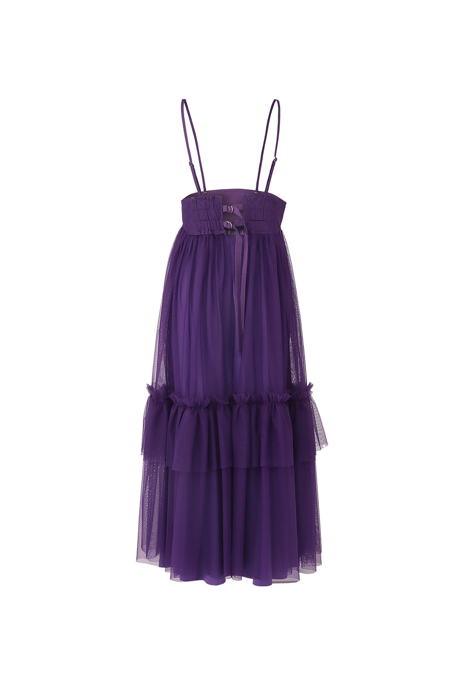 スカートにもキャミワンピースにもなる着回し抜群のチュールティアードスカート。肩ひもは取り外し出来、前後2WAY仕様なのでスタイリングに合わせて多様な着こなしを楽しめるアイテム。
