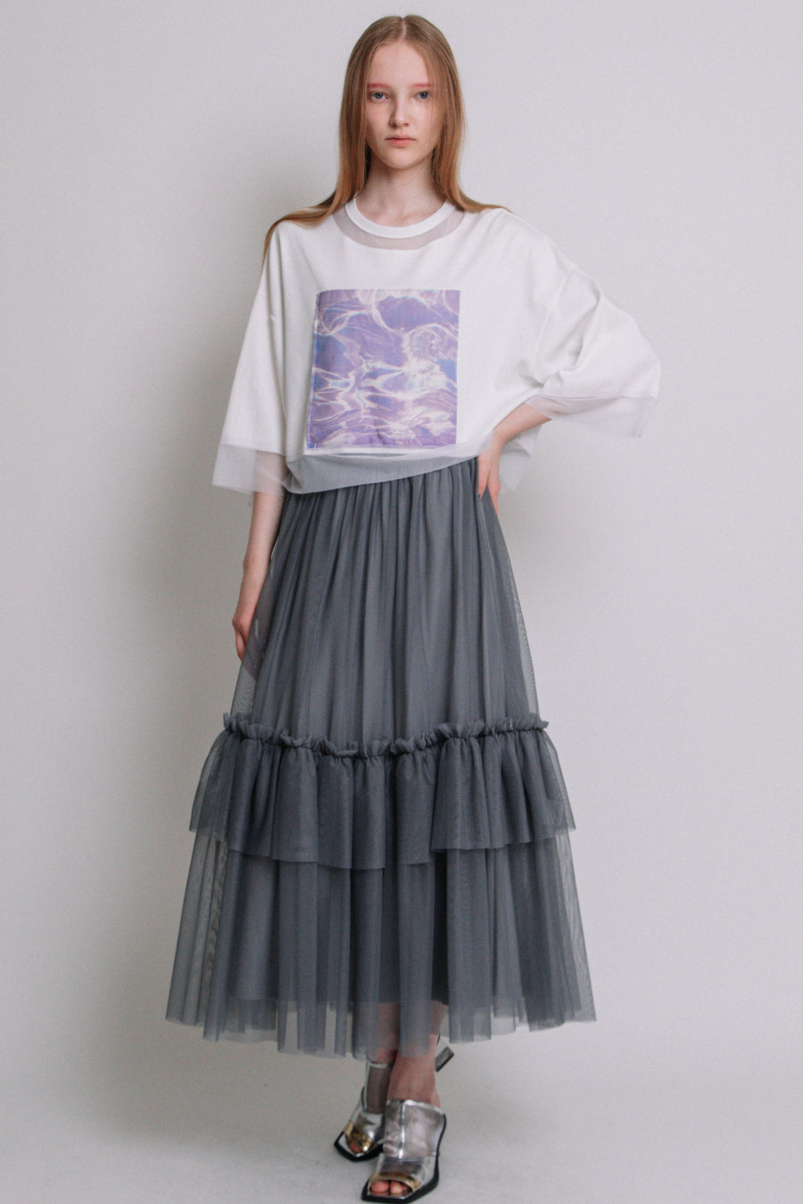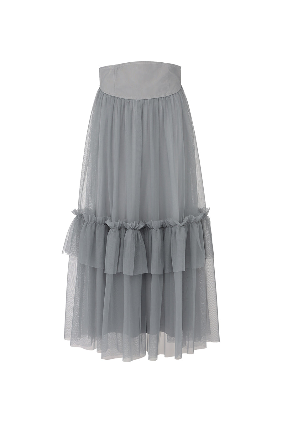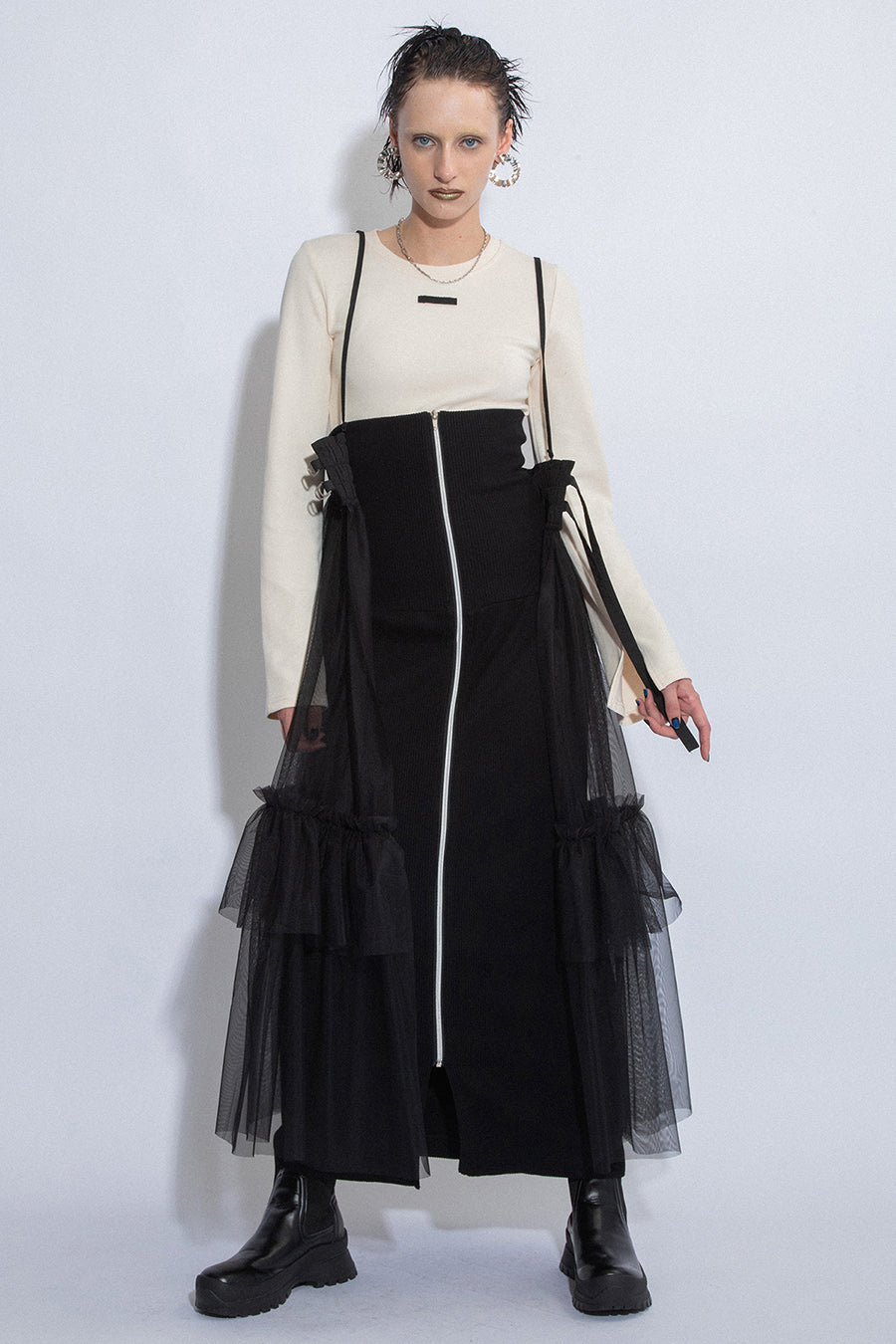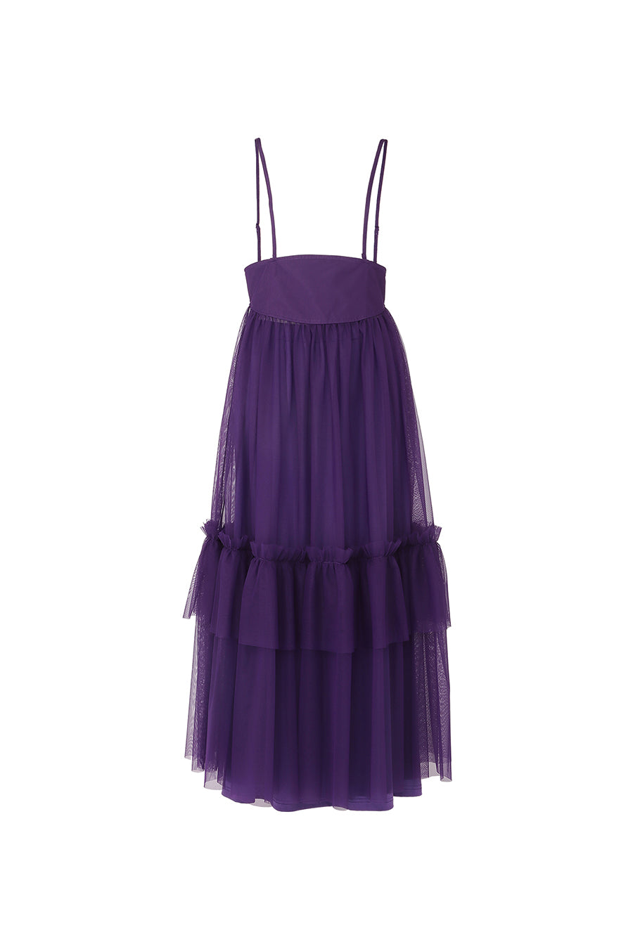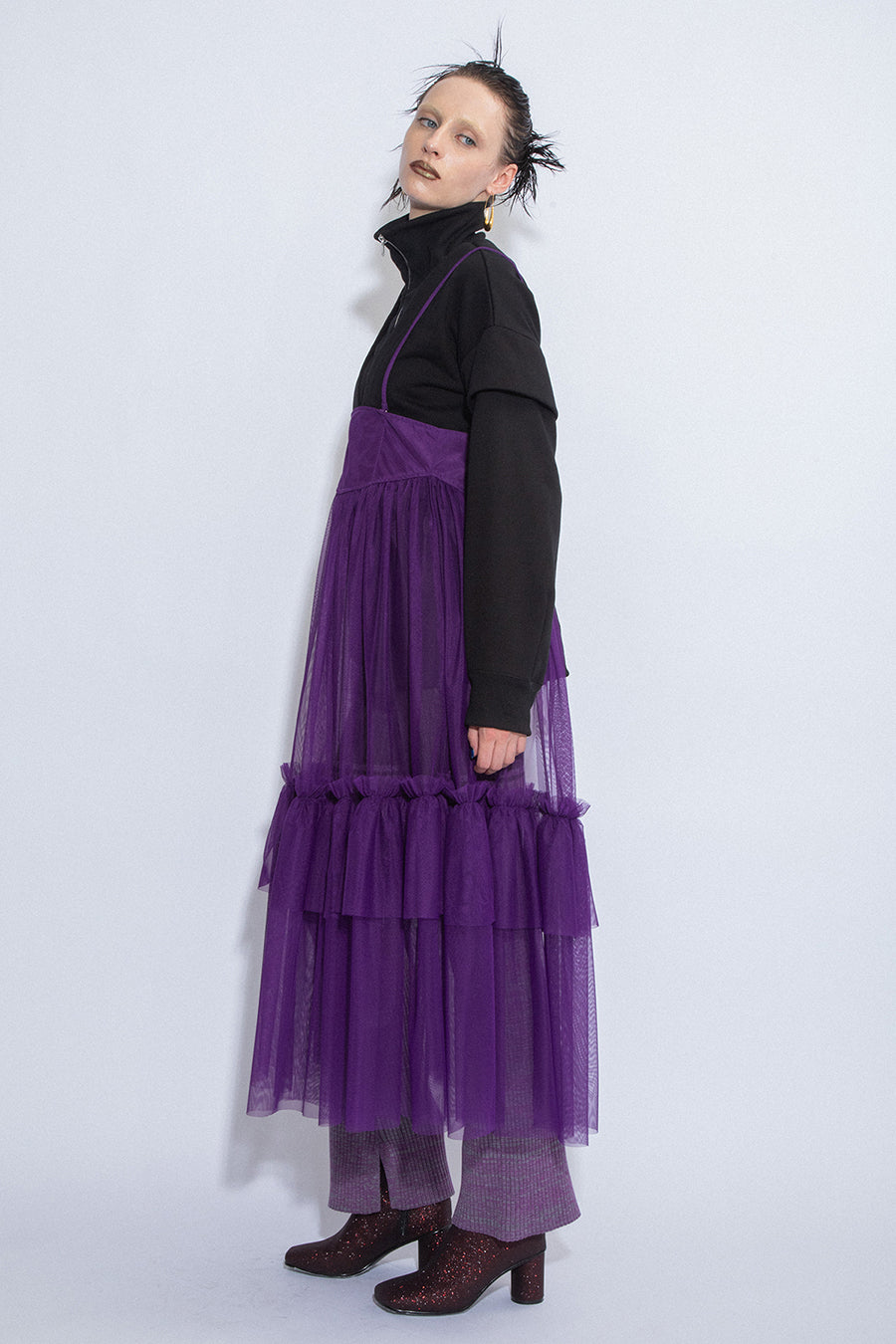 スカートにもキャミワンピースにもなる着回し抜群のチュールティアードスカート。肩ひもは取り外し出来、前後2WAY仕様なのでスタイリングに合わせて多様な着こなしを楽しめるアイテム。