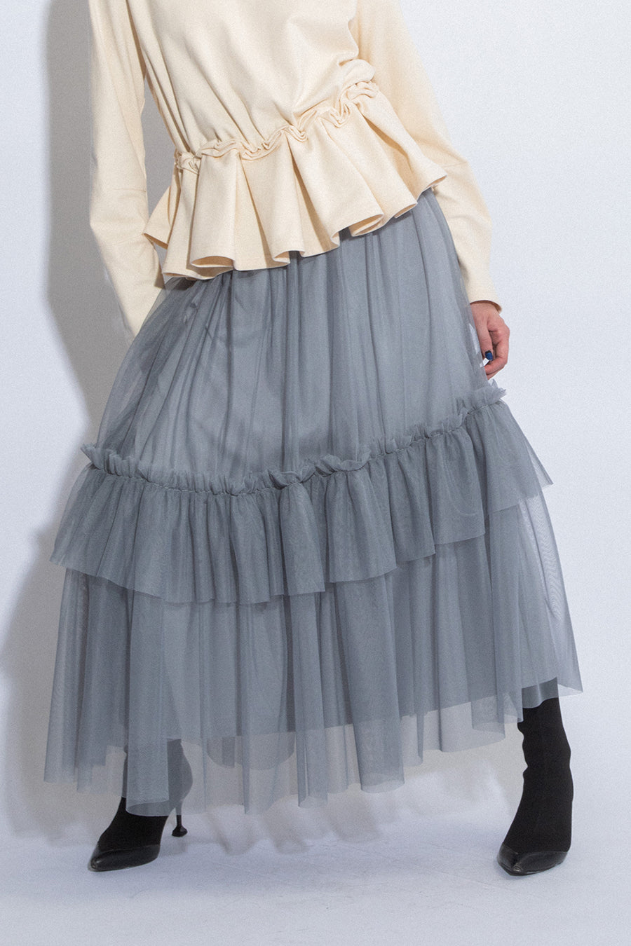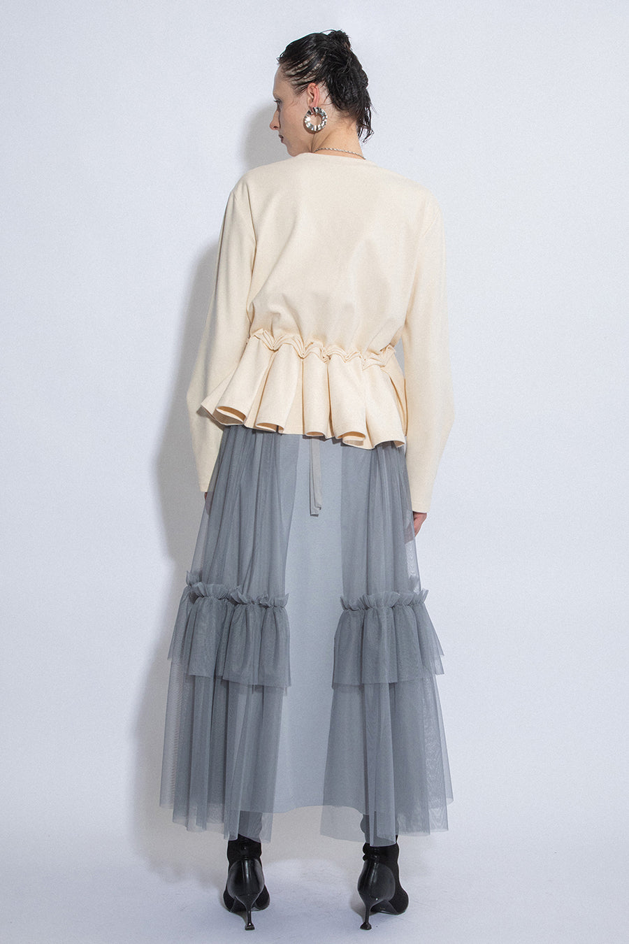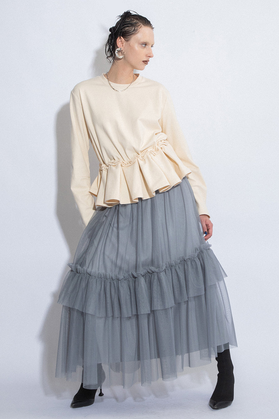 チュールをたっぷりと贅沢に使用していますが、ソフトチュールなのでボリュームが出すぎることなく、大人の華やかな雰囲気とレディライクな印象に。
