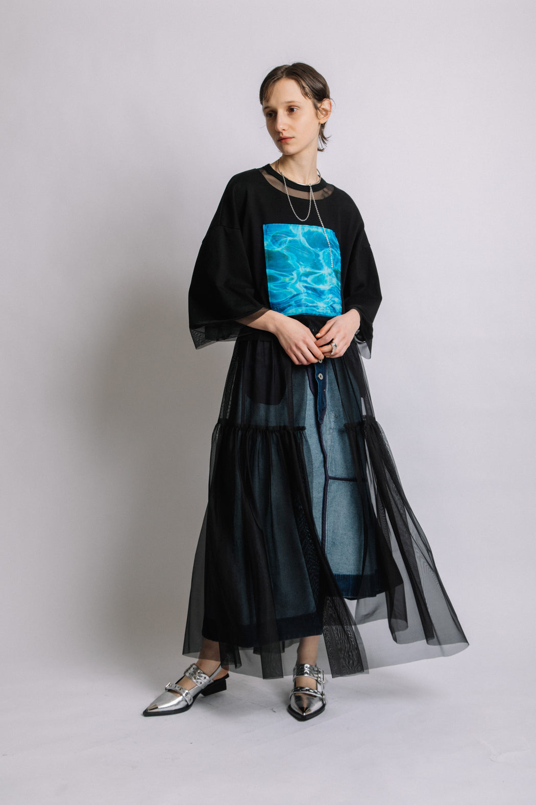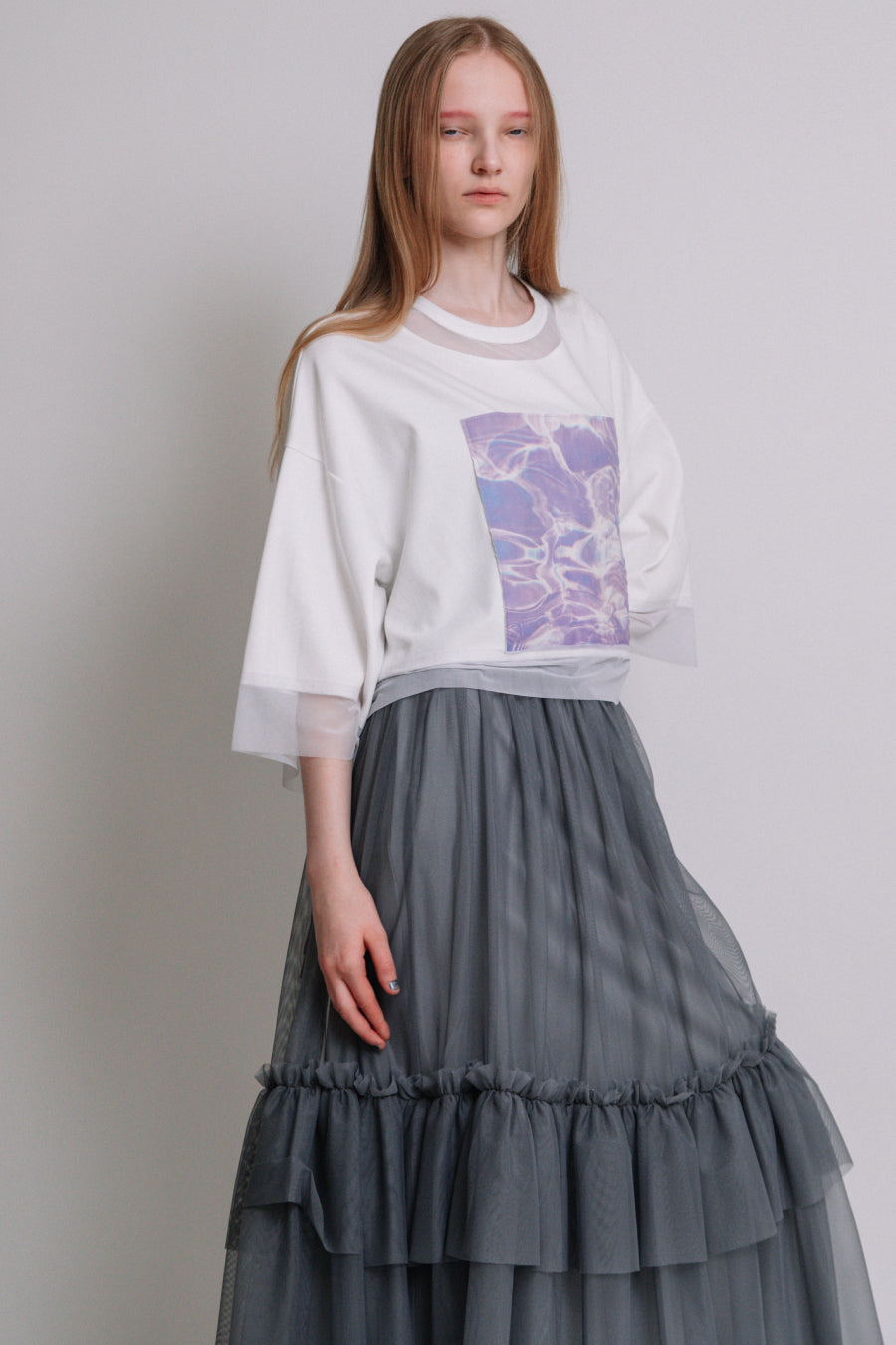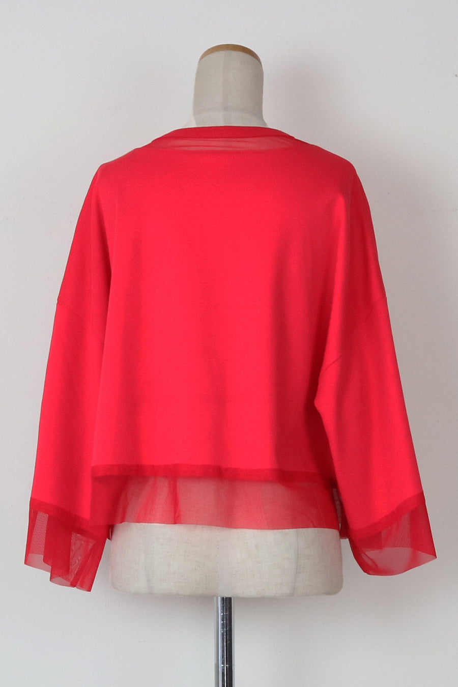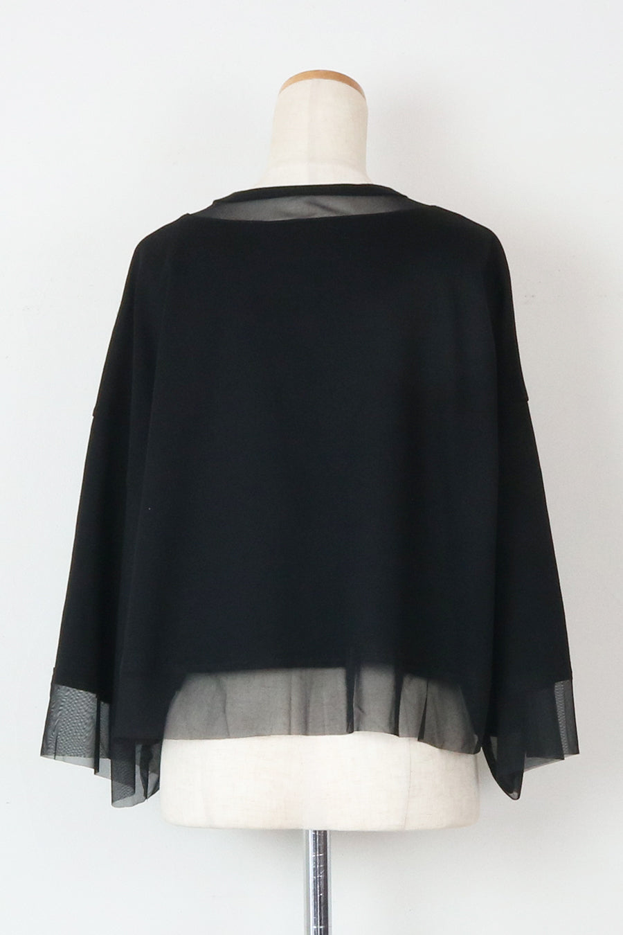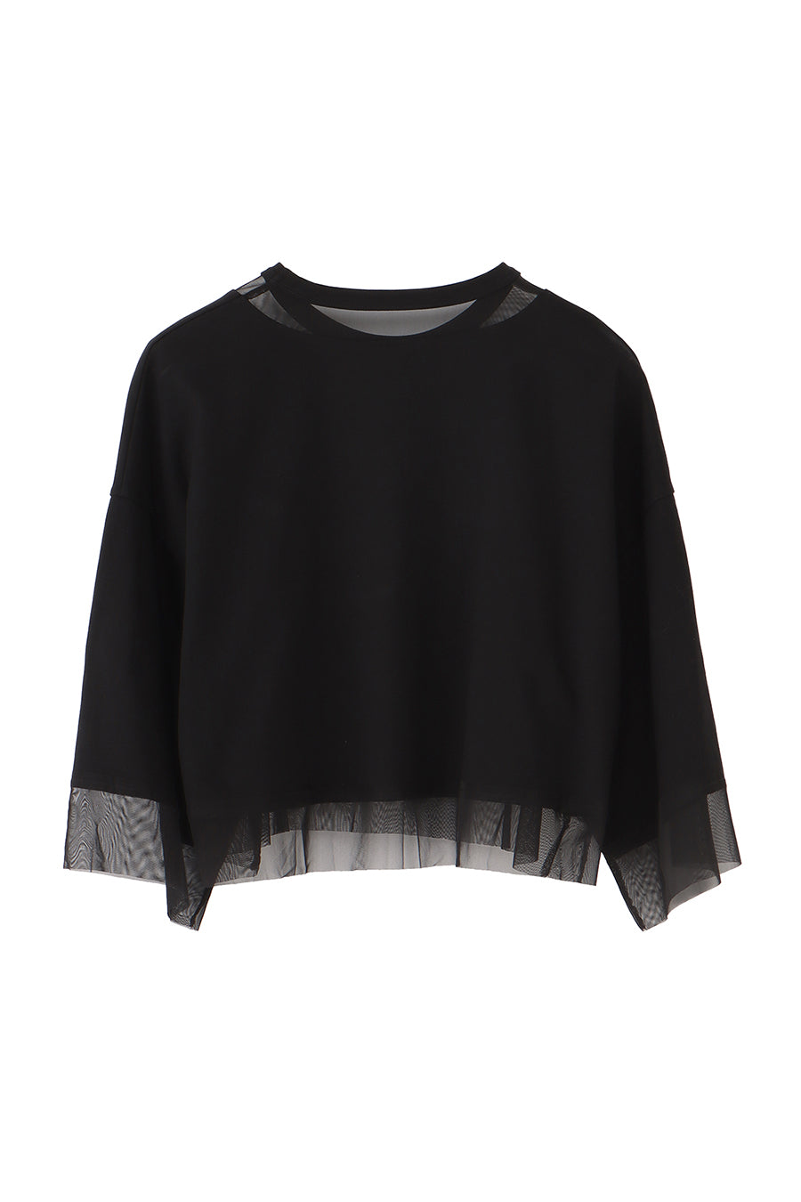 身頃は透けないコットンスムースを使用し、襟ぐり、袖口、裾は異素材チュールで切り替えた春夏らしい軽やかで涼しげなデザイン。