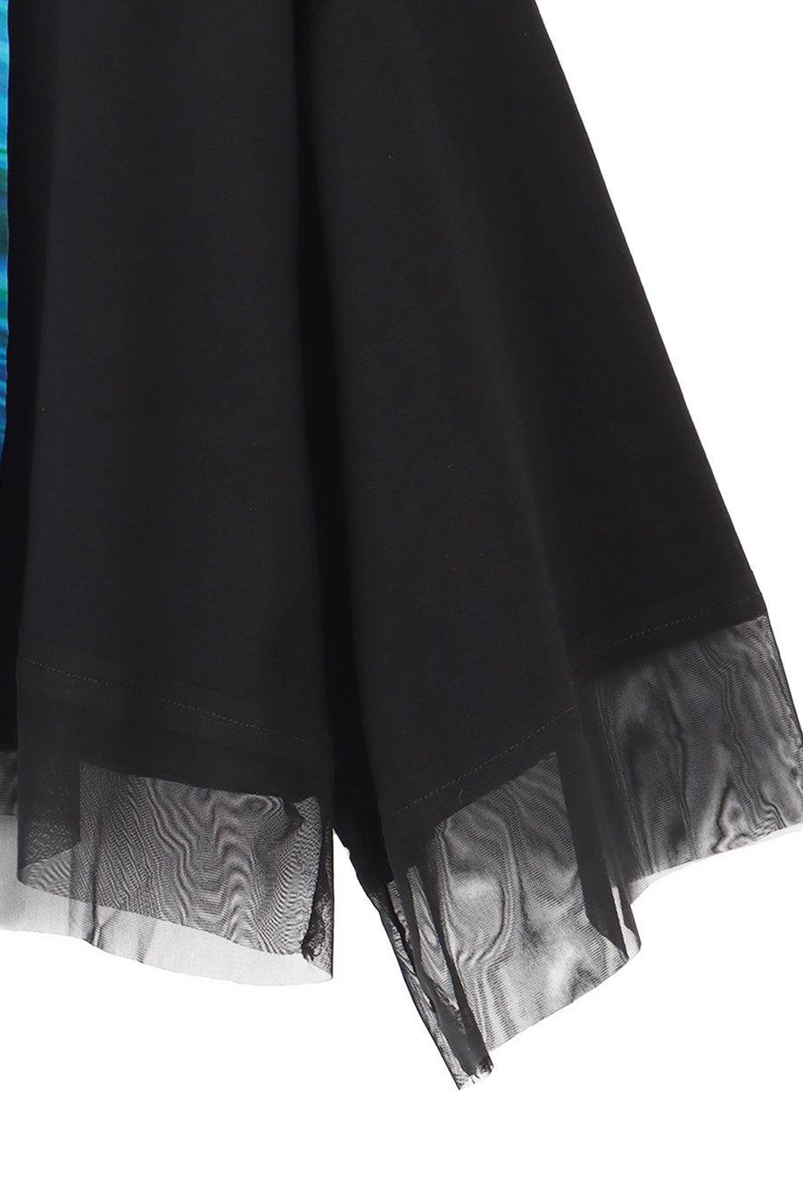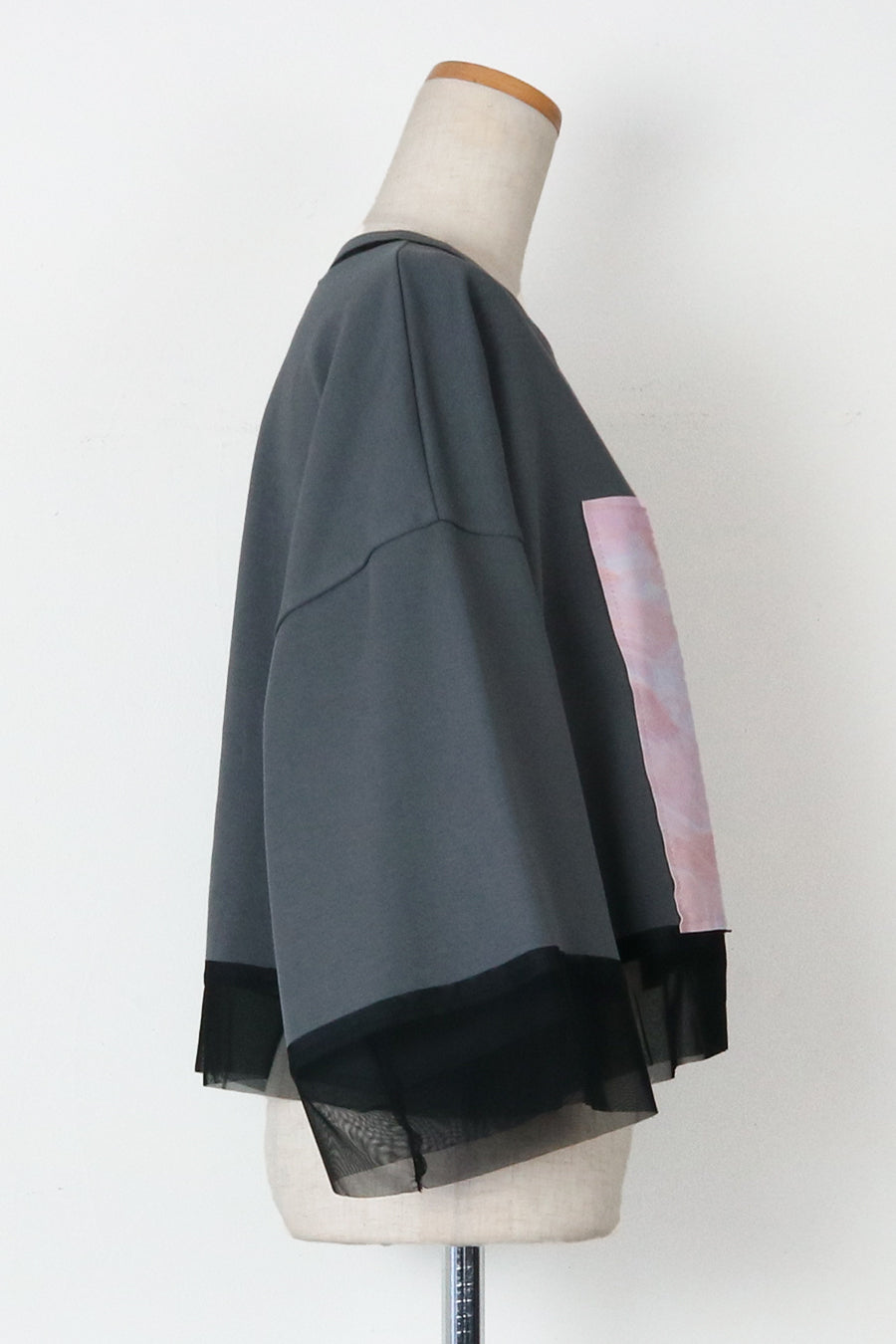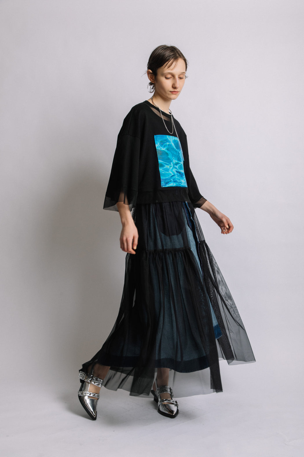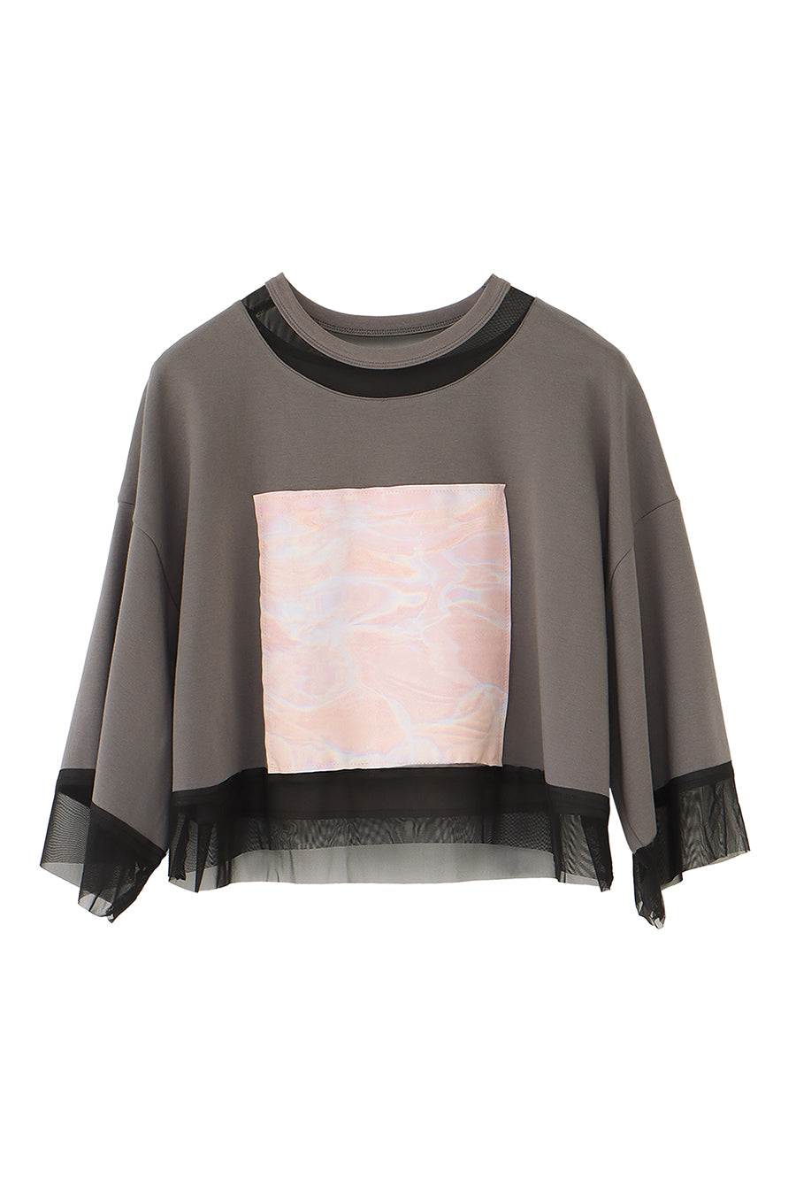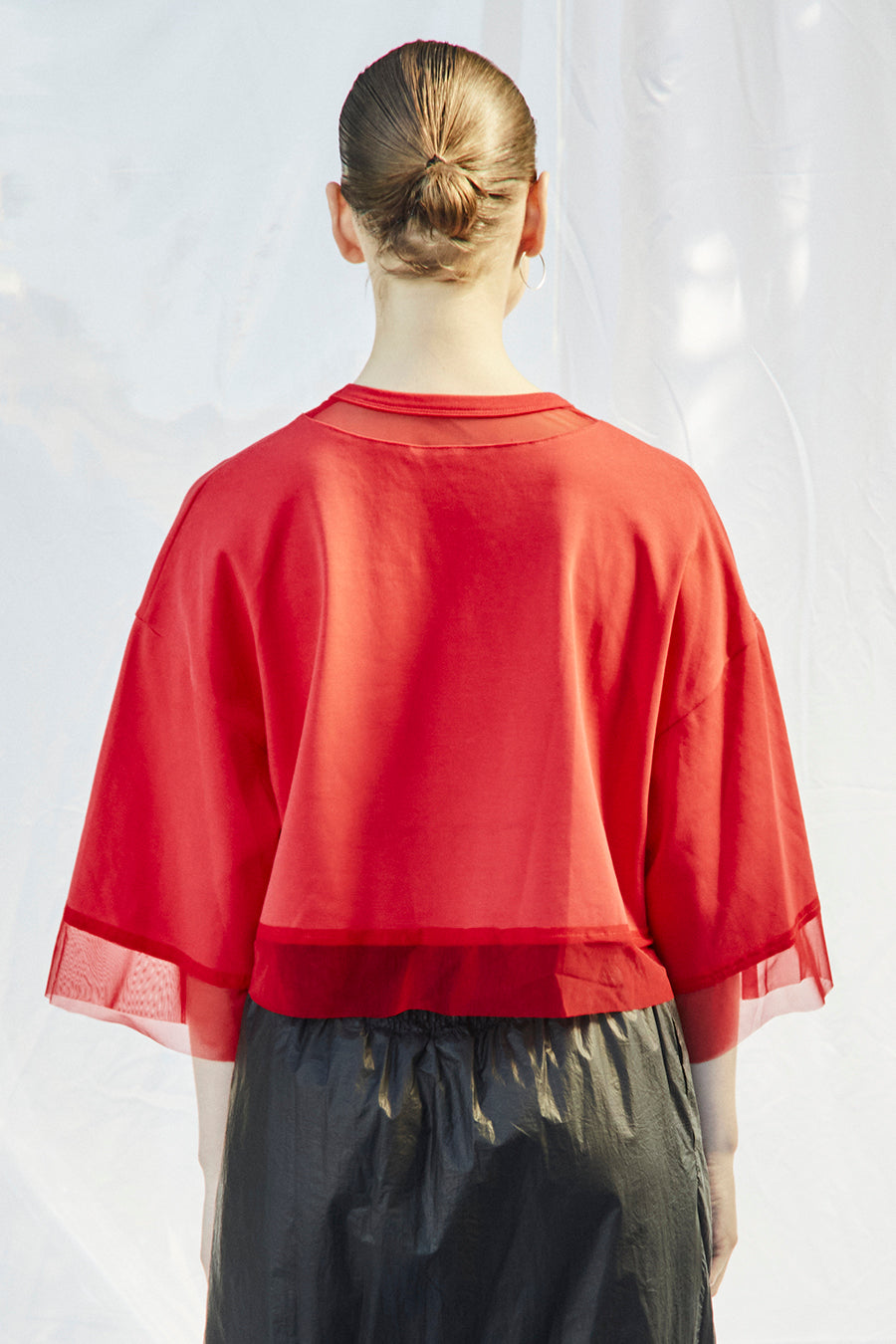 身頃は透けないコットンスムースを使用し、襟ぐり、袖口、裾は異素材チュールで切り替えた春夏らしい軽やかで涼しげなデザイン。