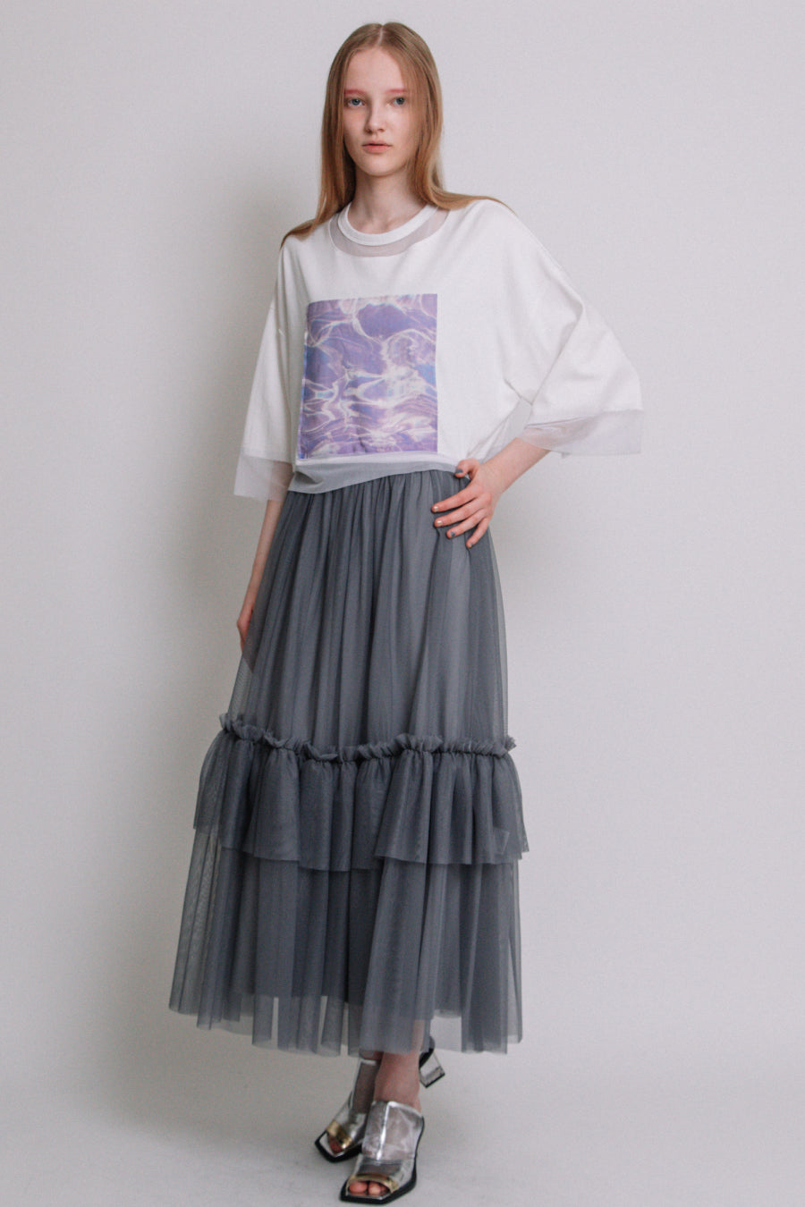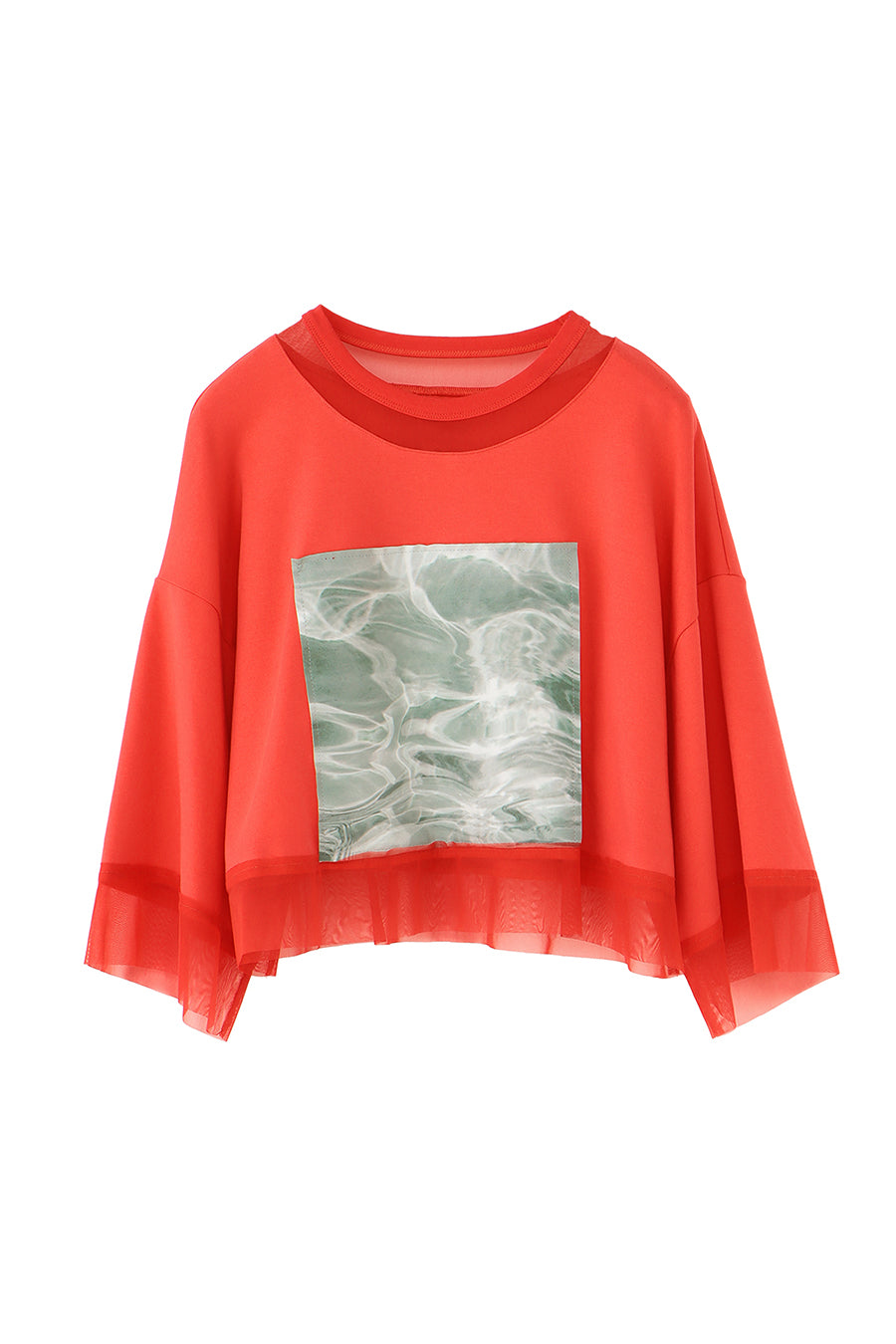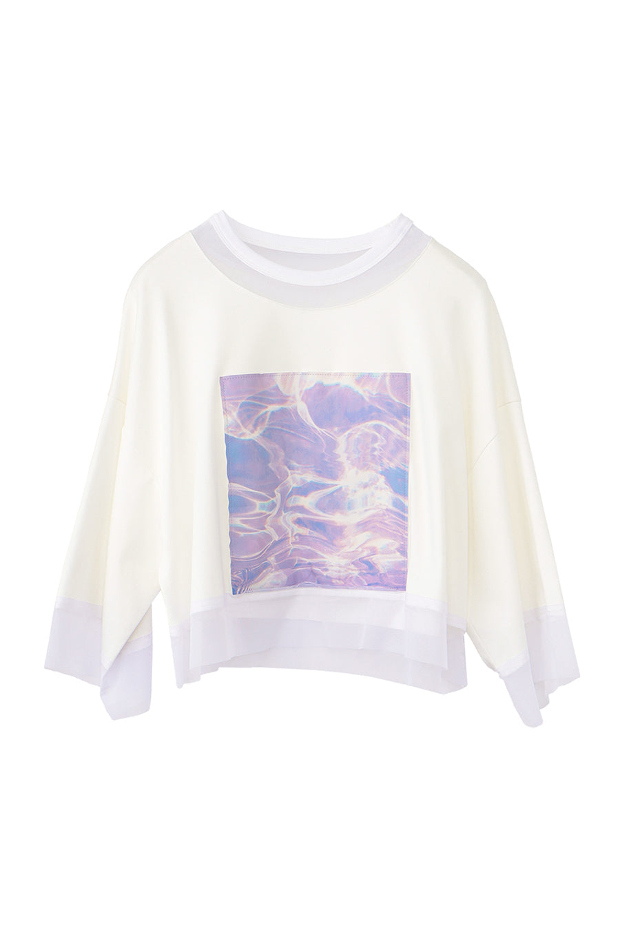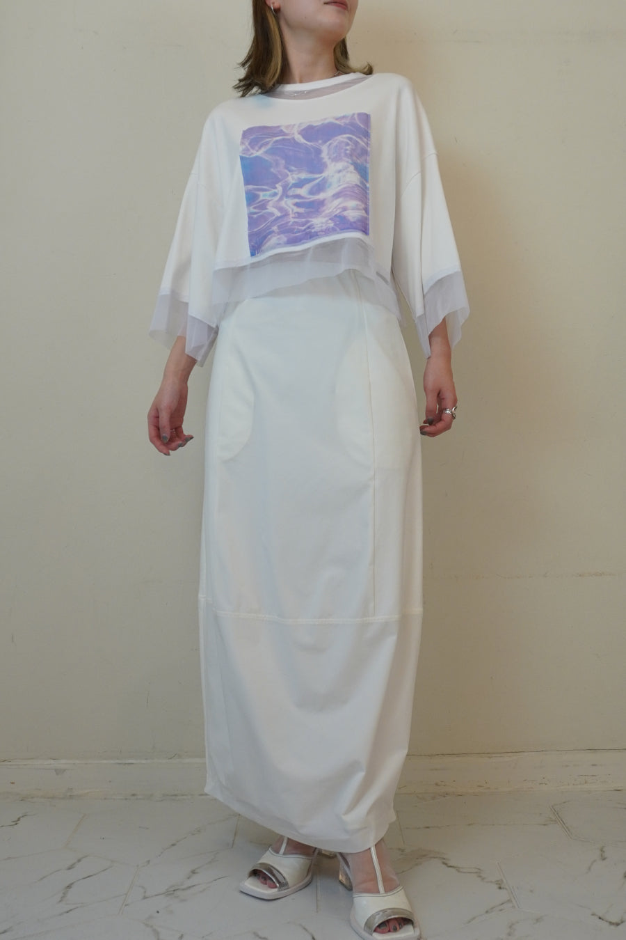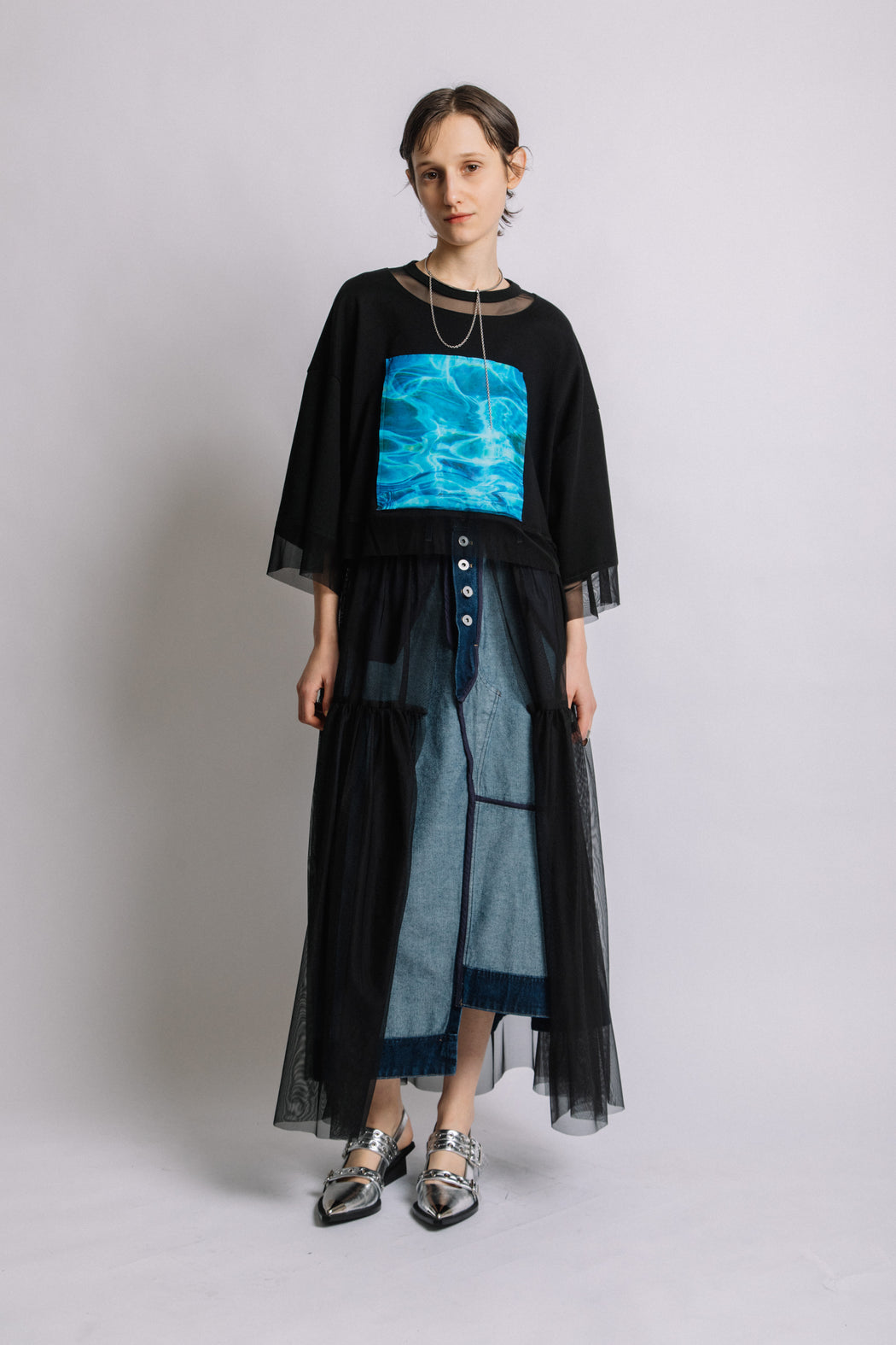 身頃は透けないコットンスムースを使用し、襟ぐり、袖口、裾は異素材チュールで切り替えた春夏らしい軽やかで涼しげなデザイン。