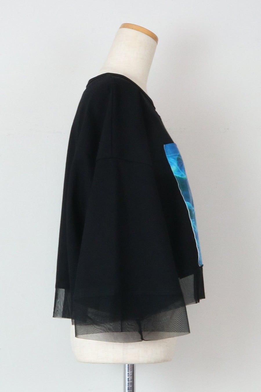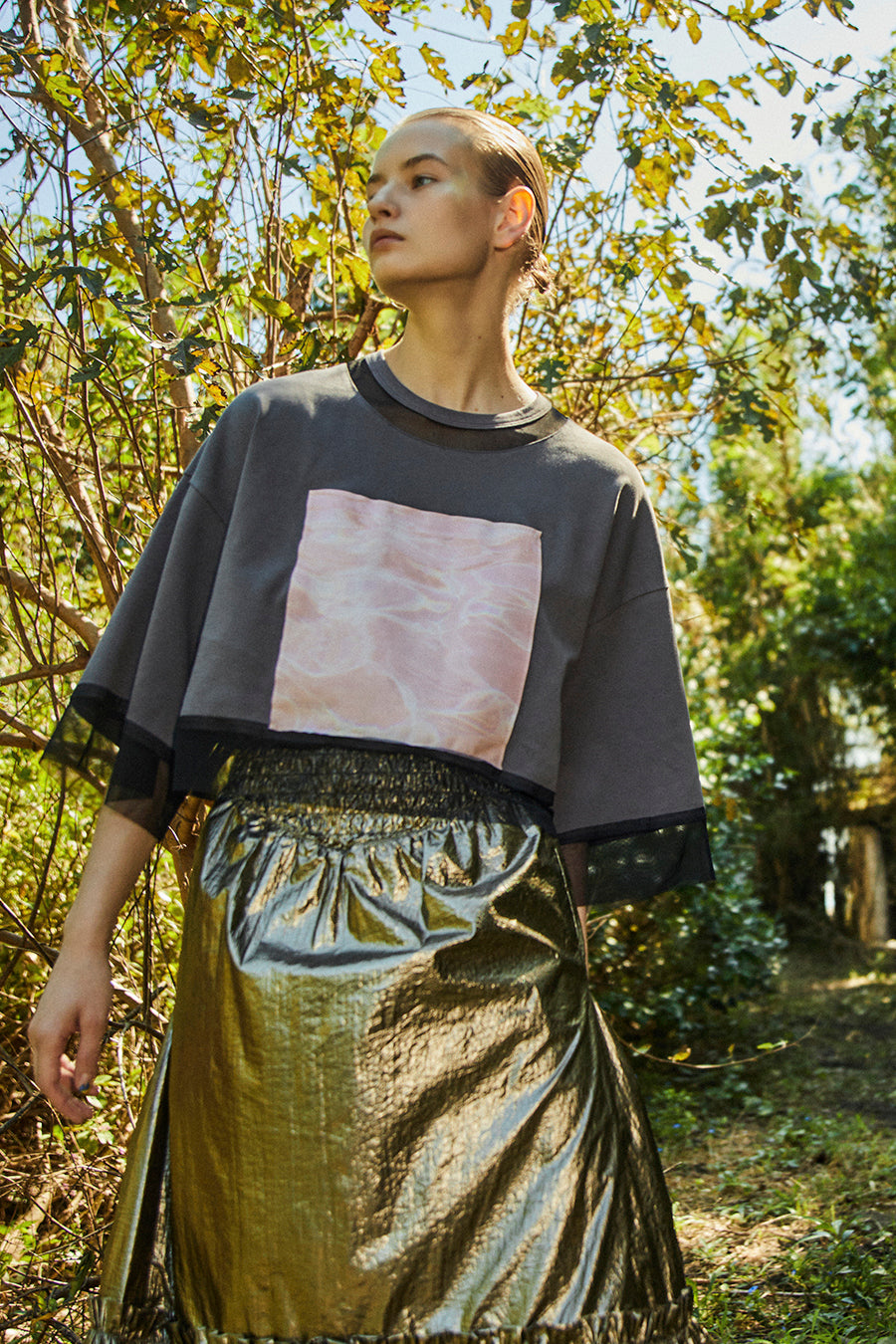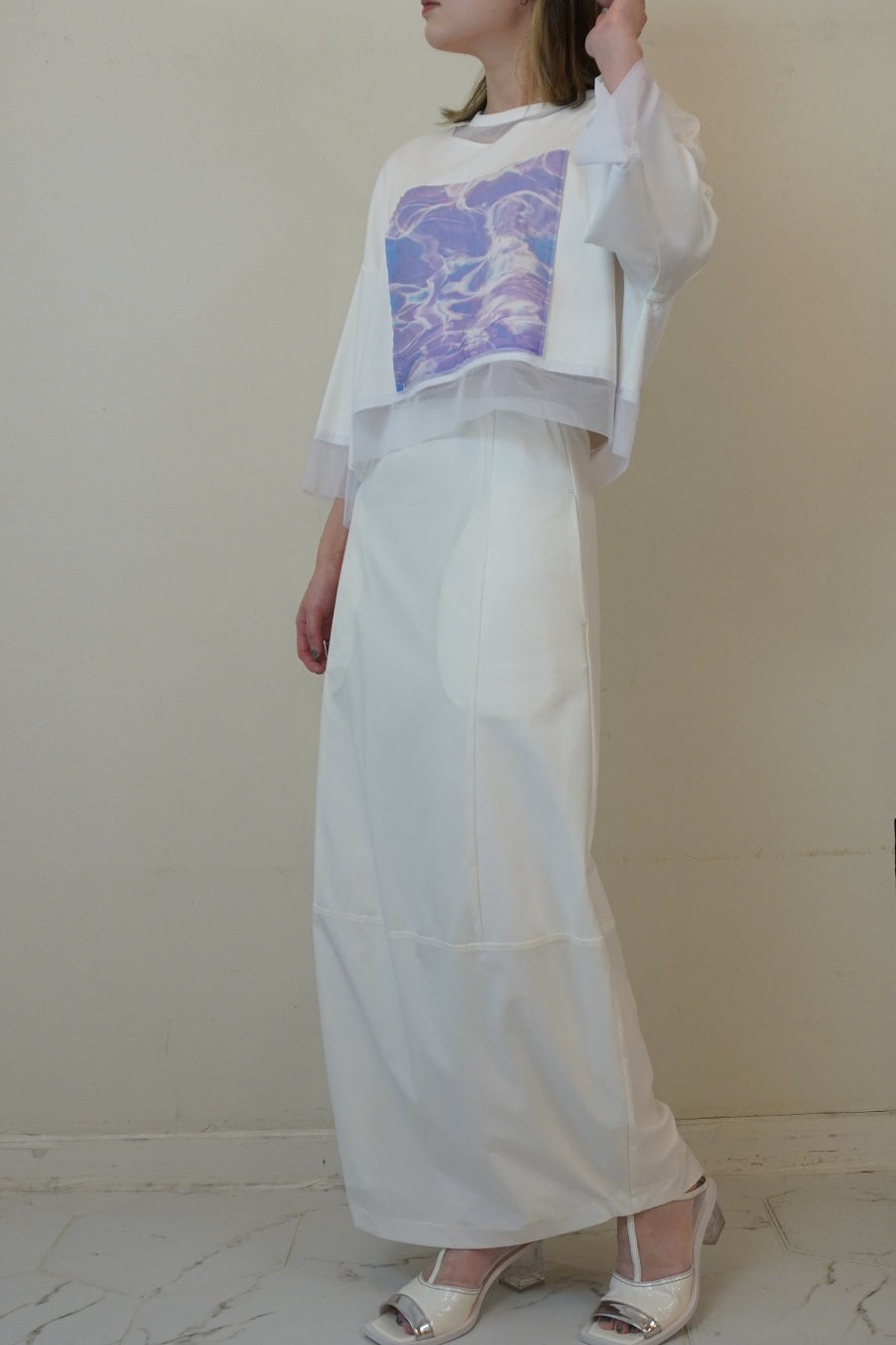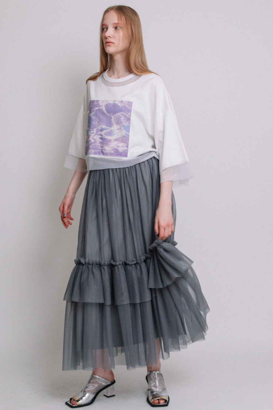 身頃は透けないコットンスムースを使用し、襟ぐり、袖口、裾は異素材チュールで切り替えた春夏らしい軽やかで涼しげなデザイン。