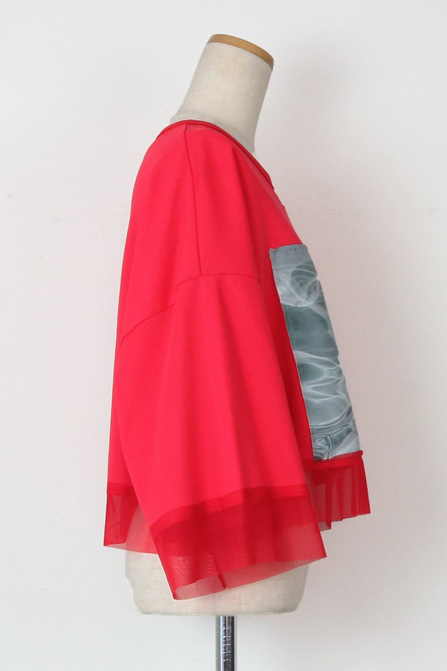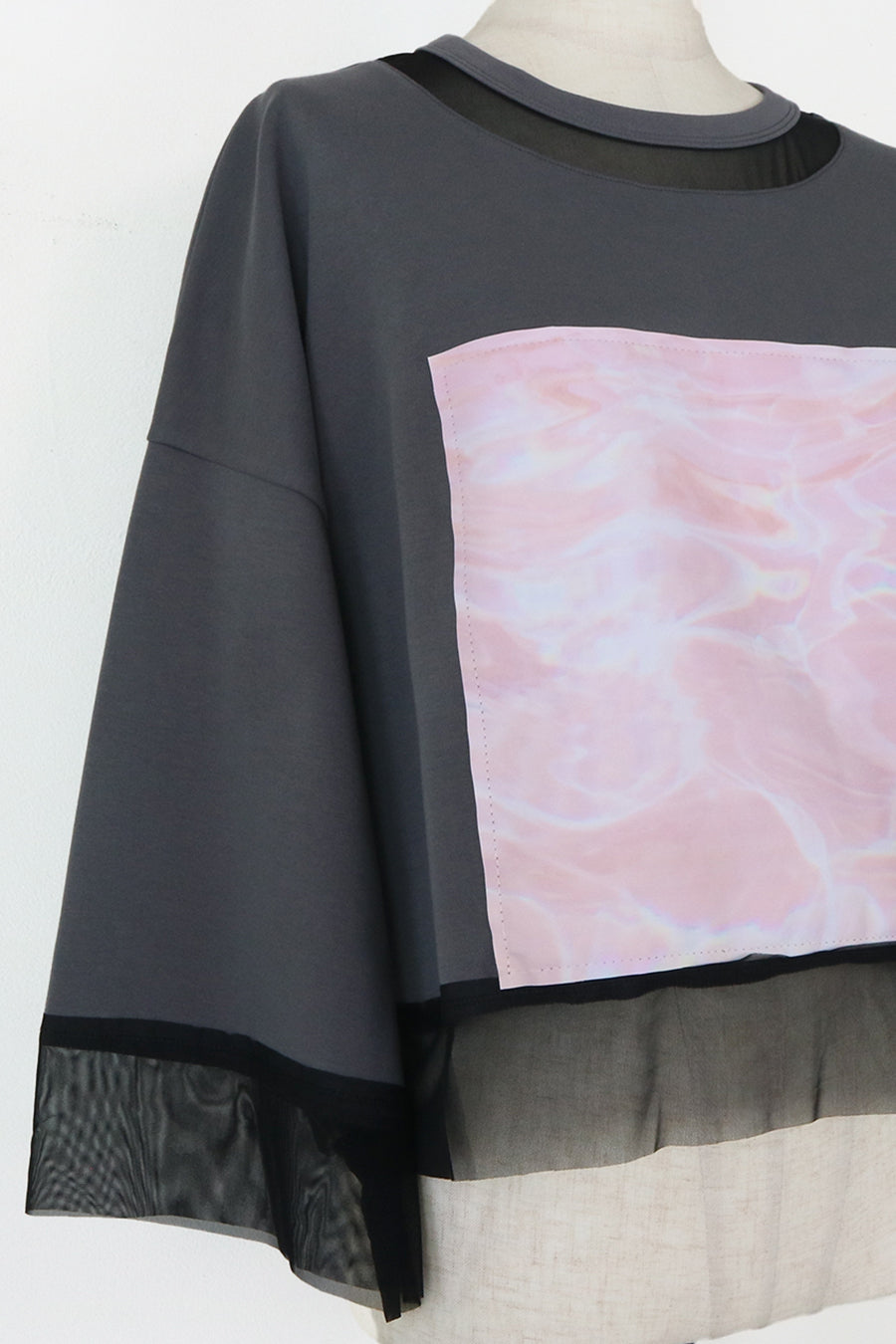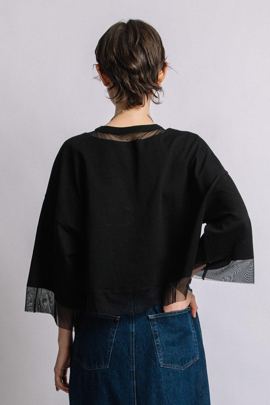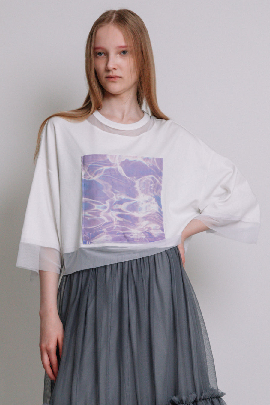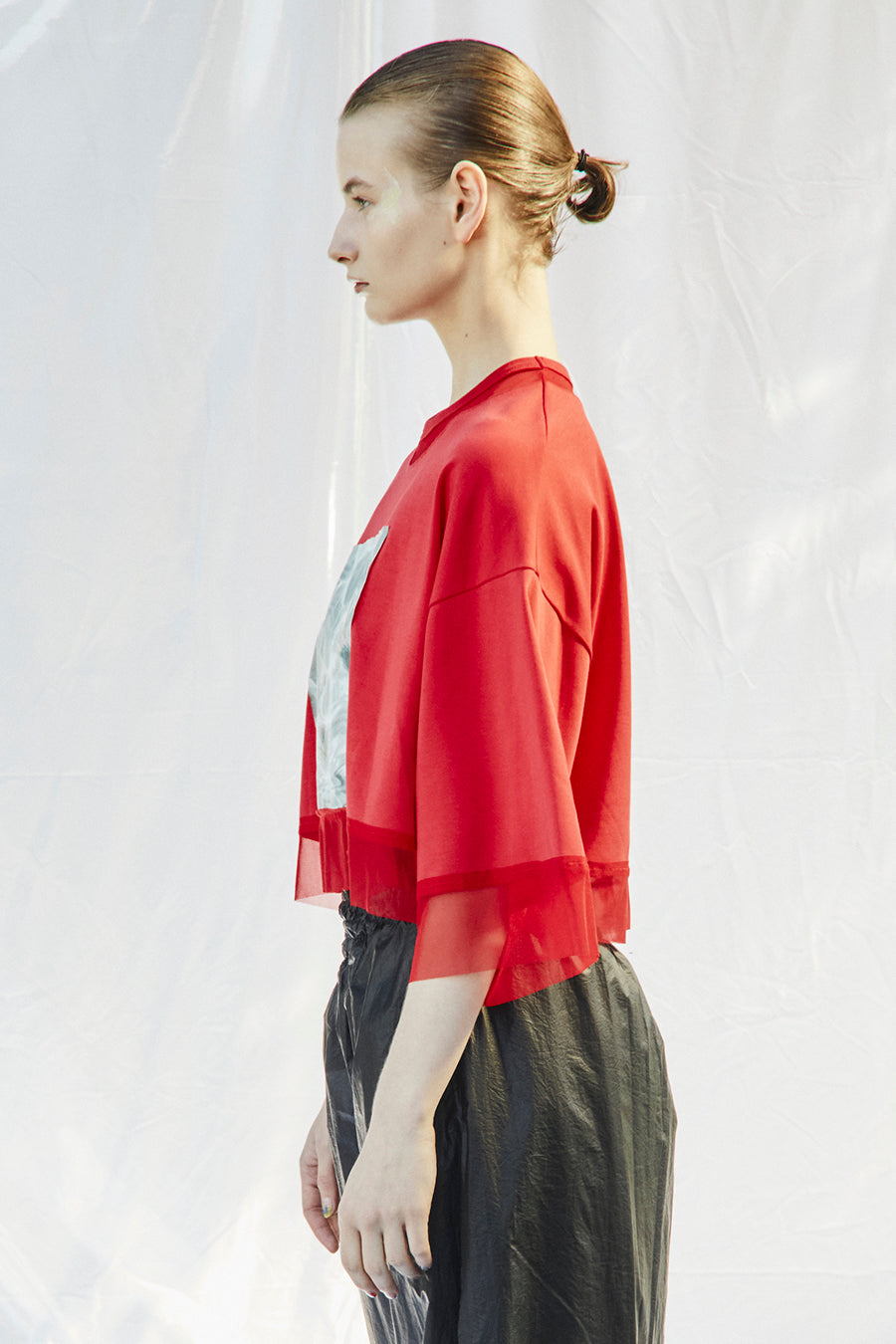 身頃は透けないコットンスムースを使用し、襟ぐり、袖口、裾は異素材チュールで切り替えた春夏らしい軽やかで涼しげなデザイン。