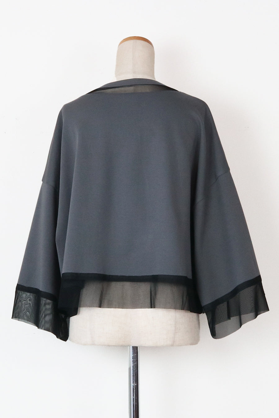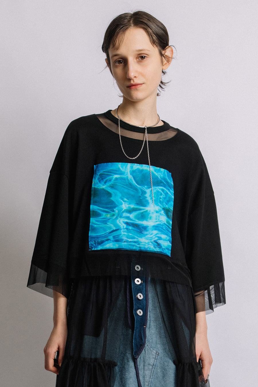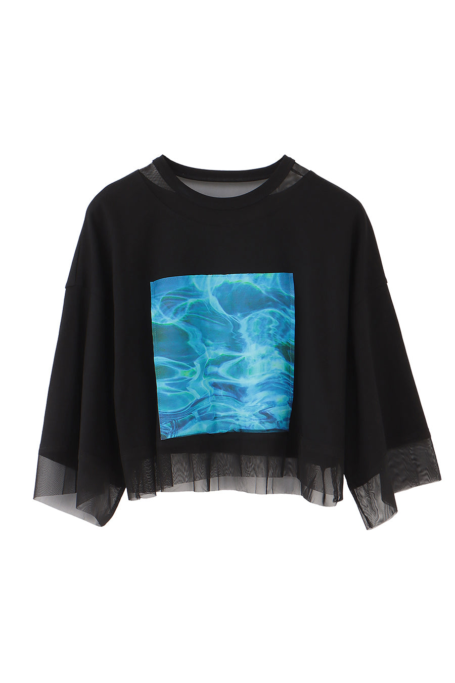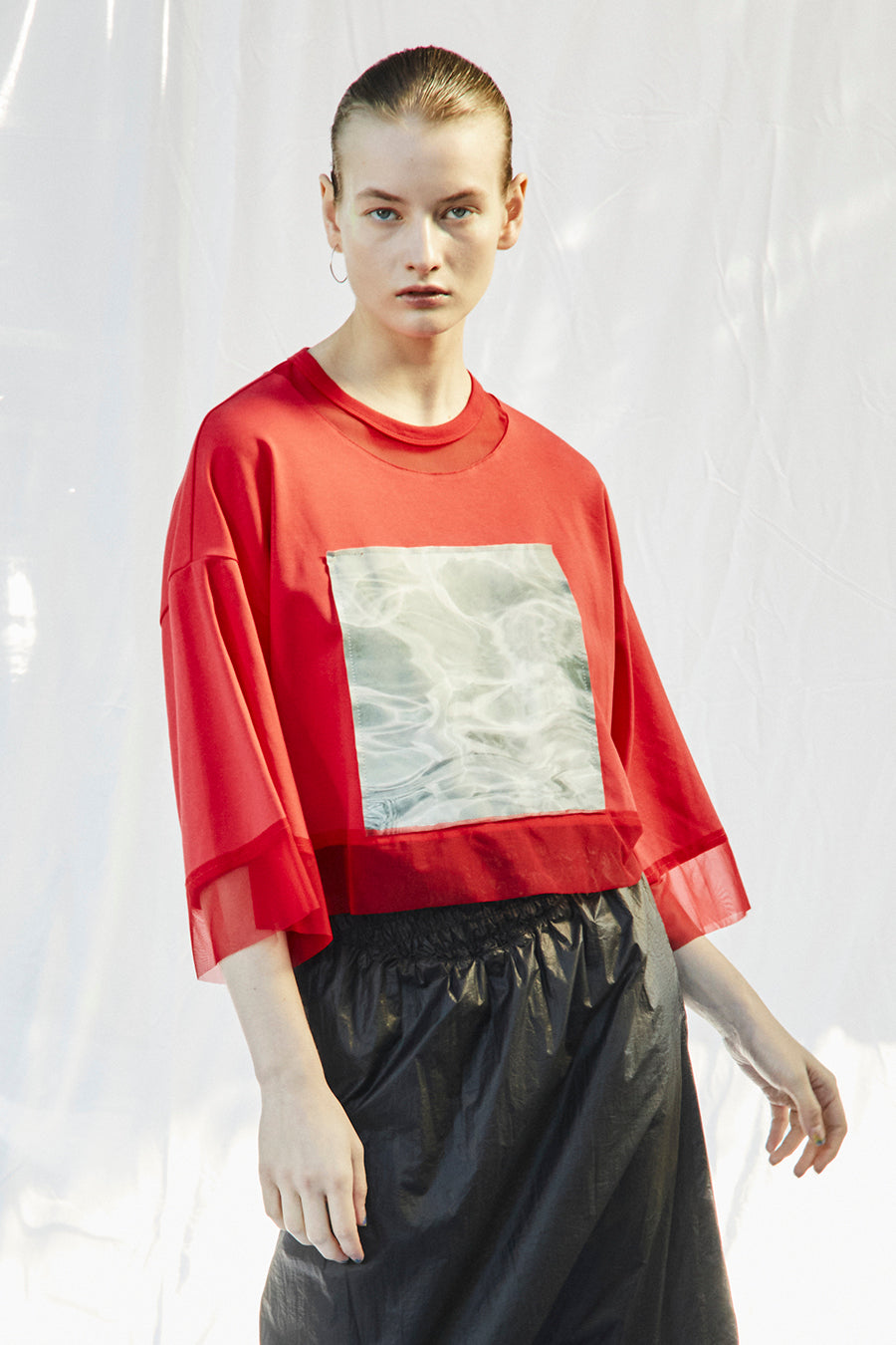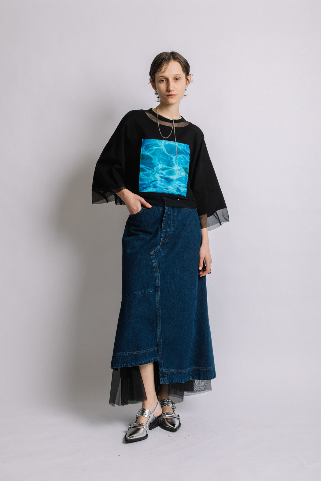 身頃は透けないコットンスムースを使用し、襟ぐり、袖口、裾は異素材チュールで切り替えた春夏らしい軽やかで涼しげなデザイン。