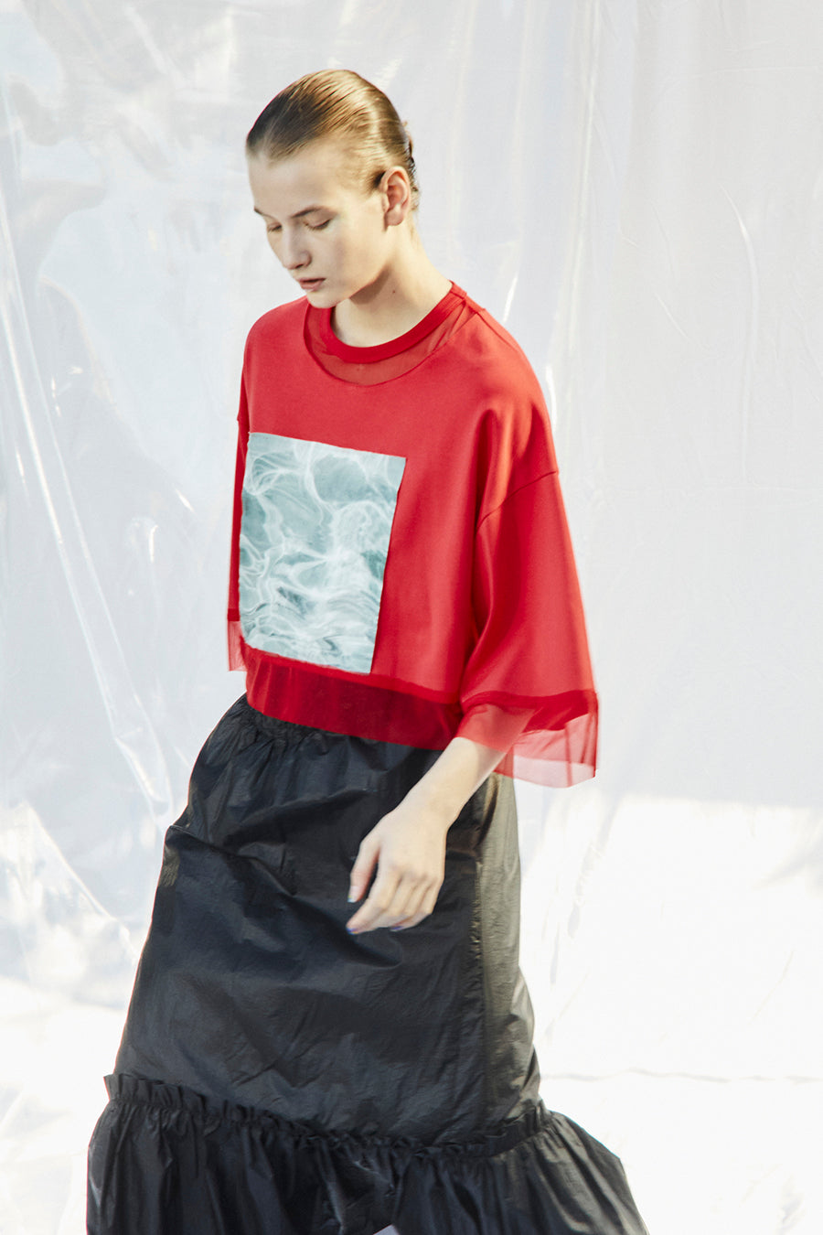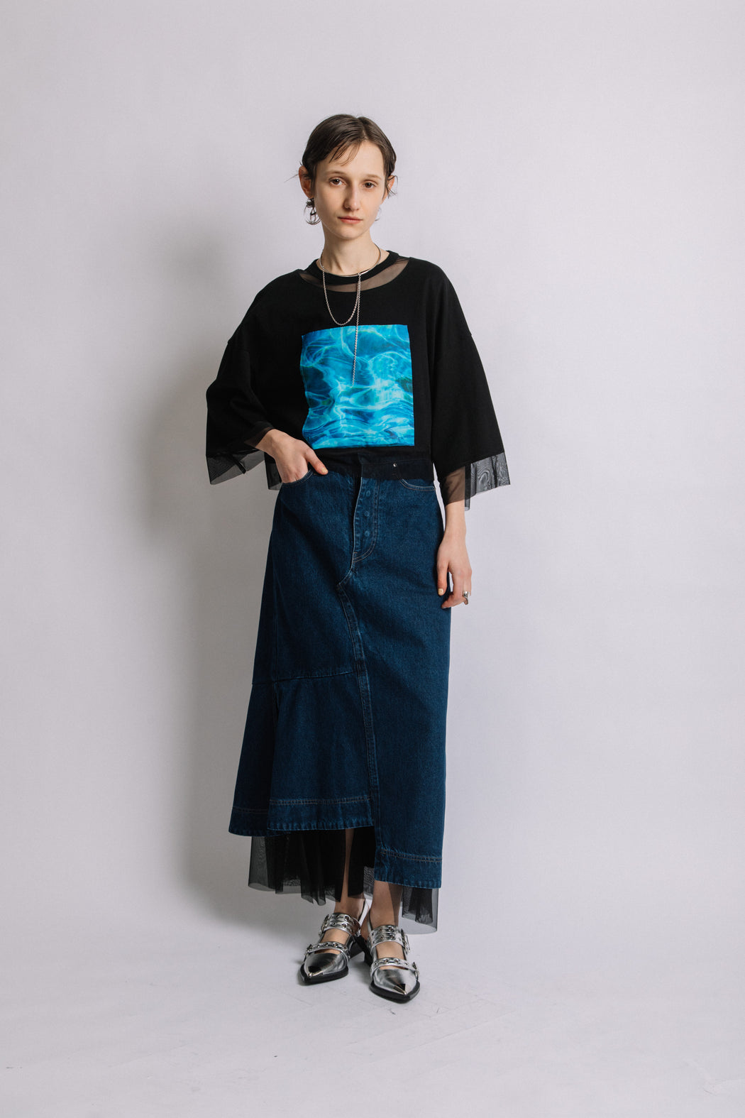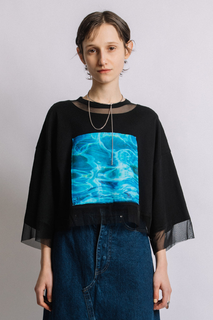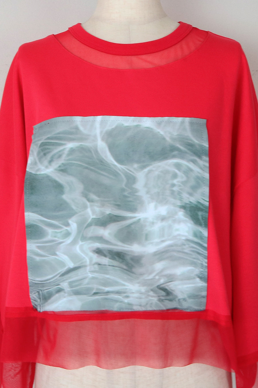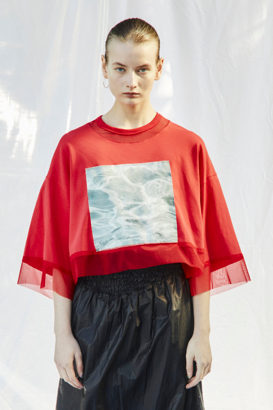 身頃は透けないコットンスムースを使用し、襟ぐり、袖口、裾は異素材チュールで切り替えた春夏らしい軽やかで涼しげなデザイン。