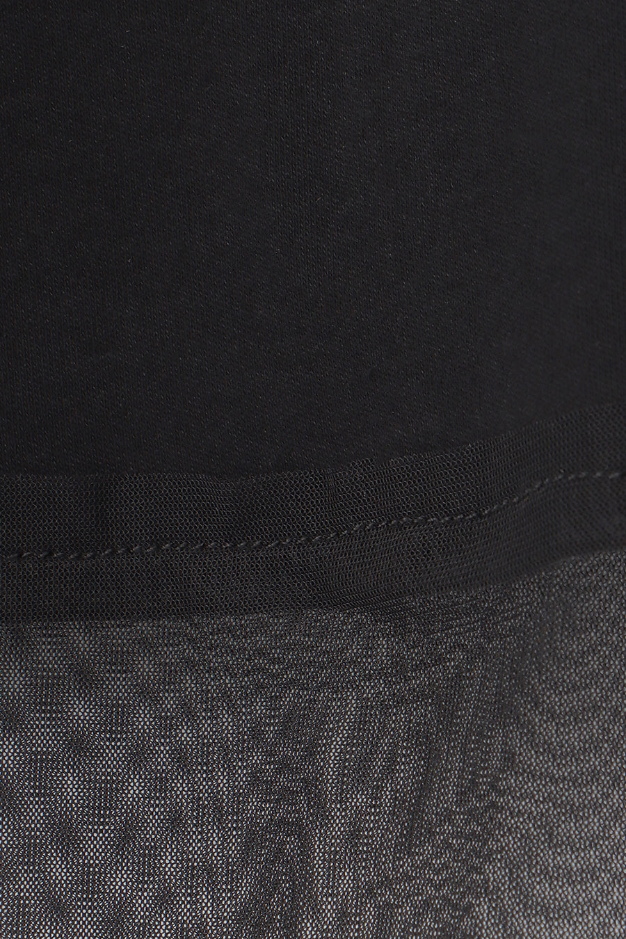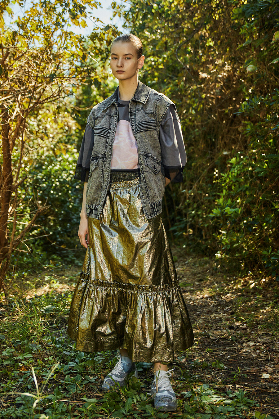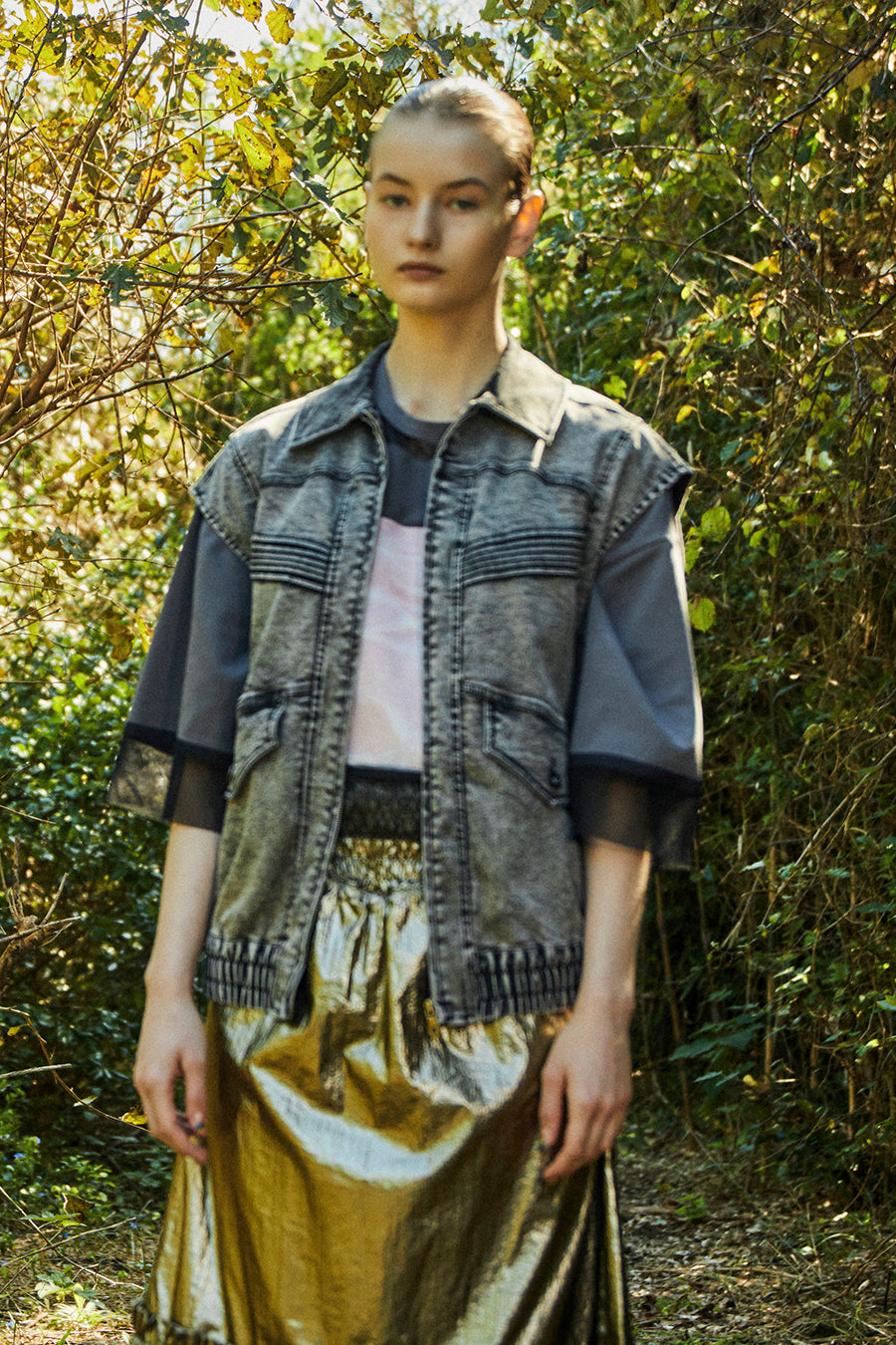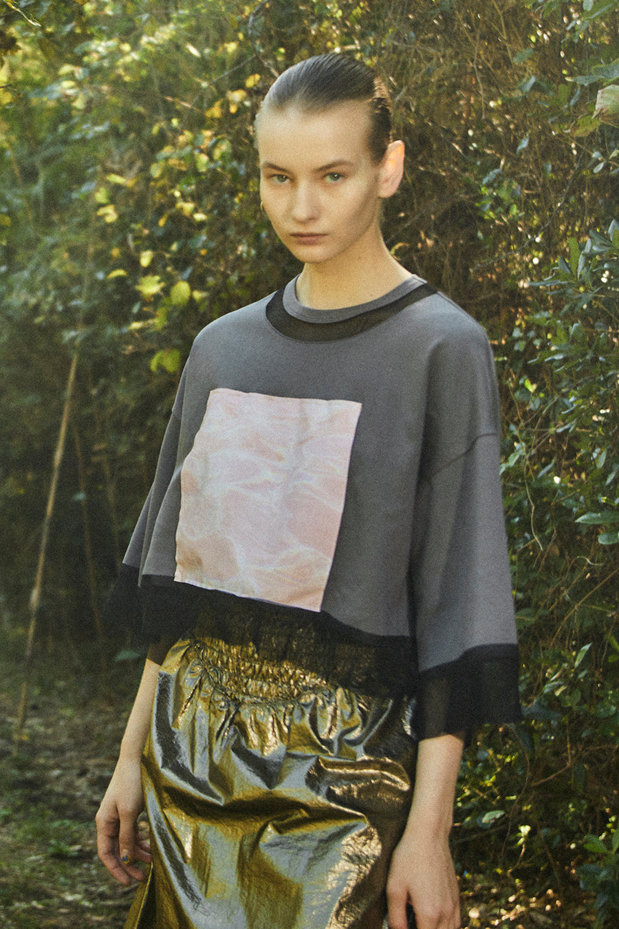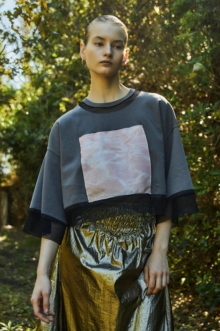 身頃は透けないコットンスムースを使用し、襟ぐり、袖口、裾は異素材チュールで切り替えた春夏らしい軽やかで涼しげなデザイン。