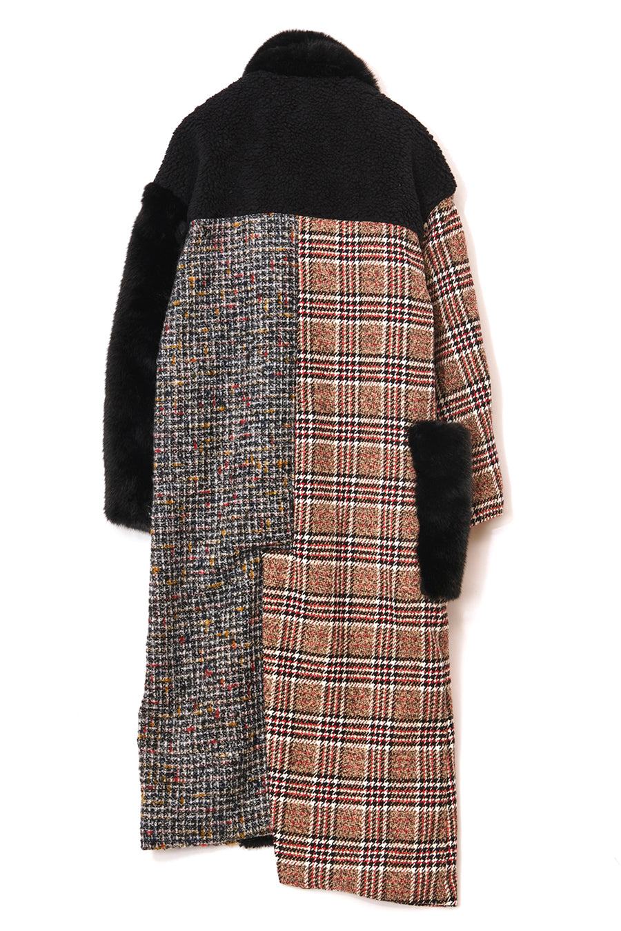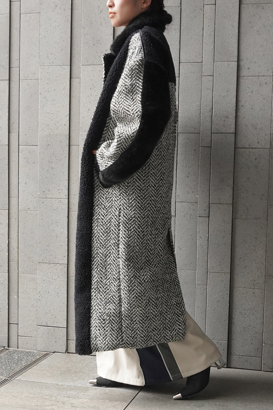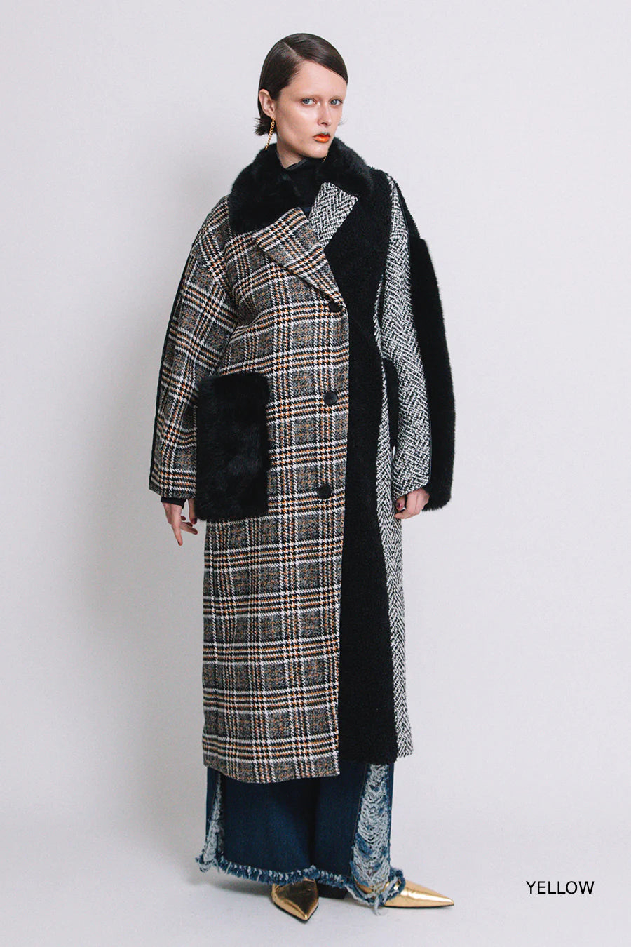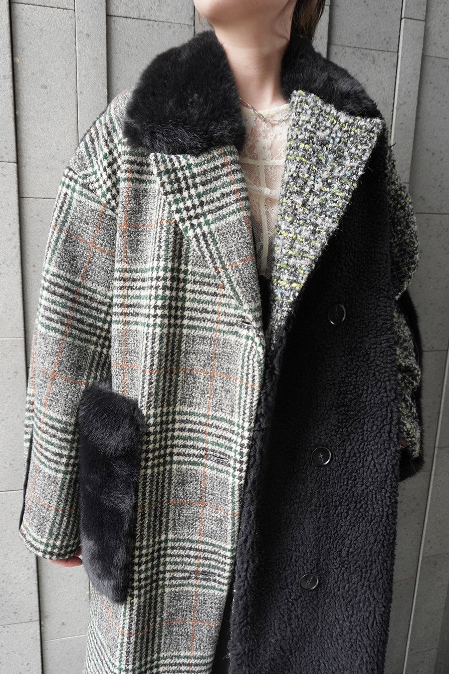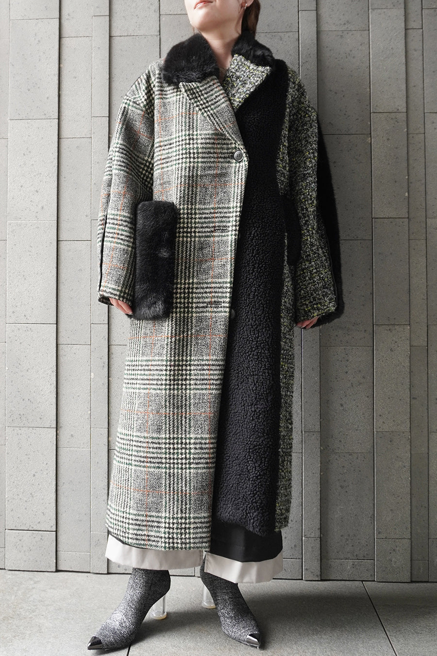ツイードチェック、ヘリンボーンツイード、シャギー、ロービングなどと、異素材のエコファーやボアの4素材をコンビネーションしたロングコート。