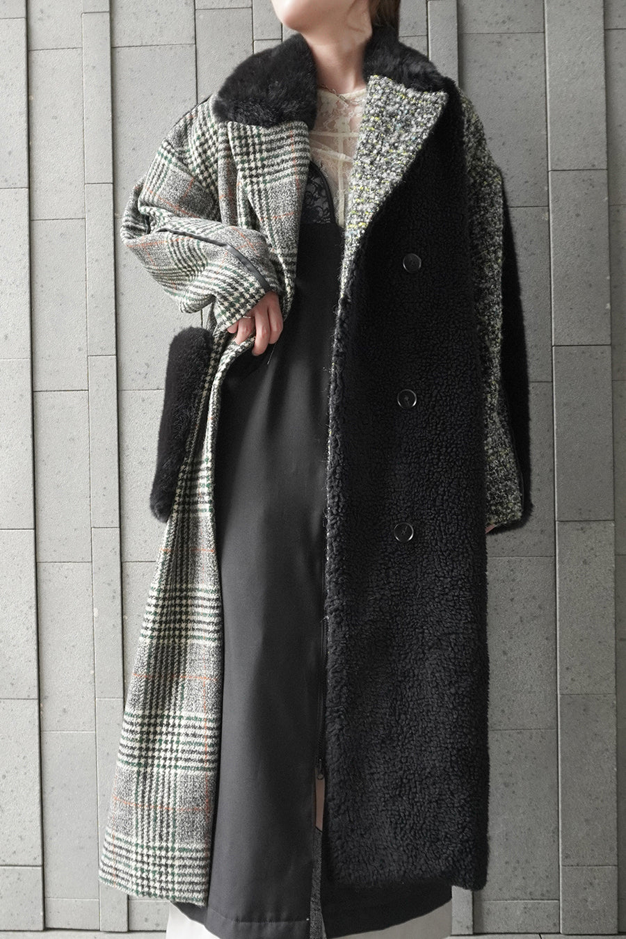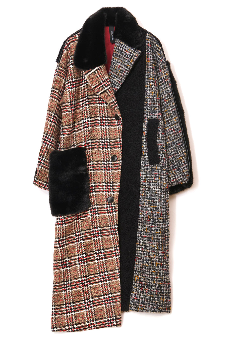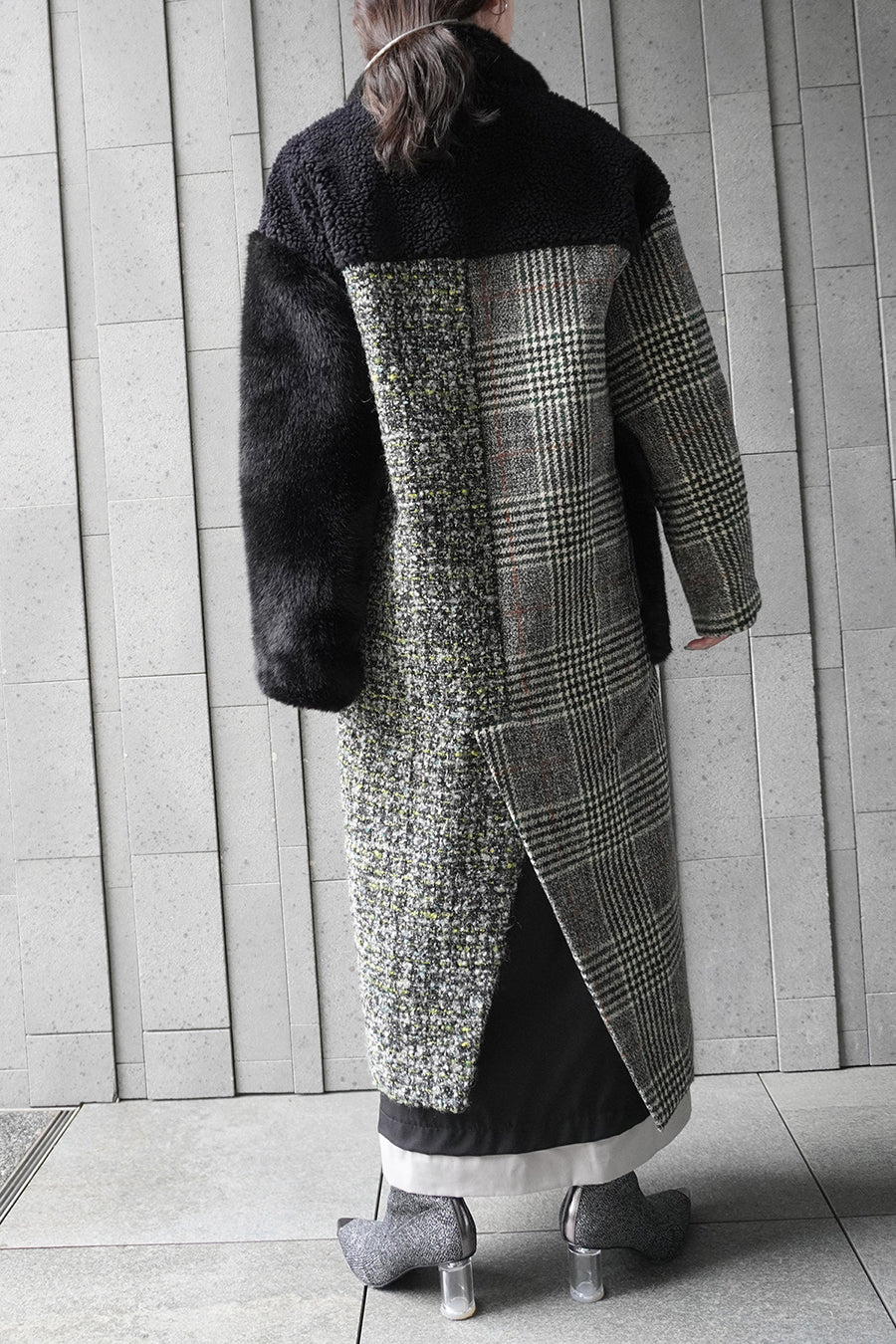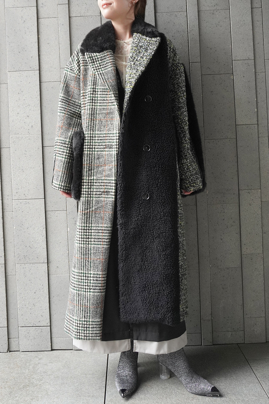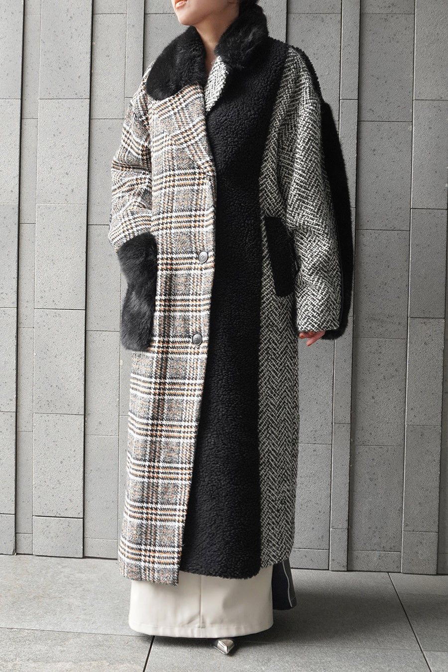 ツイードチェック、ヘリンボーンツイード、シャギー、ロービングなどと、異素材のエコファーやボアの4素材をコンビネーションしたロングコート。