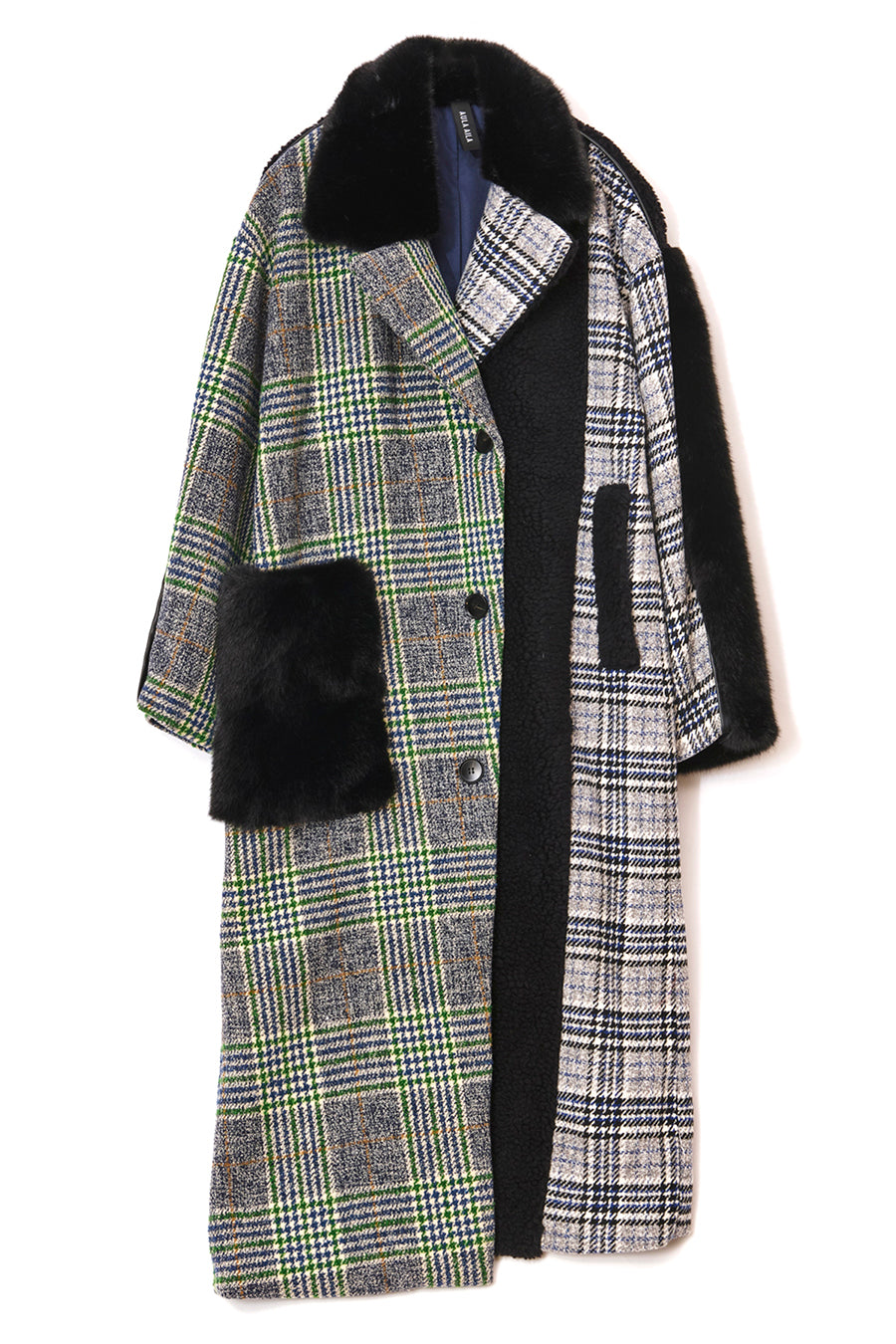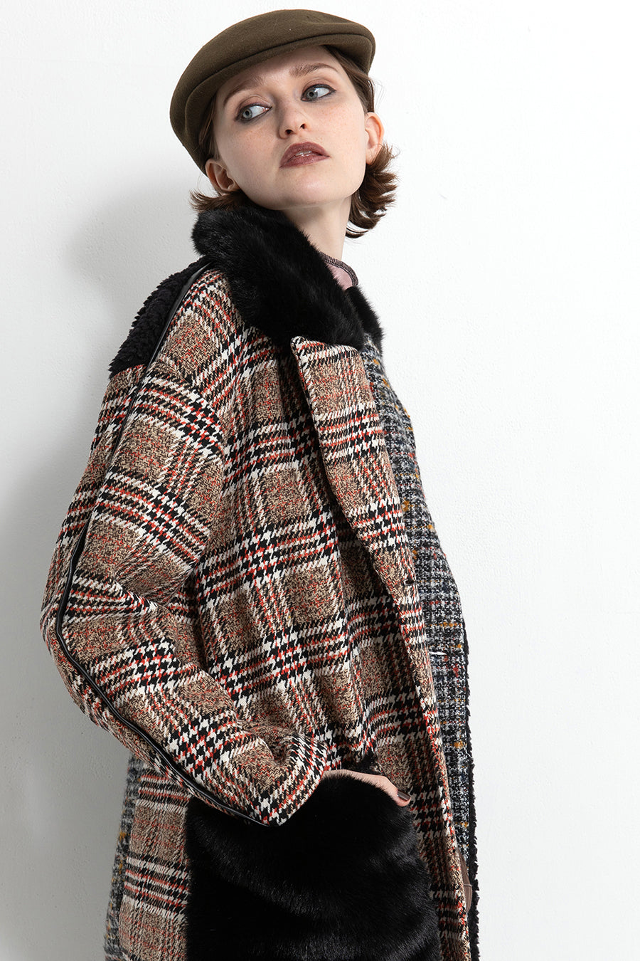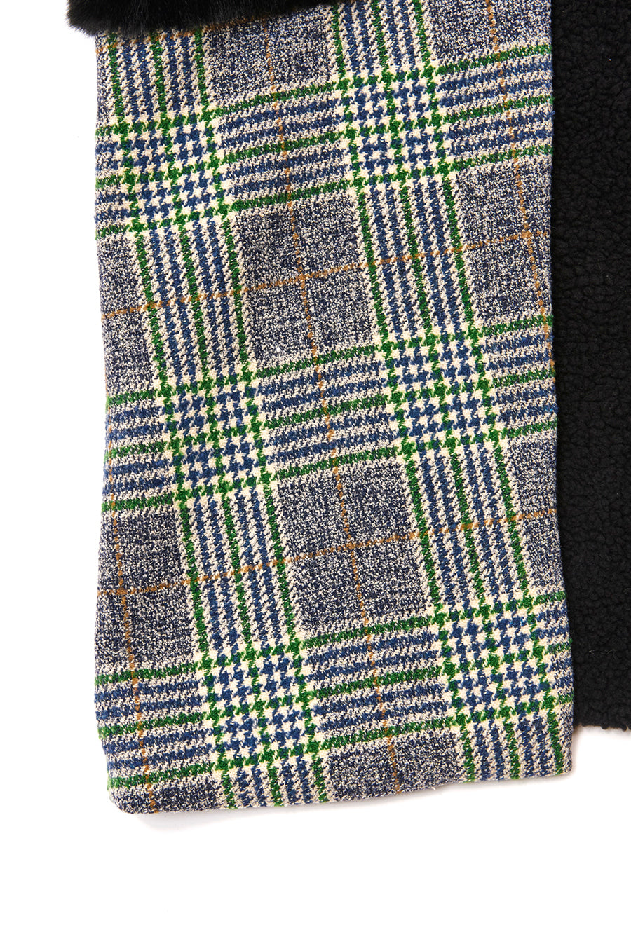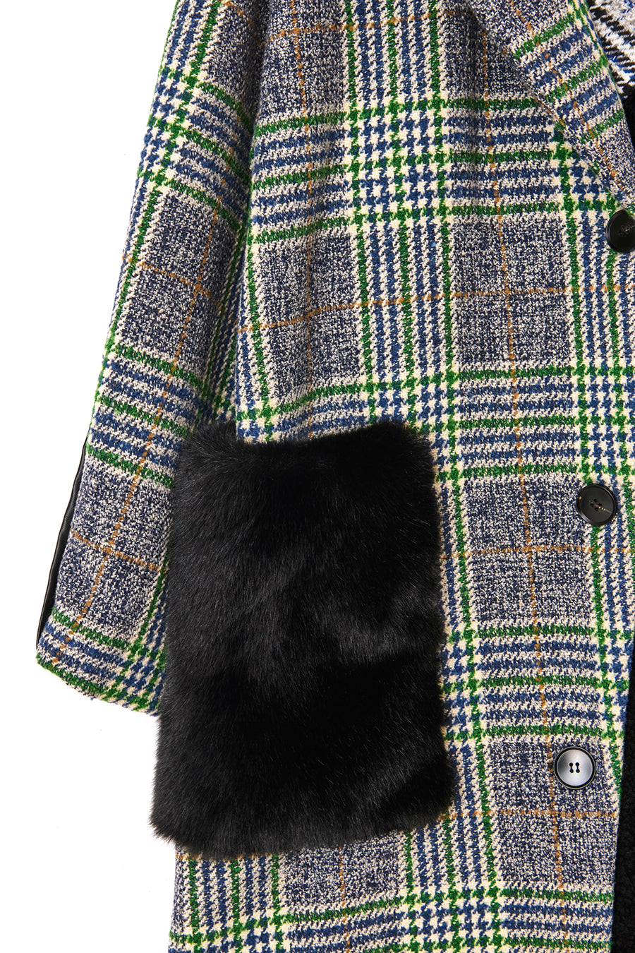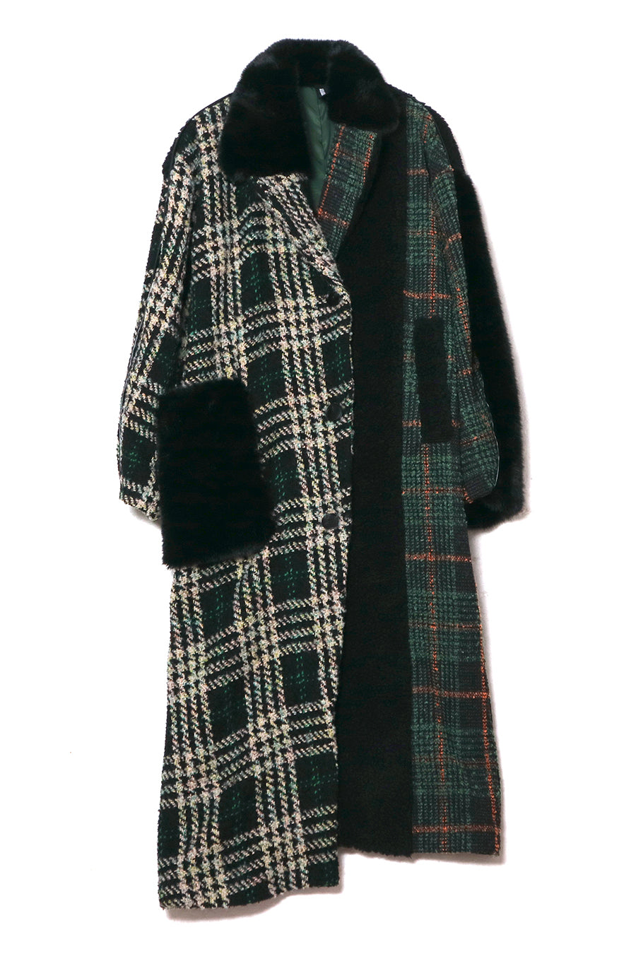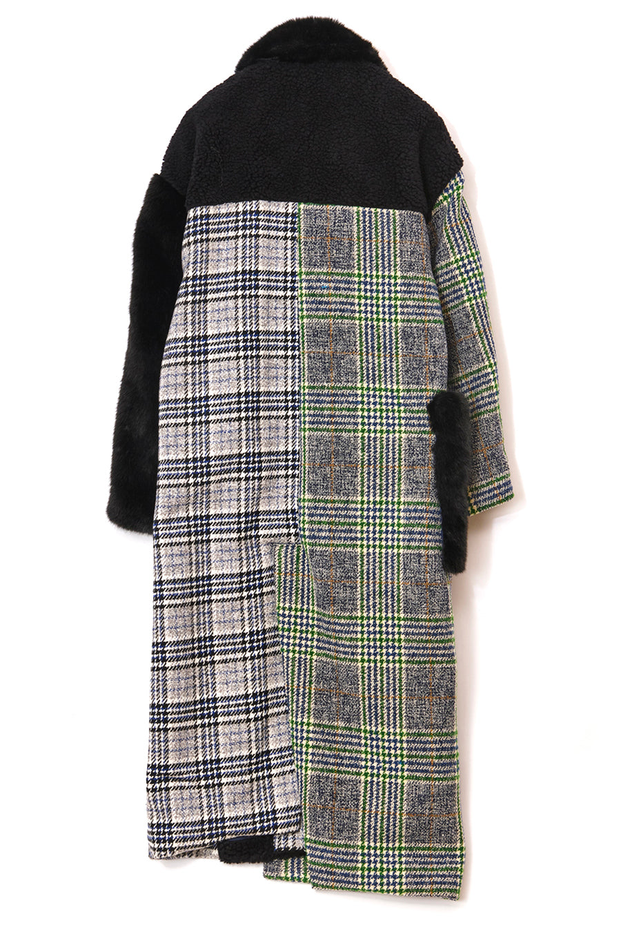 ツイードチェック、ヘリンボーンツイード、シャギー、ロービングなどと、異素材のエコファーやボアの4素材をコンビネーションしたロングコート。